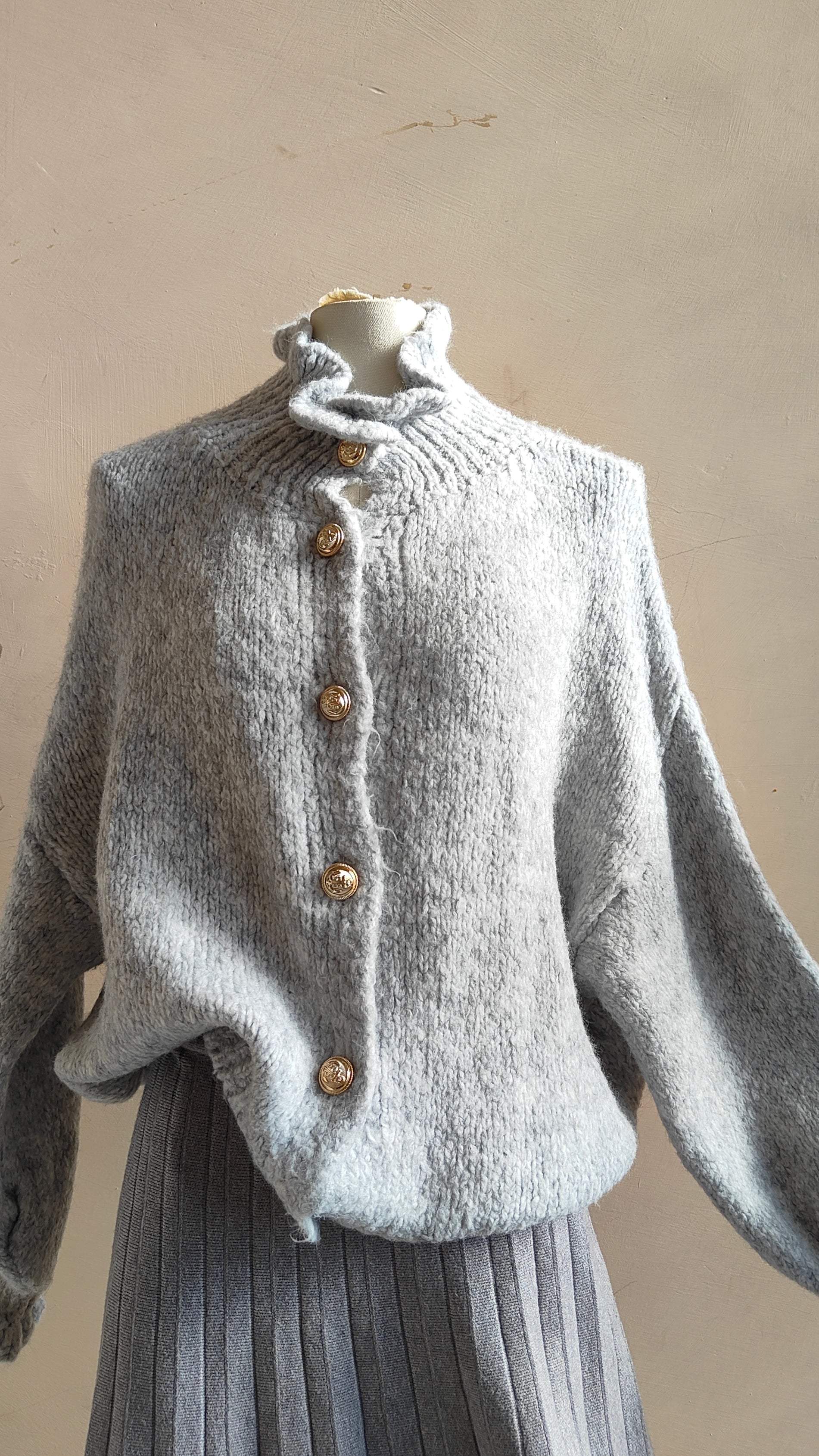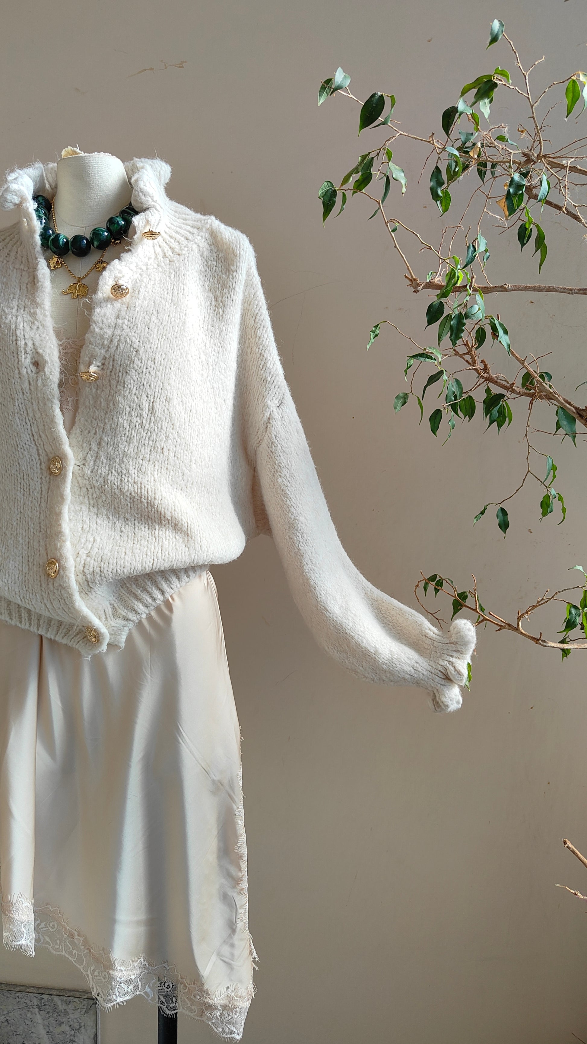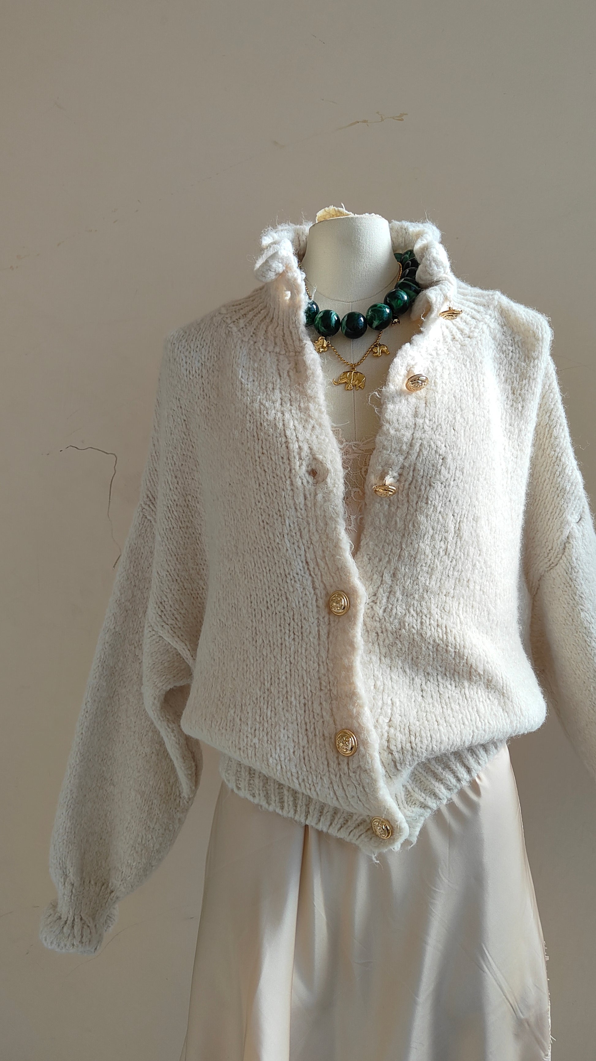 Cardigan dal fascino romantico, impreziosito da un delicato collo arricciato e maniche con lieve effetto rouge. I bottoni gioiello donano un tocco sofisticato, rendendolo un capo speciale da indossare ogni giorno con naturale eleganza.