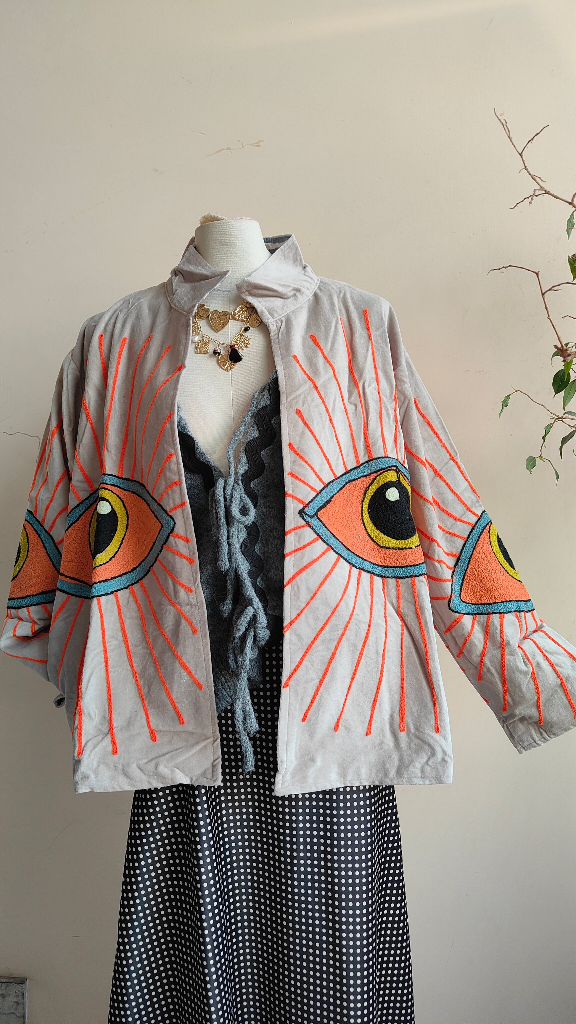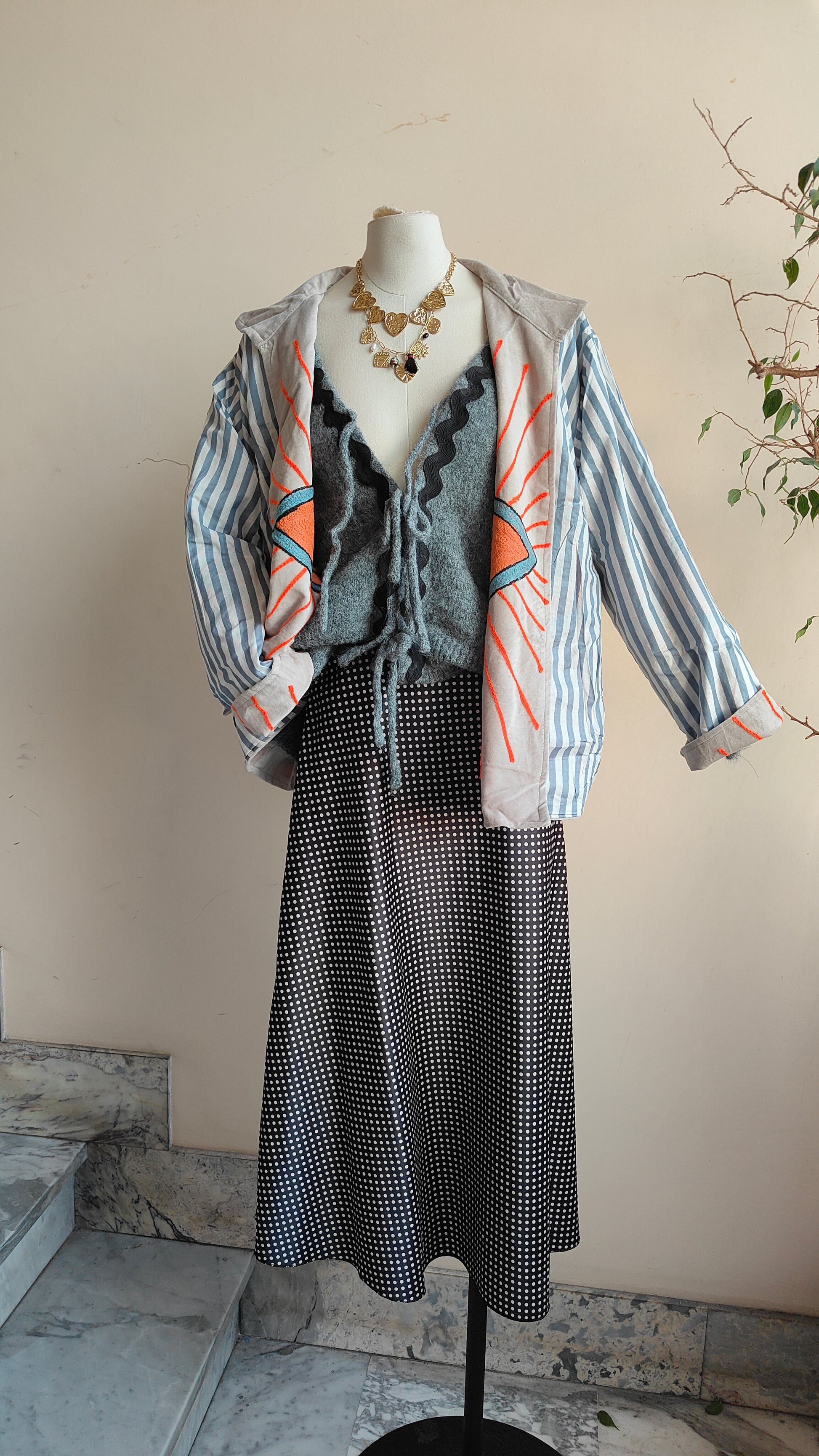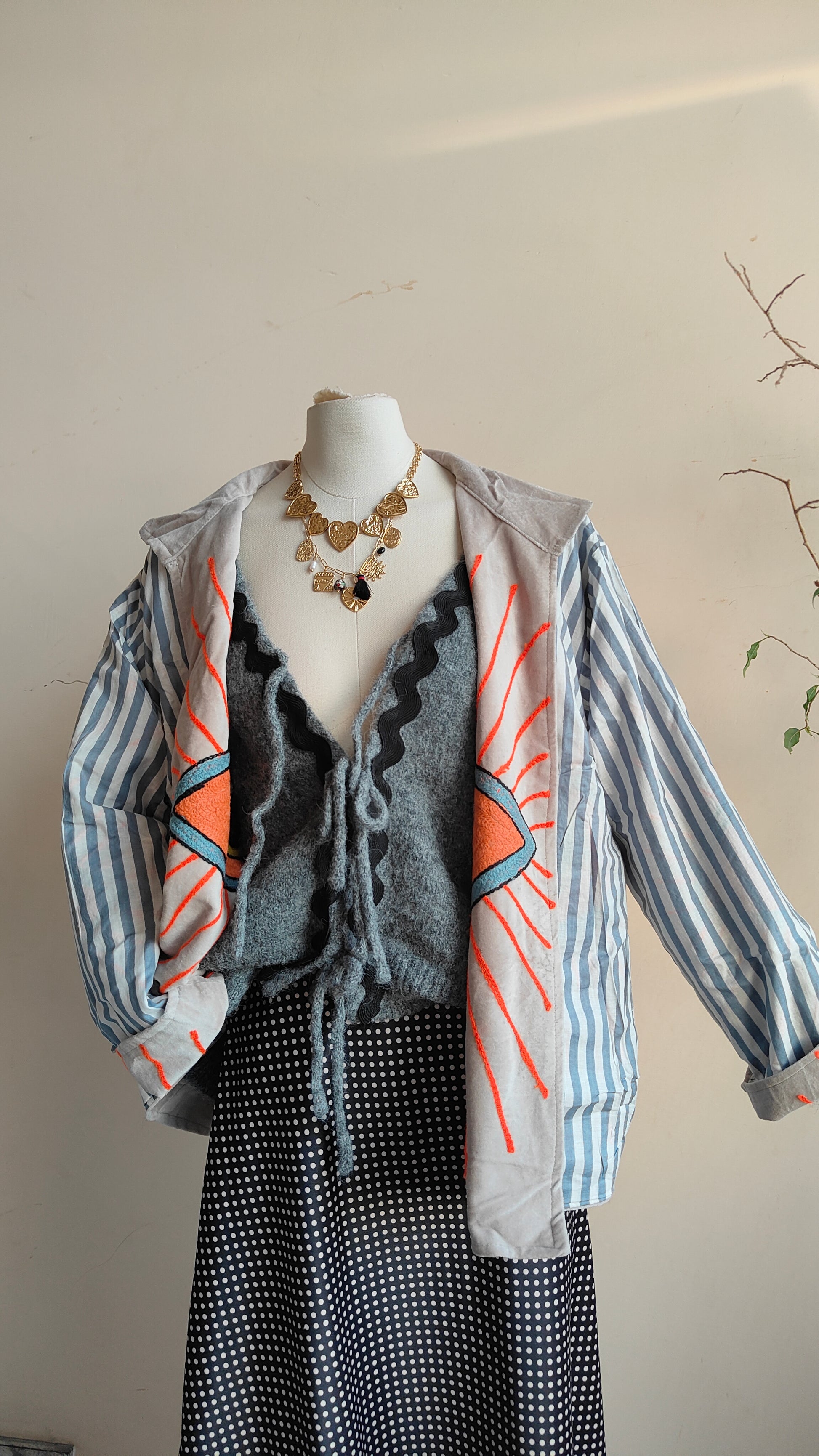 Giacca double face dal carattere boho e ricercato, pensata per dare personalità a ogni look. Da un lato presenta un ricco ricamo floreale con dettagli in rilievo, dall’altro una fantasia più essenziale e versatile, ideale per cambiare stile con un semplice gesto.