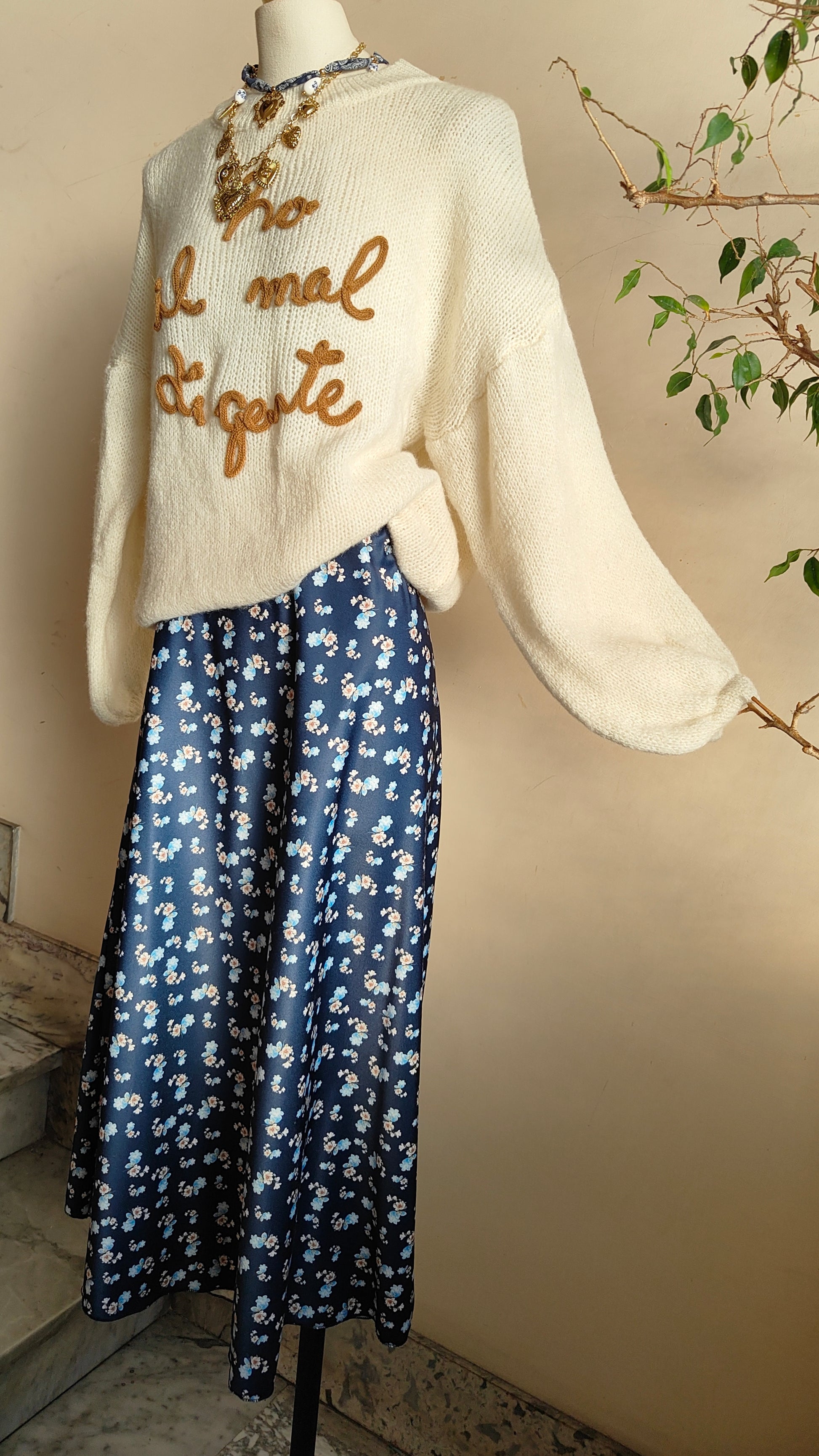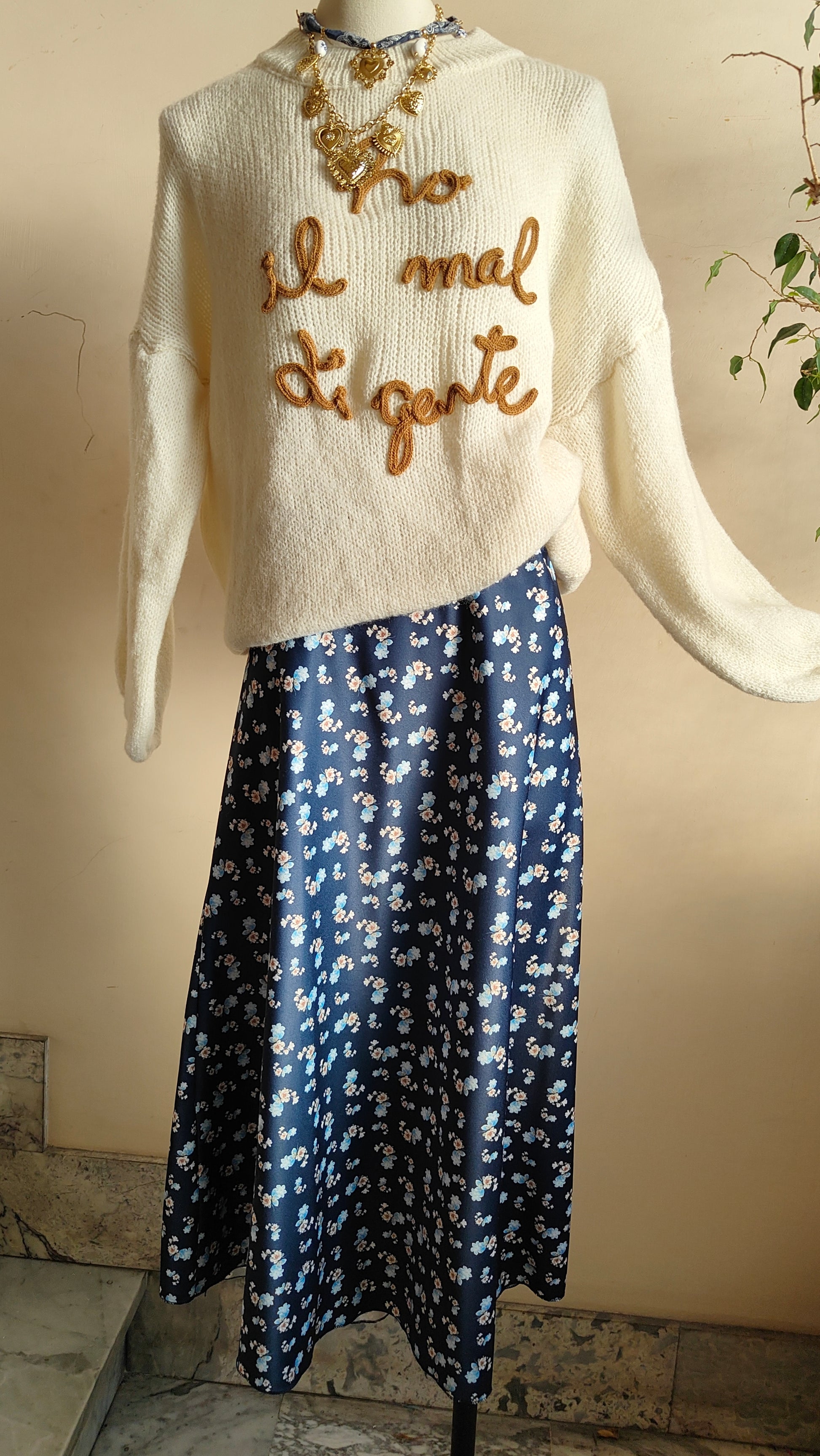 Una gonna che racconta delicatezza e carattere allo stesso tempo. Il tessuto fluido accarezza la silhouette creando un movimento leggero ad ogni passo, mentre la stampa a piccoli fiori dona un’eleganza discreta, perfetta da indossare ogni giorno.