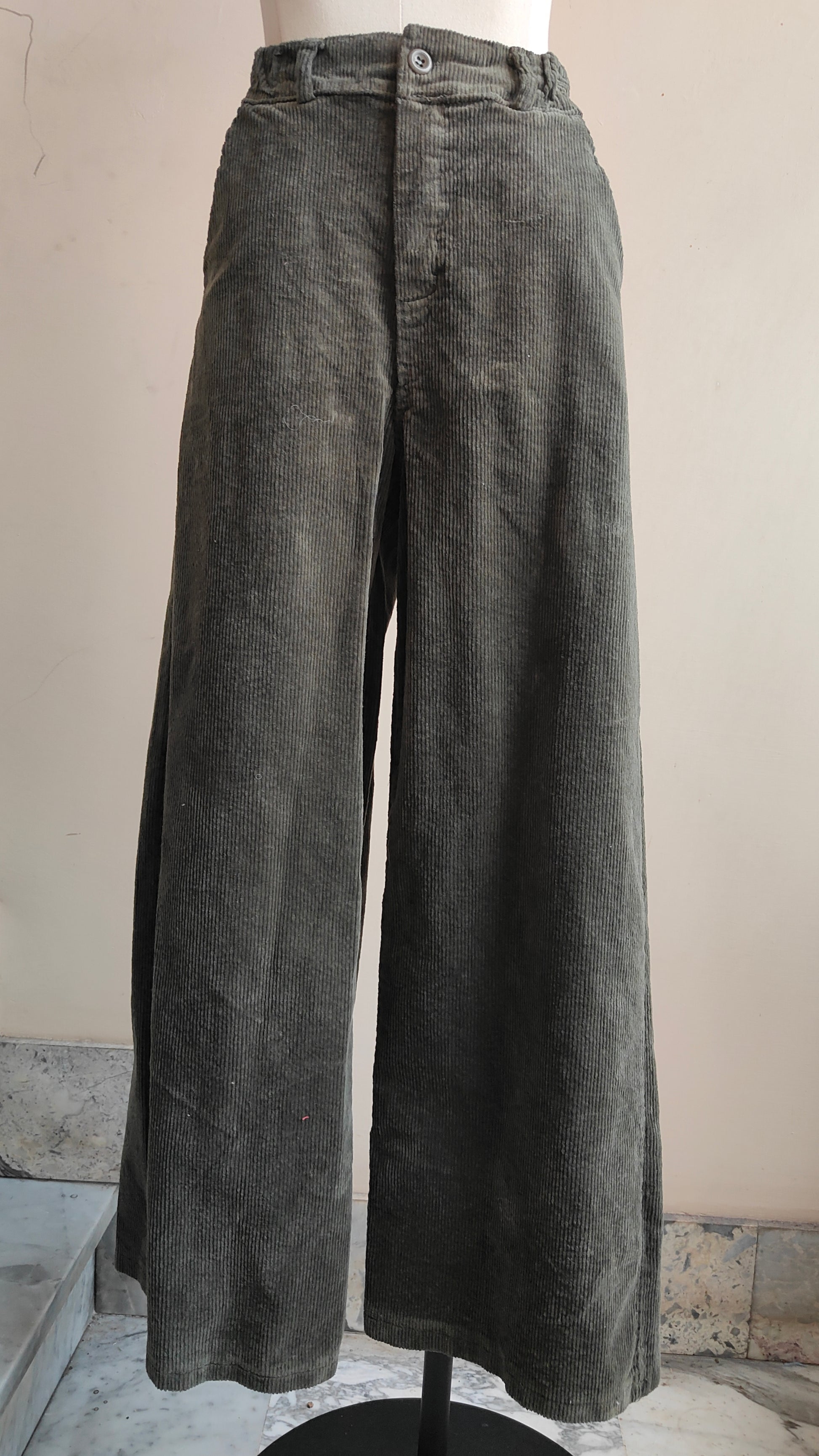 Pantaloni in velluto a coste dal taglio morbido e gamba ampia, ideali per un look raffinato ma confortevole. La vita regolare e l’elasticità del tessuto assicurano una vestibilità pratica e versatile, perfetta da mattina a sera.