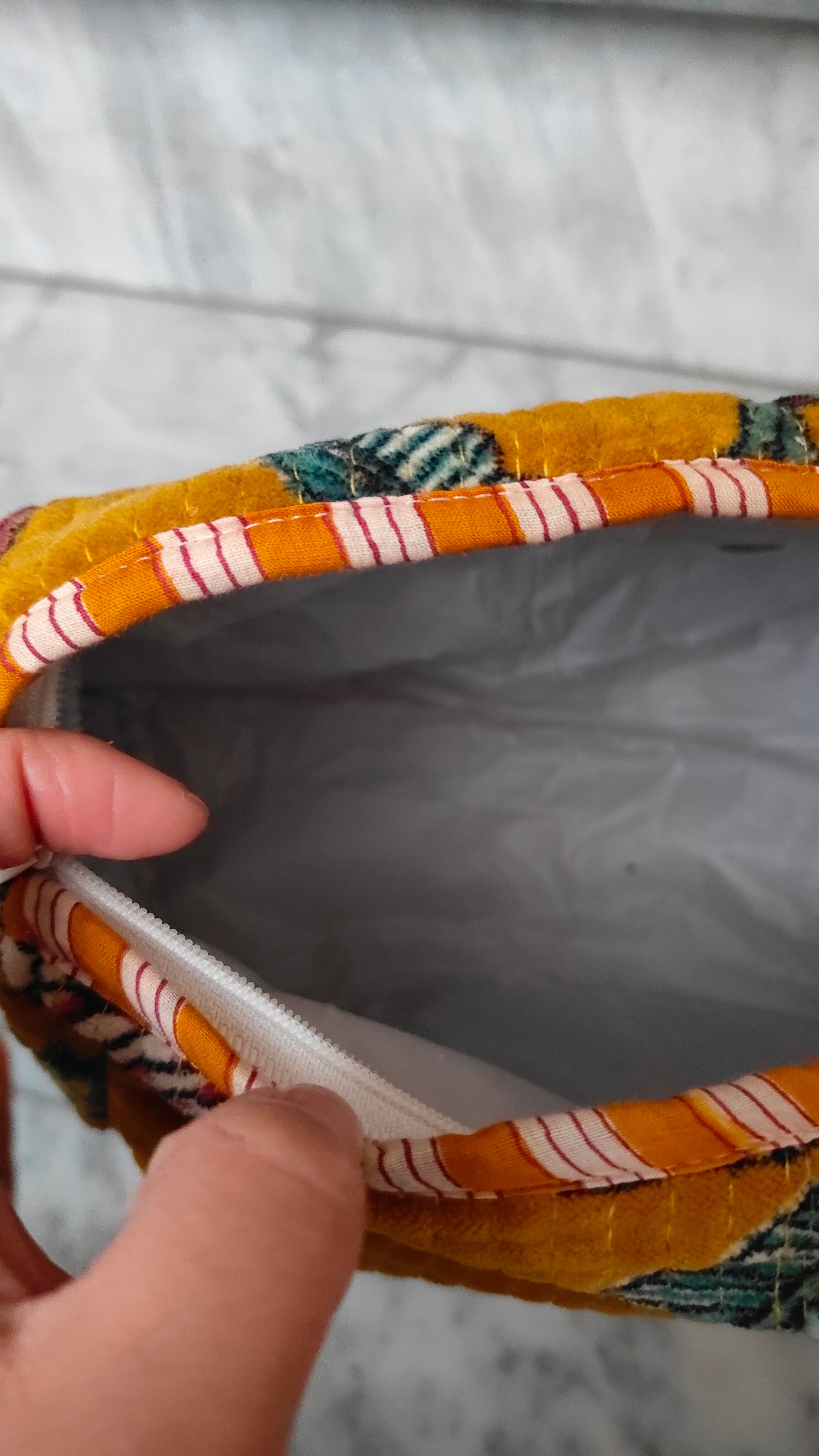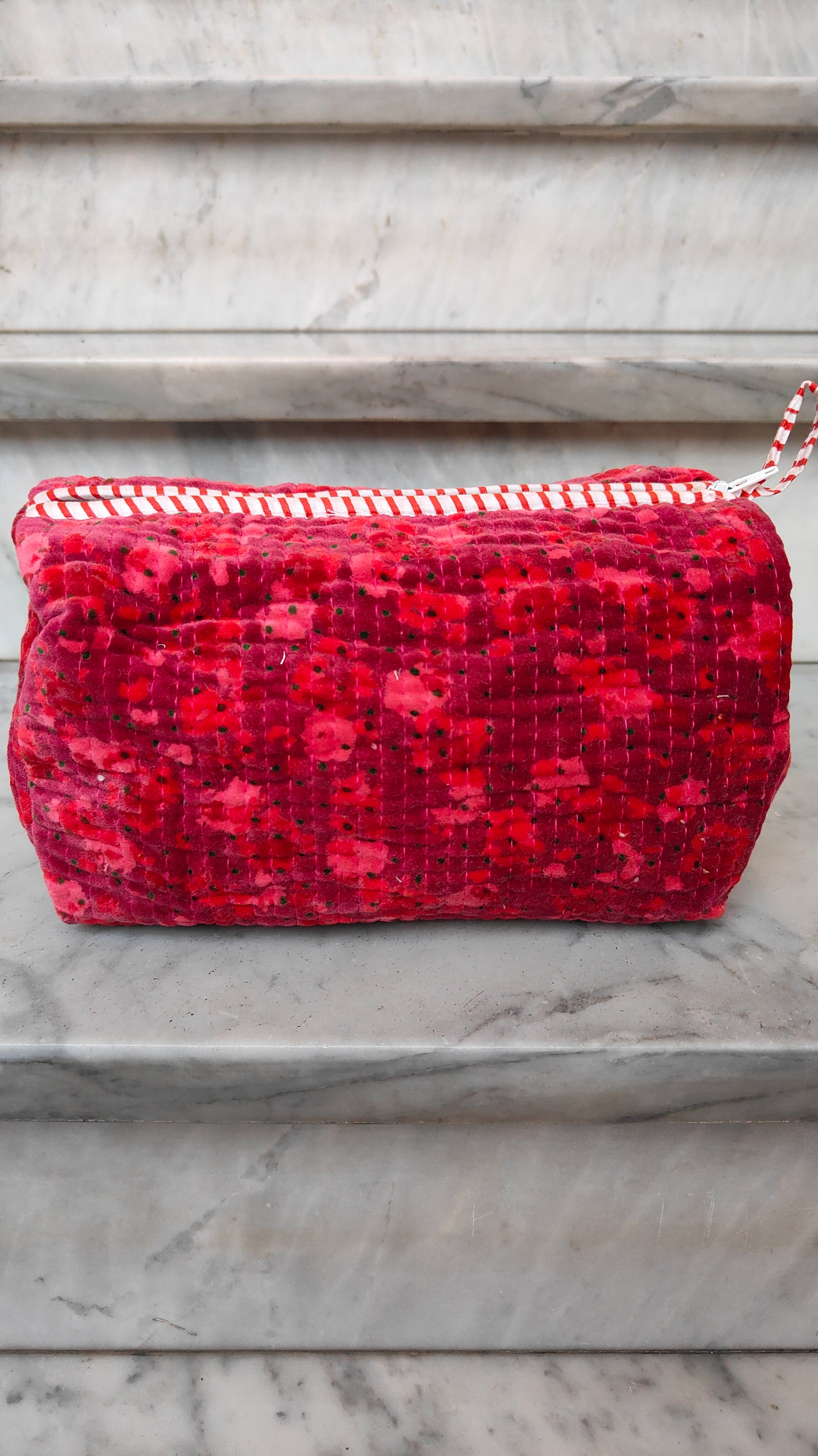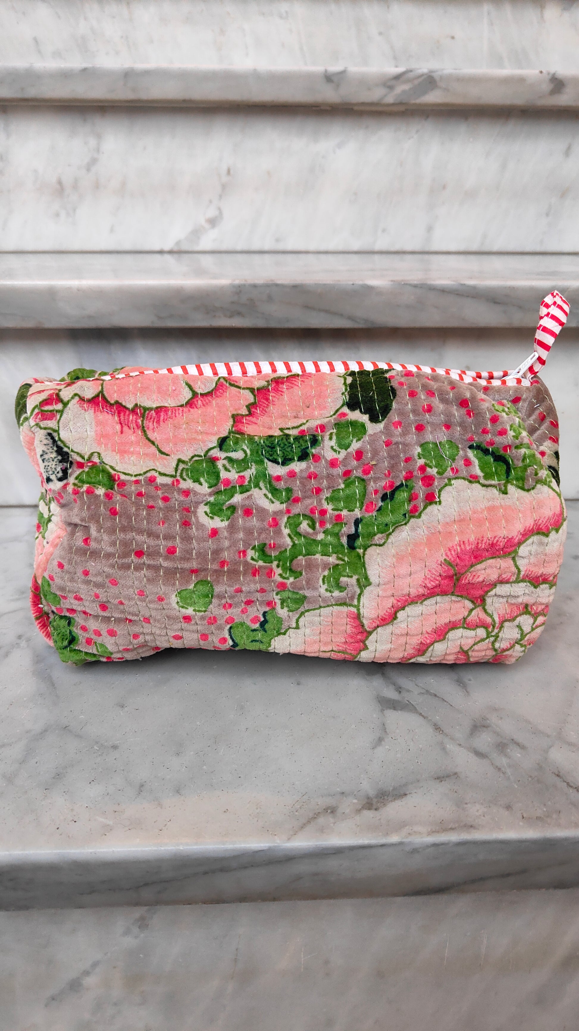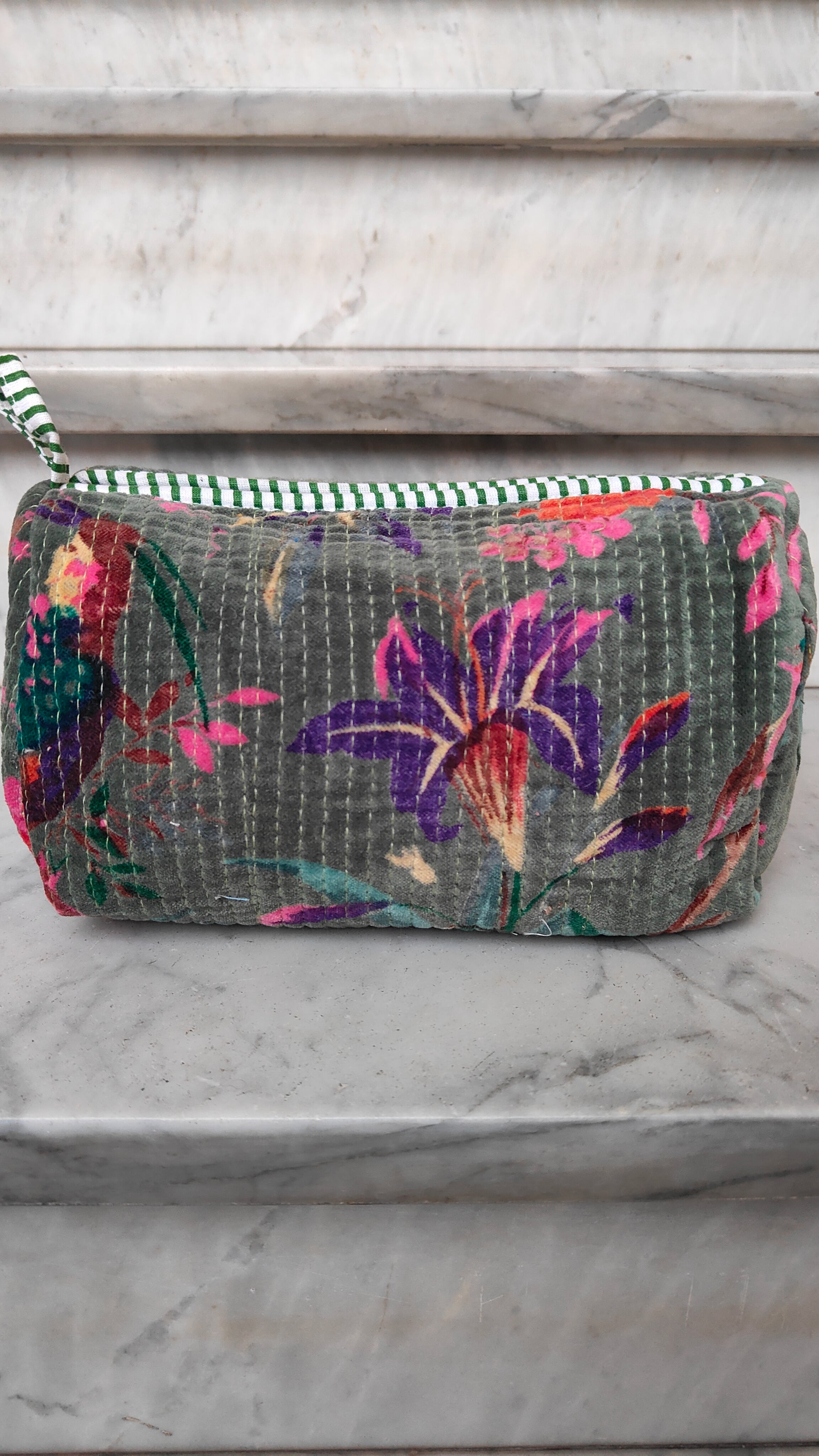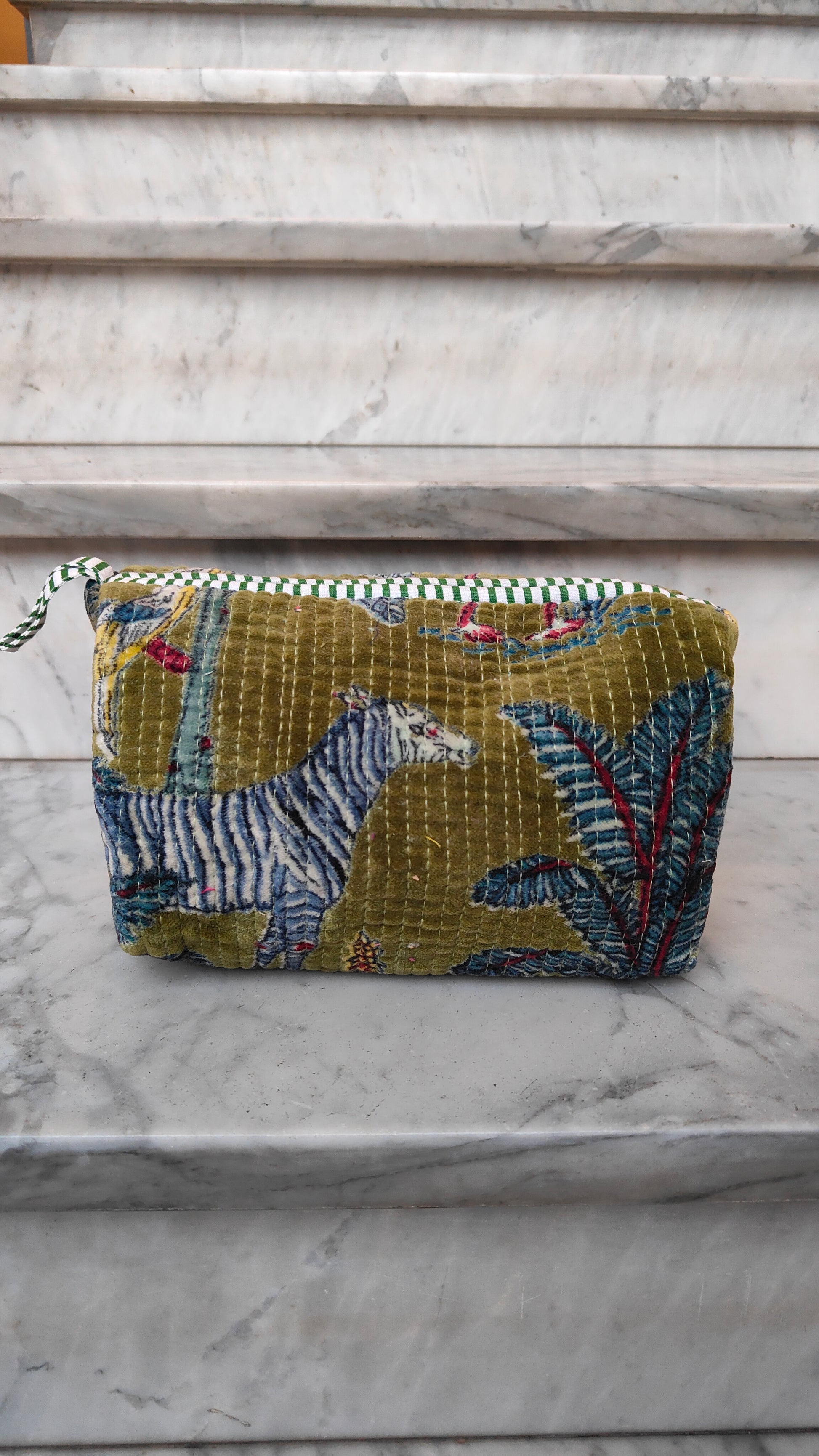 Realizzate esternamente in velluto di cotone stampato, regalano una sensazione morbida e raffinata al tatto, mentre l’interno foderato in tessuto impermeabile protegge il contenuto e le rende pratiche anche nell’uso quotidiano. Ogni pochette presenta una stampa diversa, per un insieme ricercato e mai scontato.