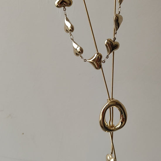 Collana regolabile in acciaio inox con pendente geometrico e cuori. Un accessorio luminoso e raffinato, pensato per valorizzare qualsiasi look — dal più semplice al più elegante. La regolazione scorrevole permette di adattarla facilmente alla scollatura desiderata.