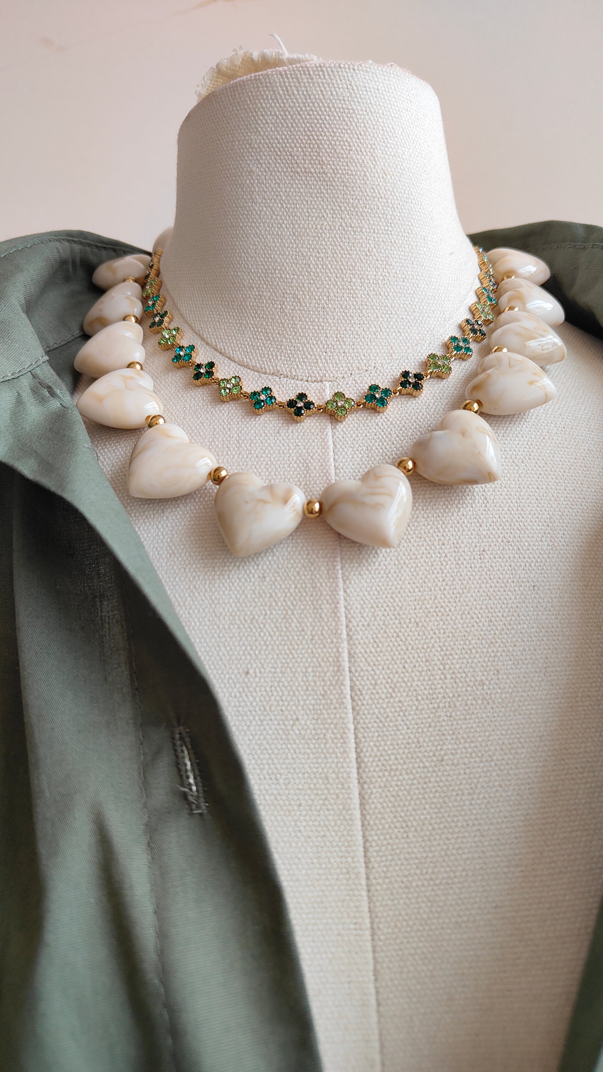 La forma a cuore dona un tocco femminile e contemporaneo, mentre la lavorazione delle perle rende ogni collana leggermente unica.