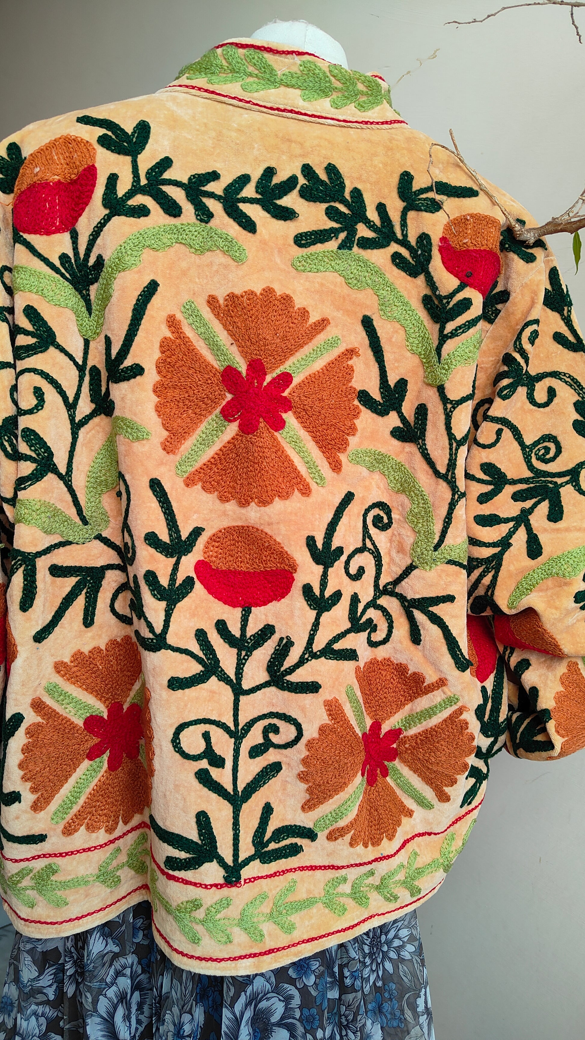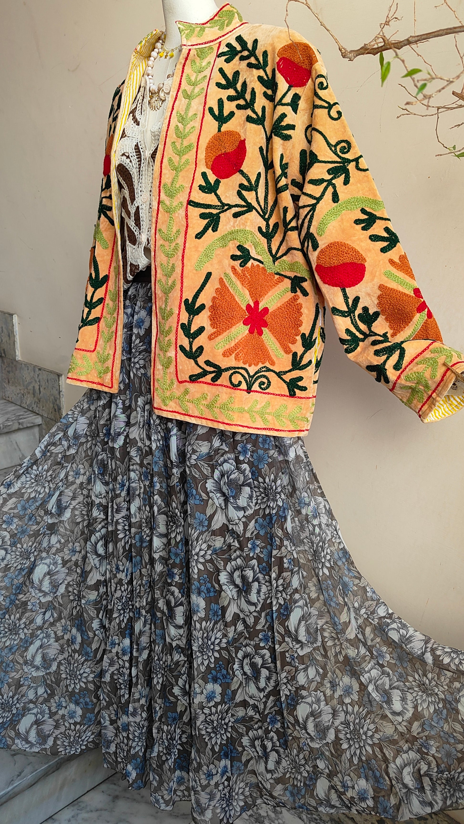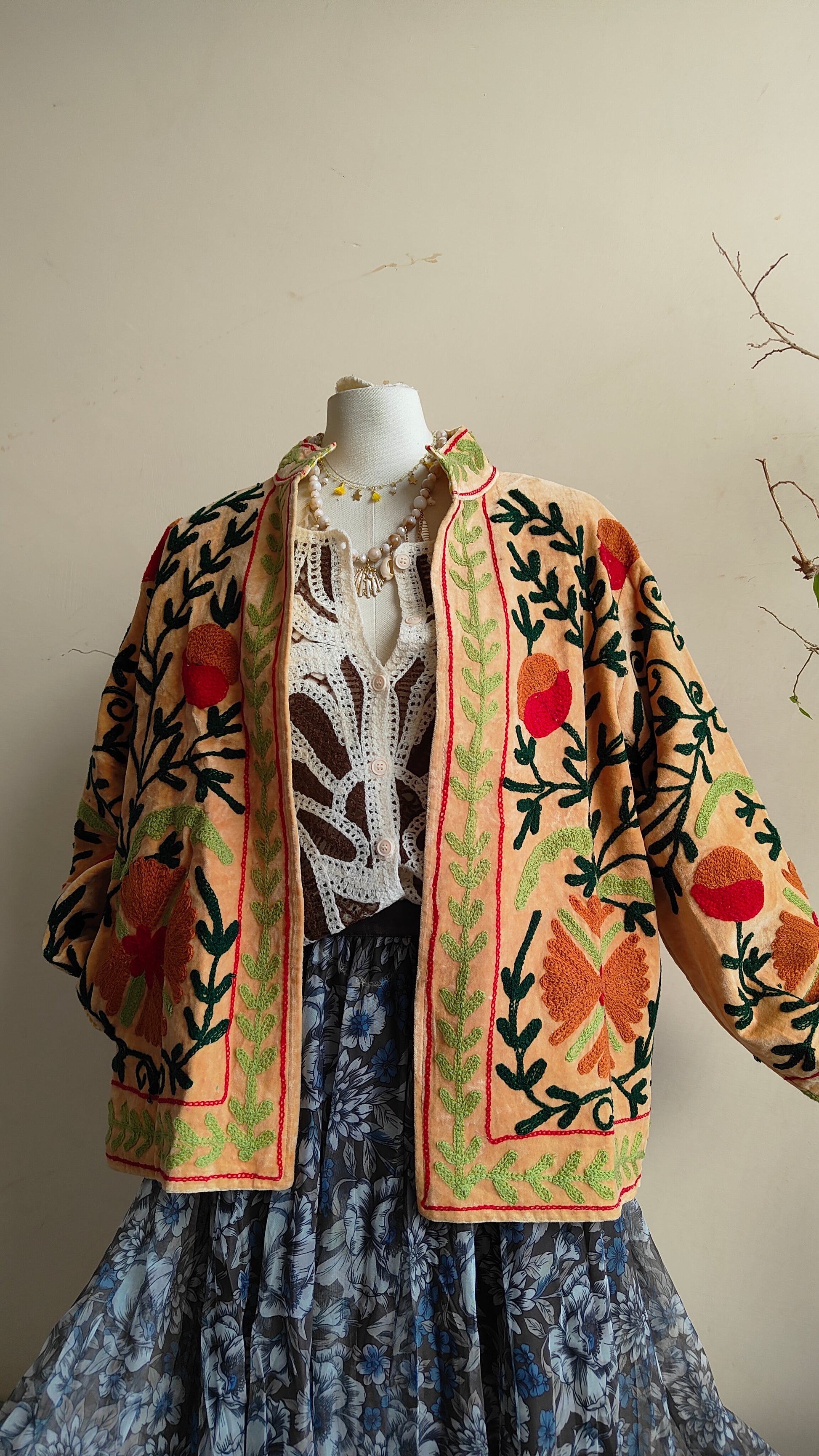 Giacca double face dal carattere boho e ricercato, pensata per dare personalità a ogni look. Da un lato presenta un ricco ricamo floreale con dettagli in rilievo, dall’altro una fantasia più essenziale e versatile, ideale per cambiare stile con un semplice gesto.