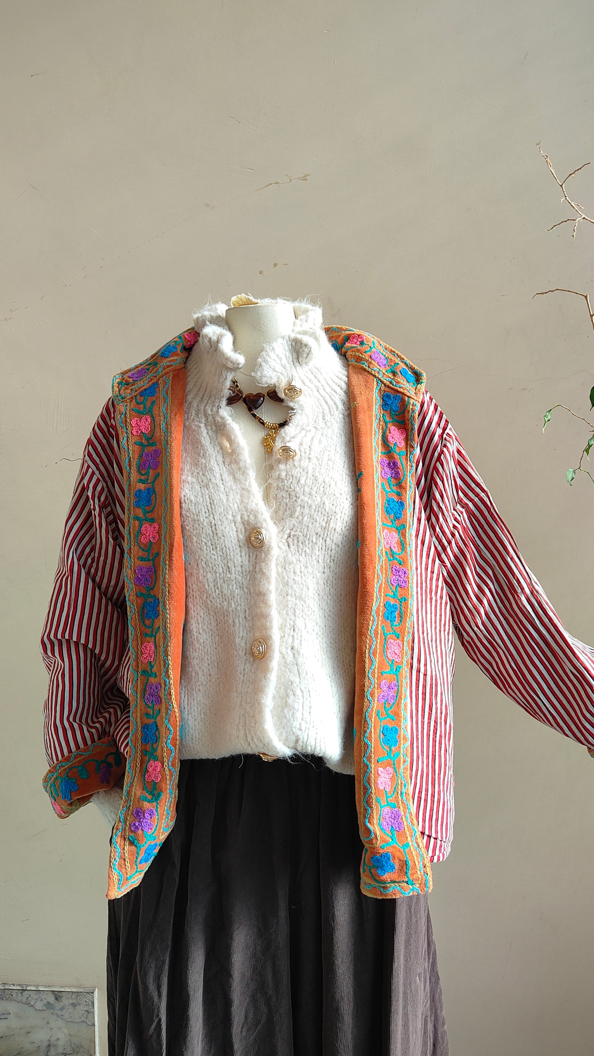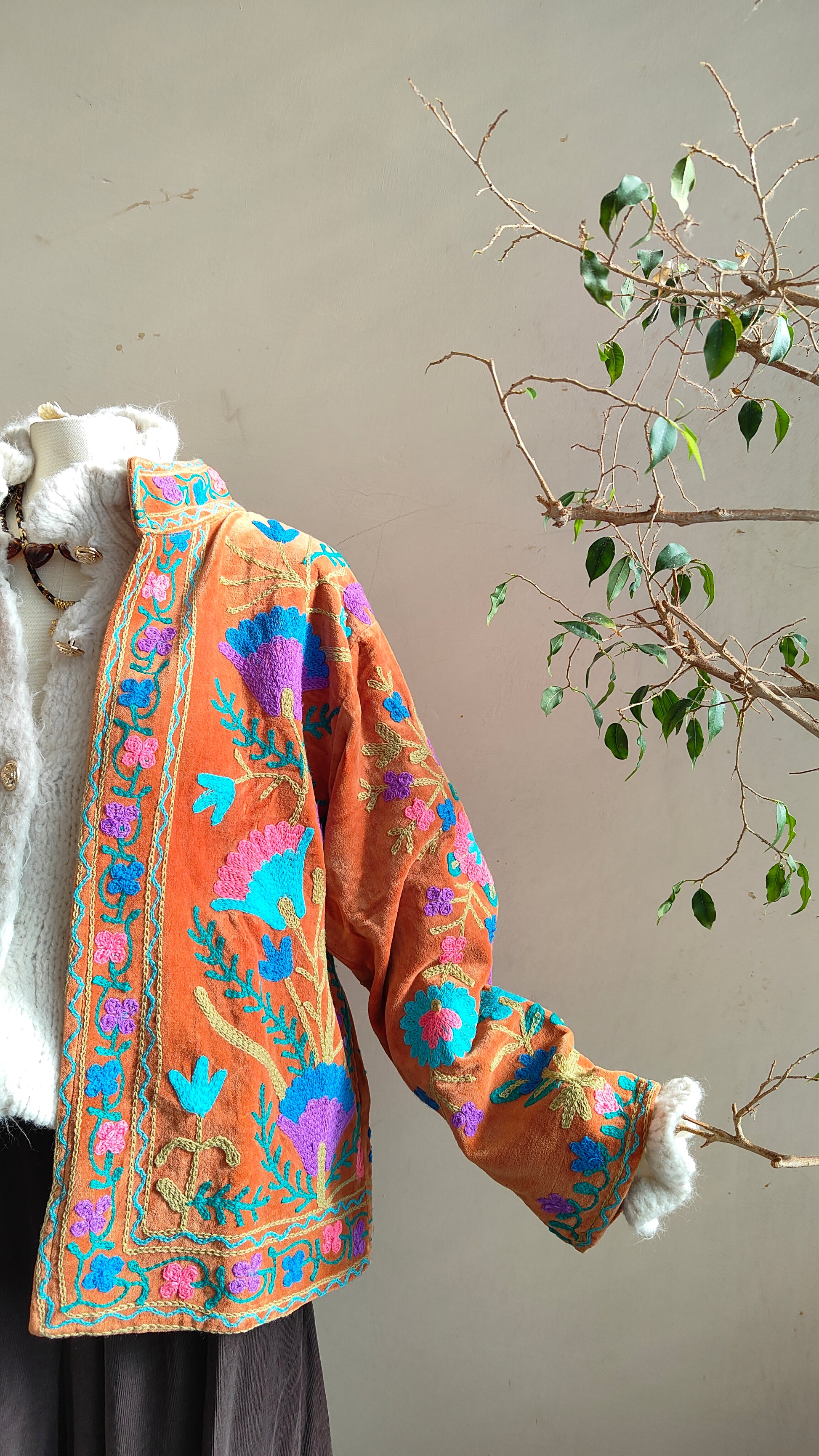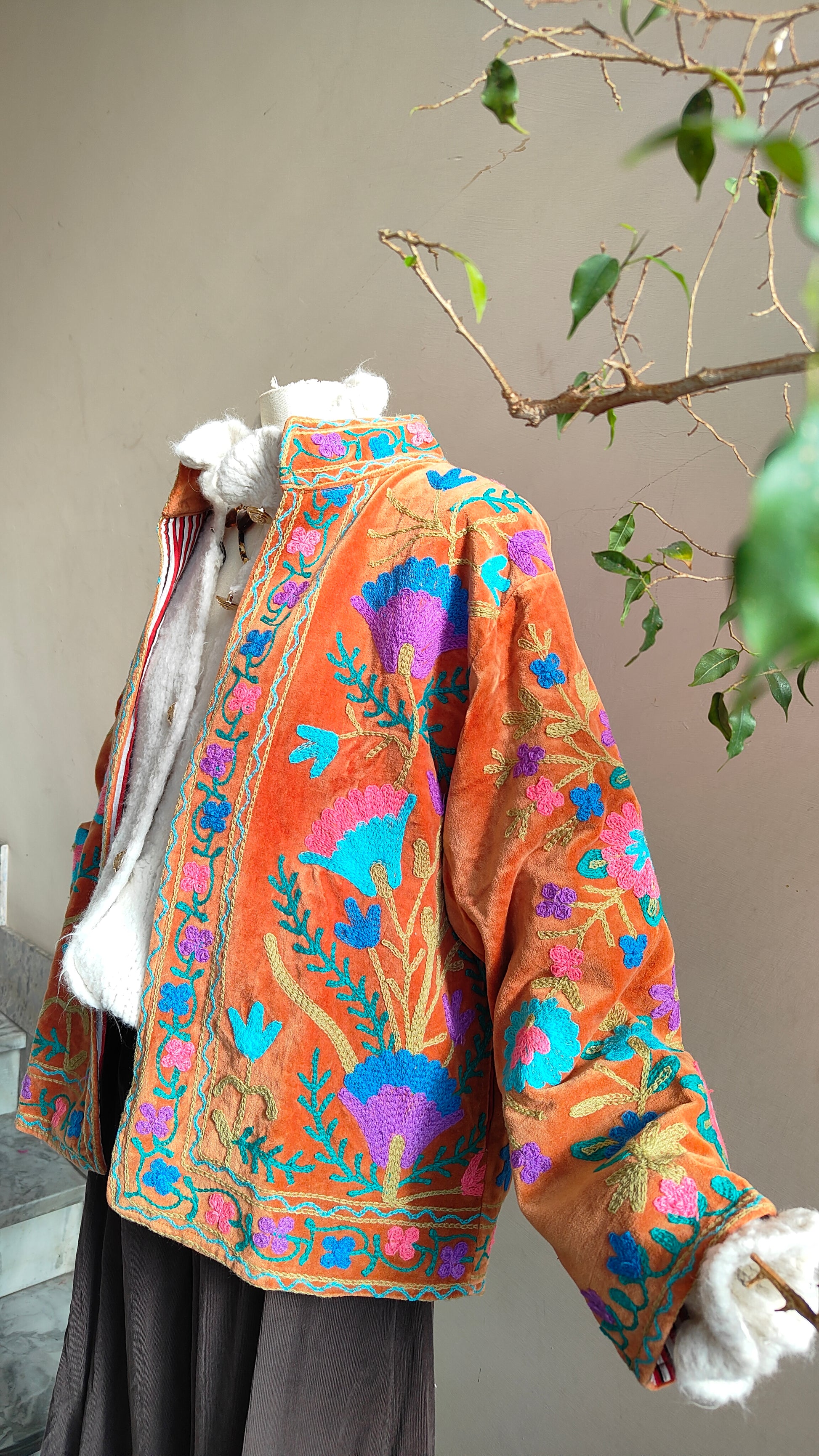 Giacca double face dal carattere boho e ricercato, pensata per dare personalità a ogni look. Da un lato presenta un ricco ricamo floreale con dettagli in rilievo, dall’altro una fantasia più essenziale e versatile, ideale per cambiare stile con un semplice gesto.