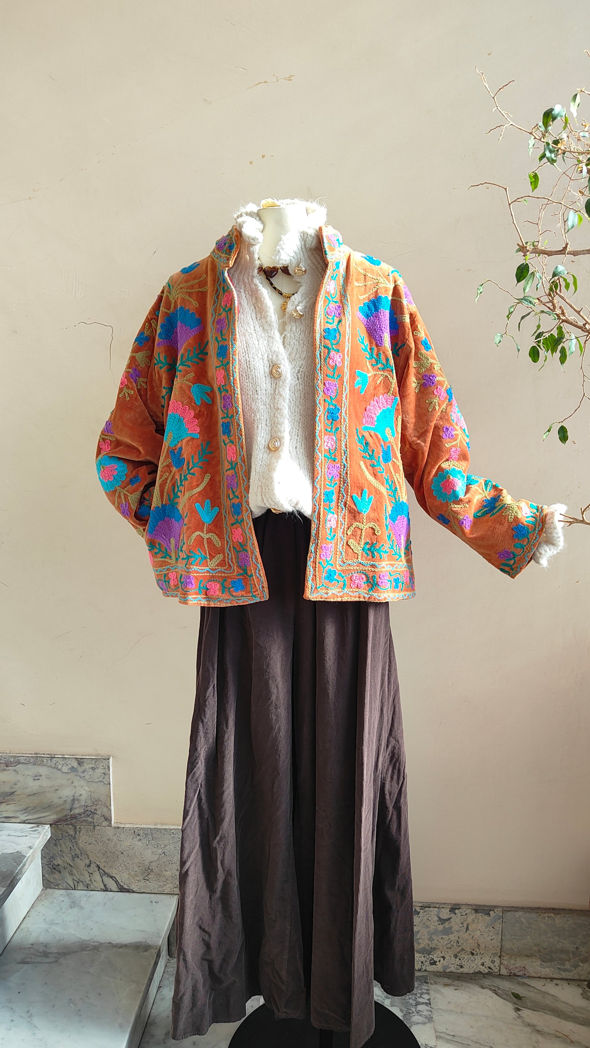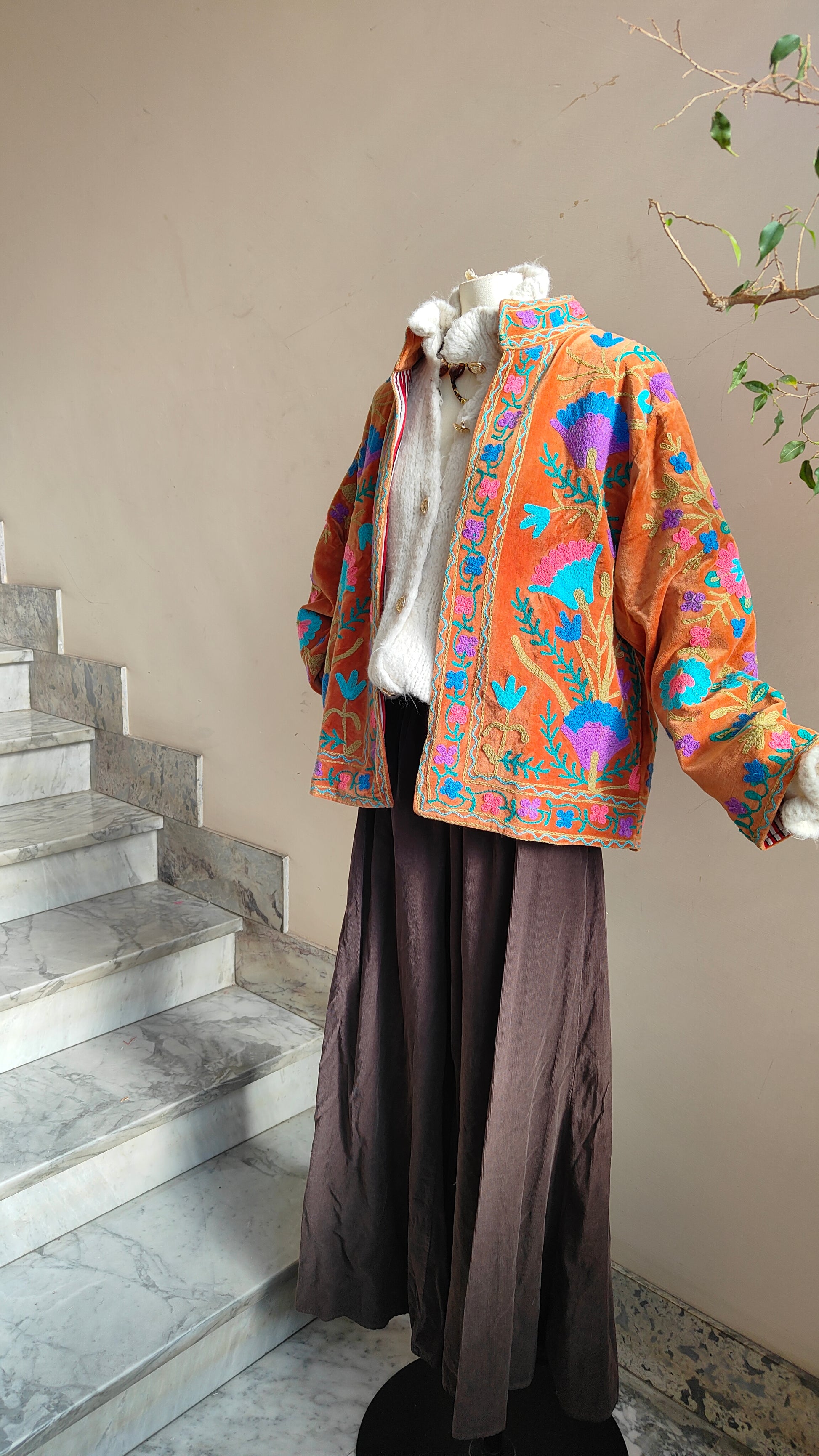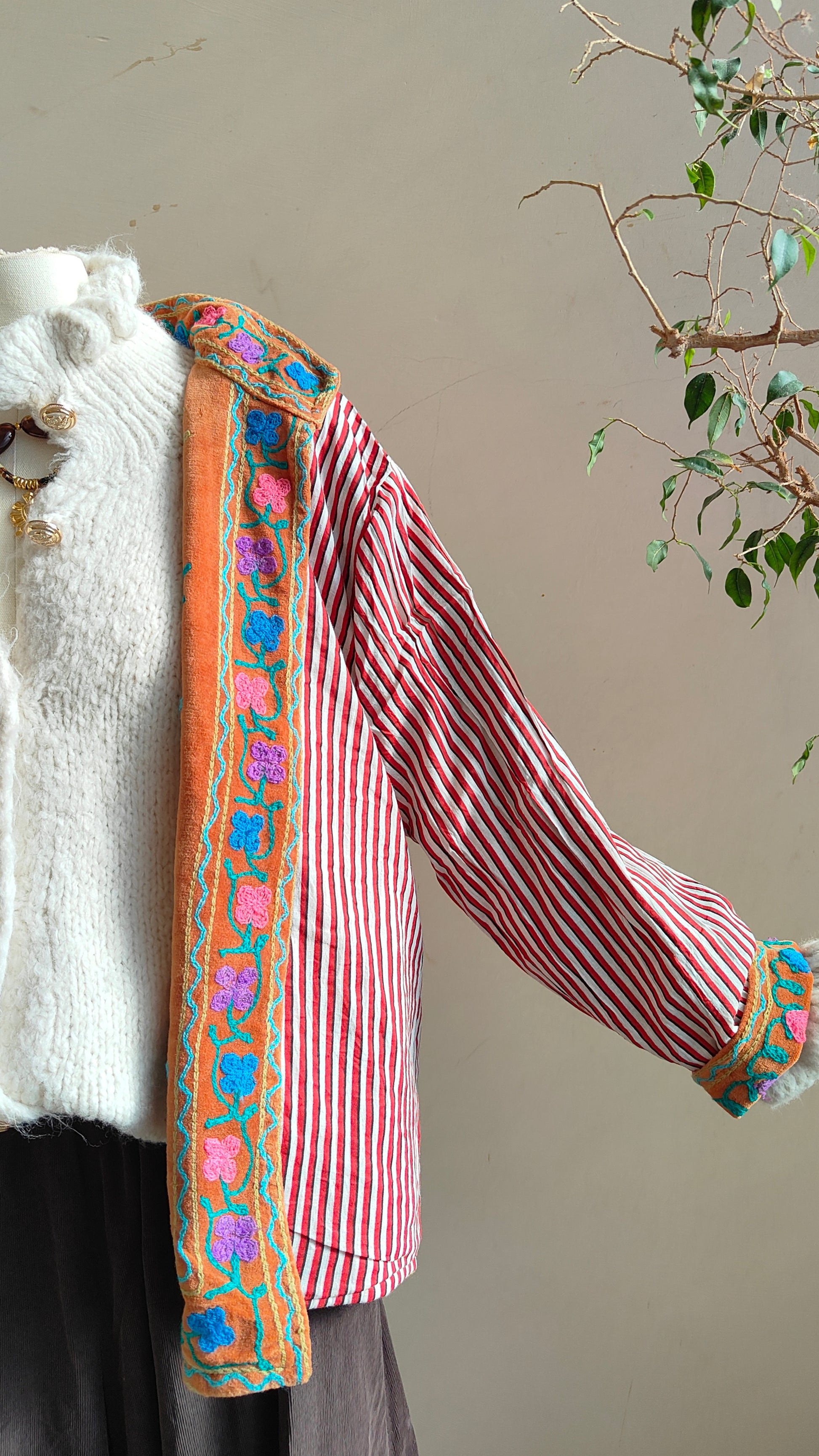 Giacca double face dal carattere boho e ricercato, pensata per dare personalità a ogni look. Da un lato presenta un ricco ricamo floreale con dettagli in rilievo, dall’altro una fantasia più essenziale e versatile, ideale per cambiare stile con un semplice gesto.