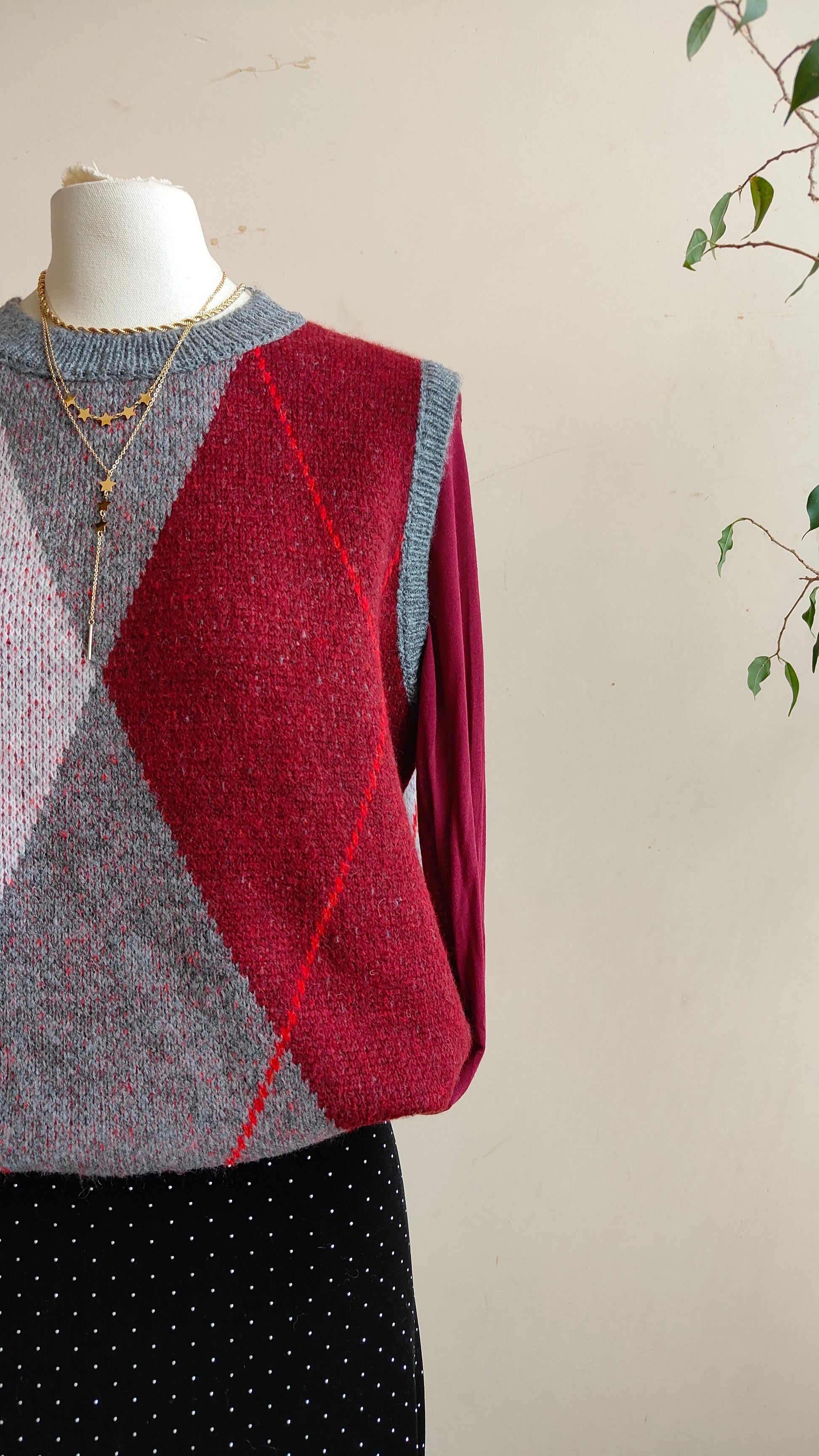 Gilet a rombi dallo stile rétro contemporaneo, perfetto da indossare sopra camicie o dolcevita per creare look ricercati e caldi. Il tessuto morbido e il taglio leggermente over regalano comfort e personalità, ideale per un outfit casual chic.