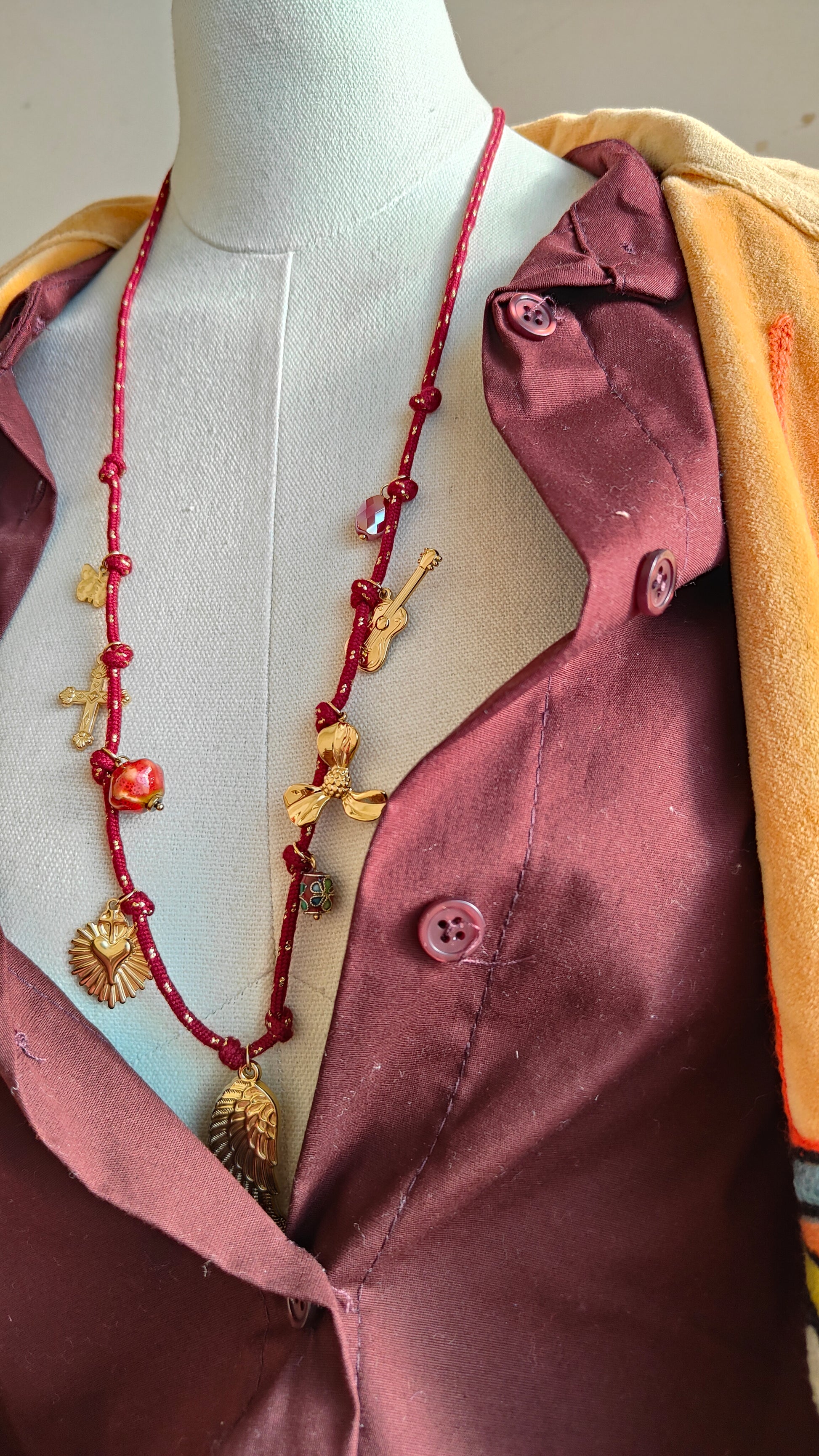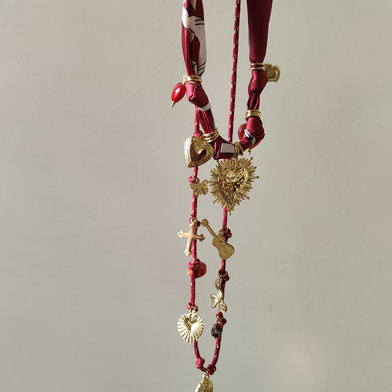 Set di collane dal carattere simbolico e boho, pensato per essere indossato insieme o separatamente, a seconda dello stile e dell’occasione. Ogni collana è arricchita da charm iconici e dettagli decorativi che richiamano l’estetica ex voto, creando un mix ricco ma armonioso. La collana foulard con pendente a cuore diventa il punto focale del look, mentre la collana lunga con charm aggiunge movimento e personalità. Un set versatile, perfetto per dare carattere anche agli outfit più essenziali.