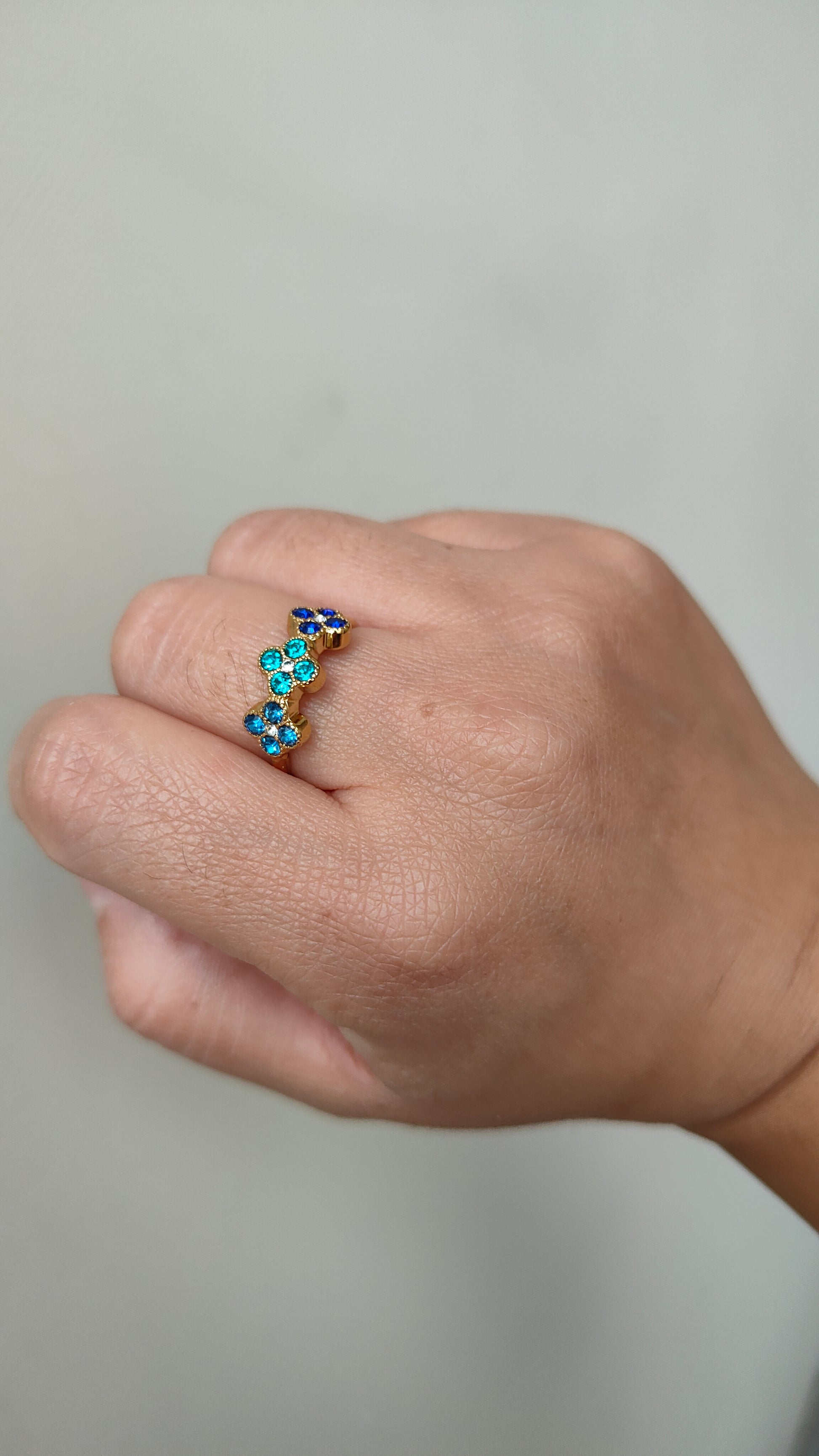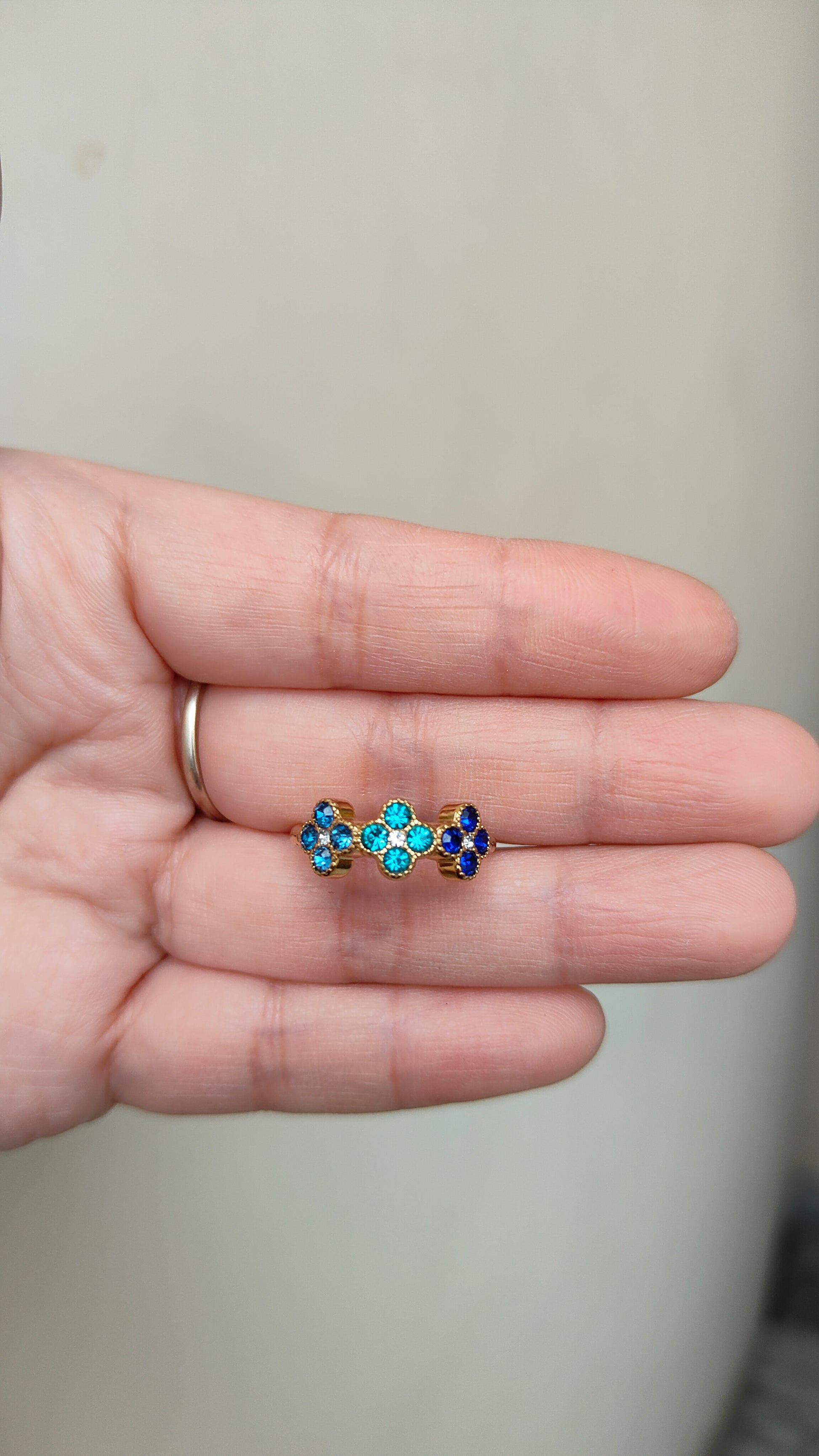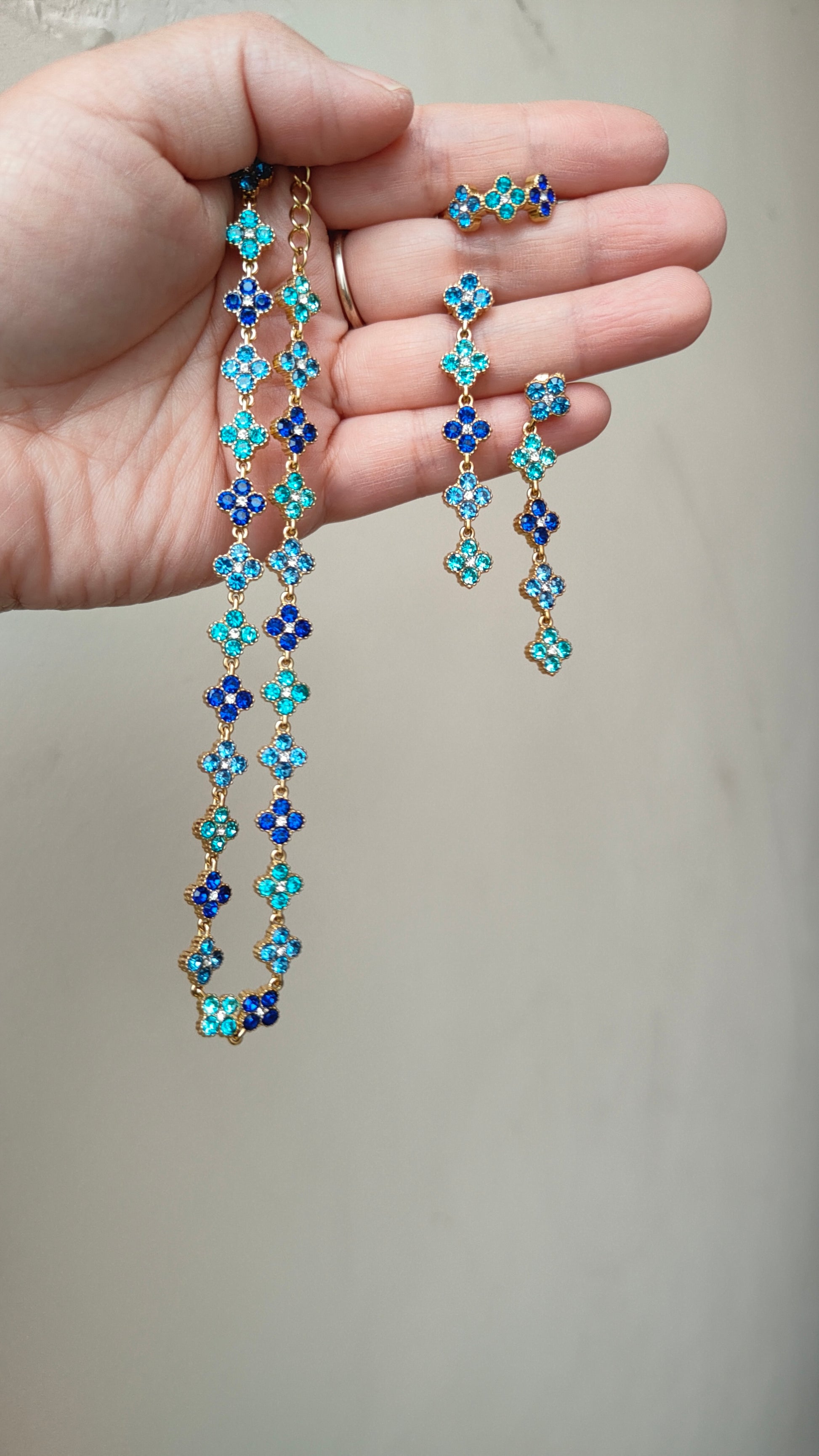 Set di gioielli luminoso e raffinato, composto da collana, anello e orecchini coordinati, impreziositi da piccoli elementi a fiore con cristalli nelle tonalità dell’azzurro e del blu.
