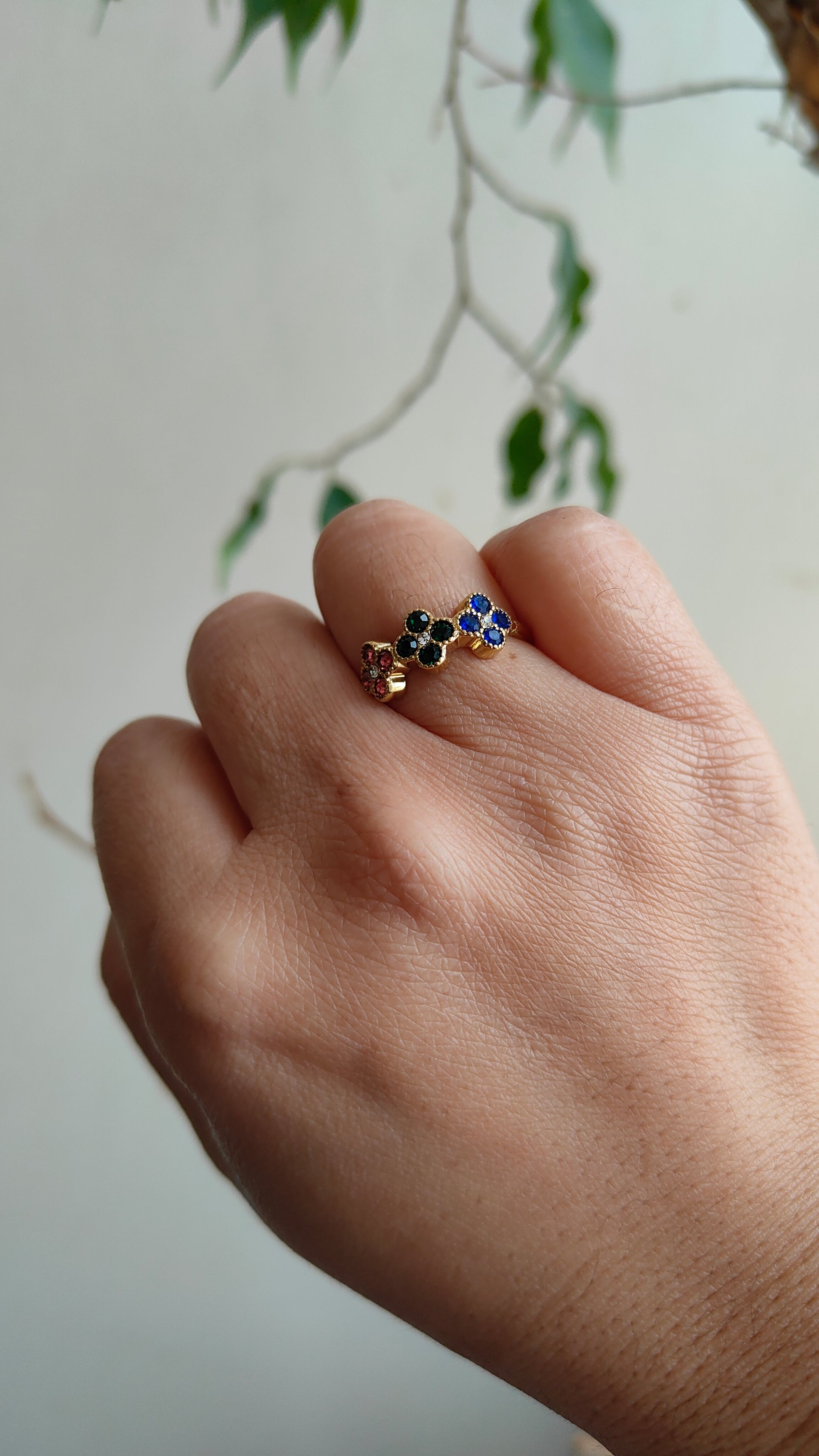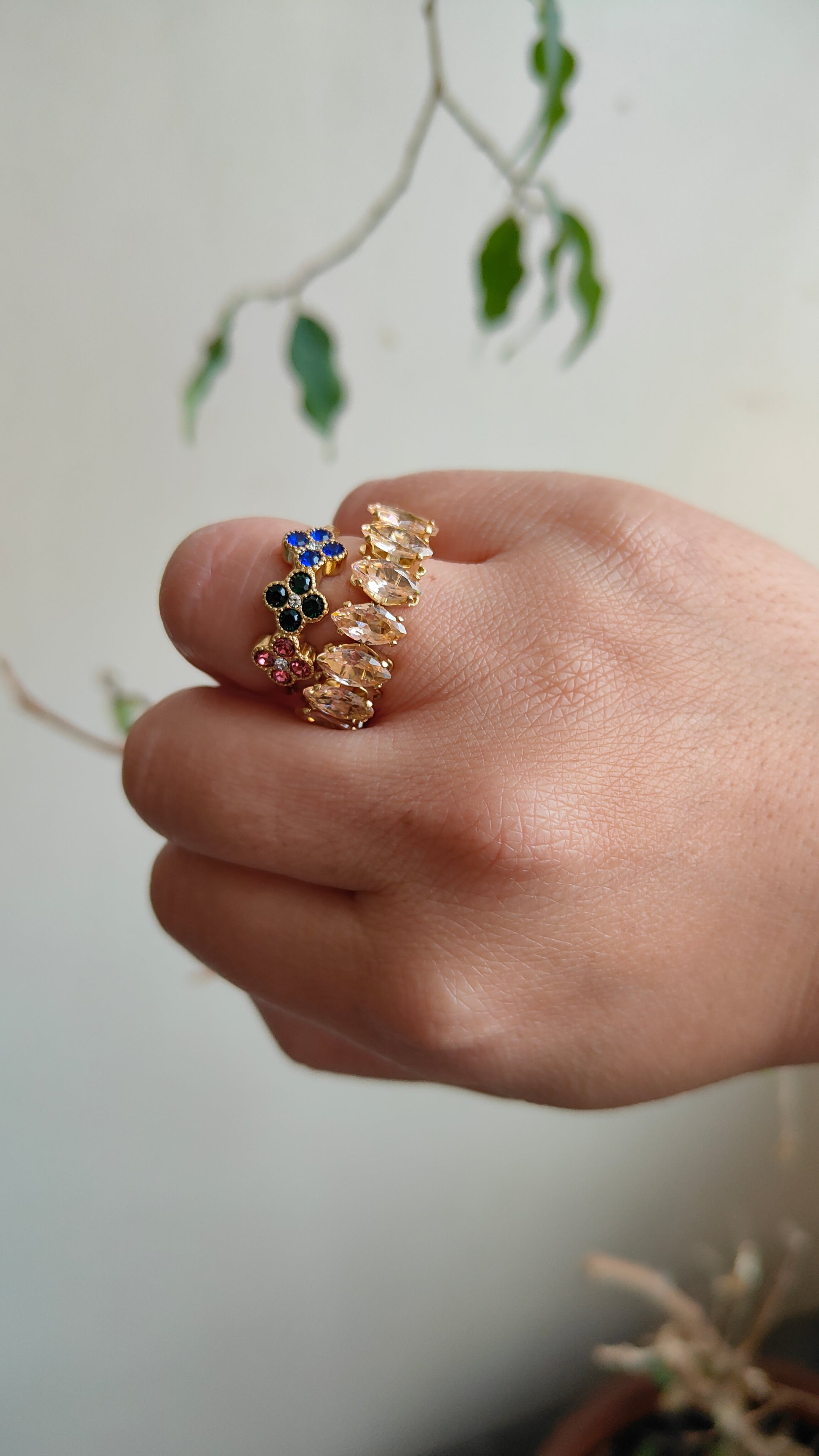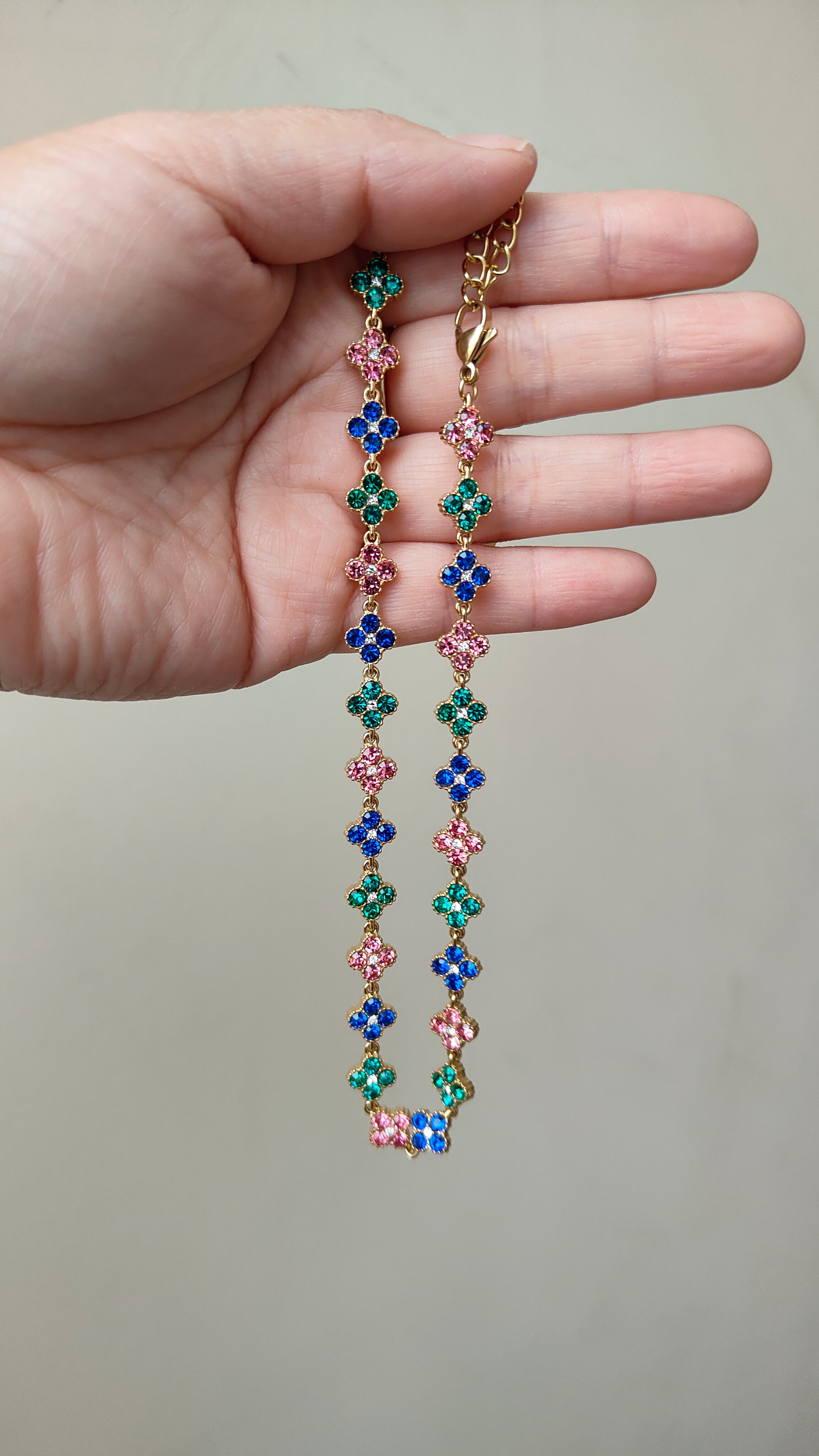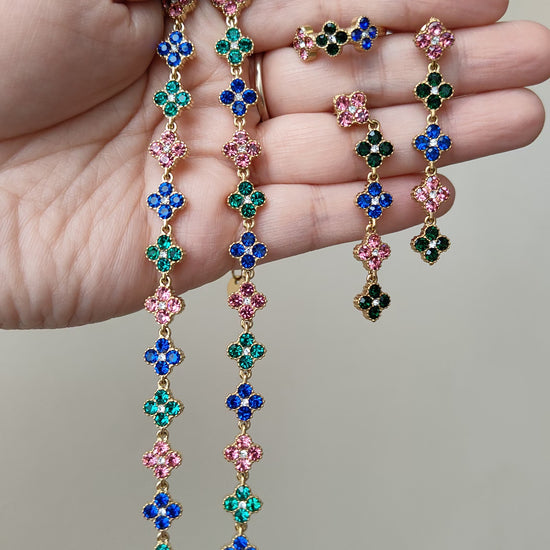 Set di gioielli luminoso e raffinato, composto da collana, anello e orecchini coordinati, impreziositi da piccoli elementi a fiore con cristalli nelle tonalità dell’azzurro e del blu.