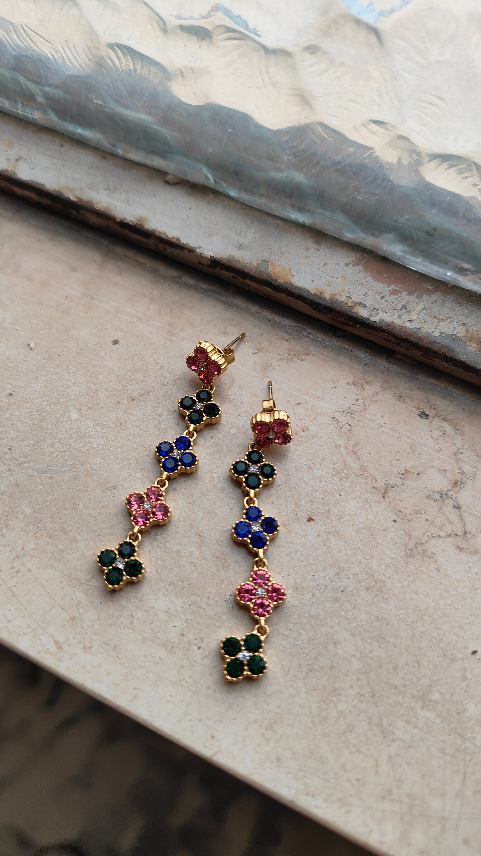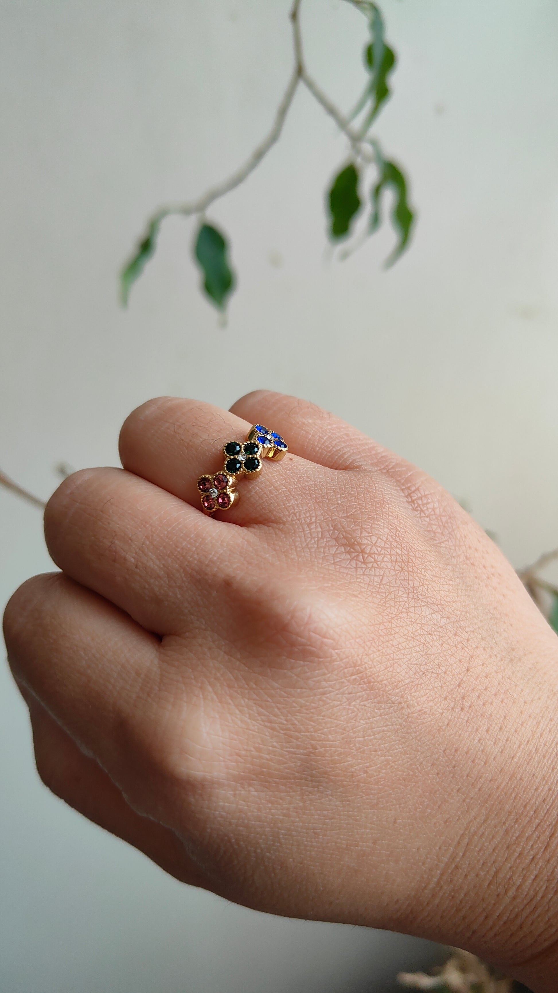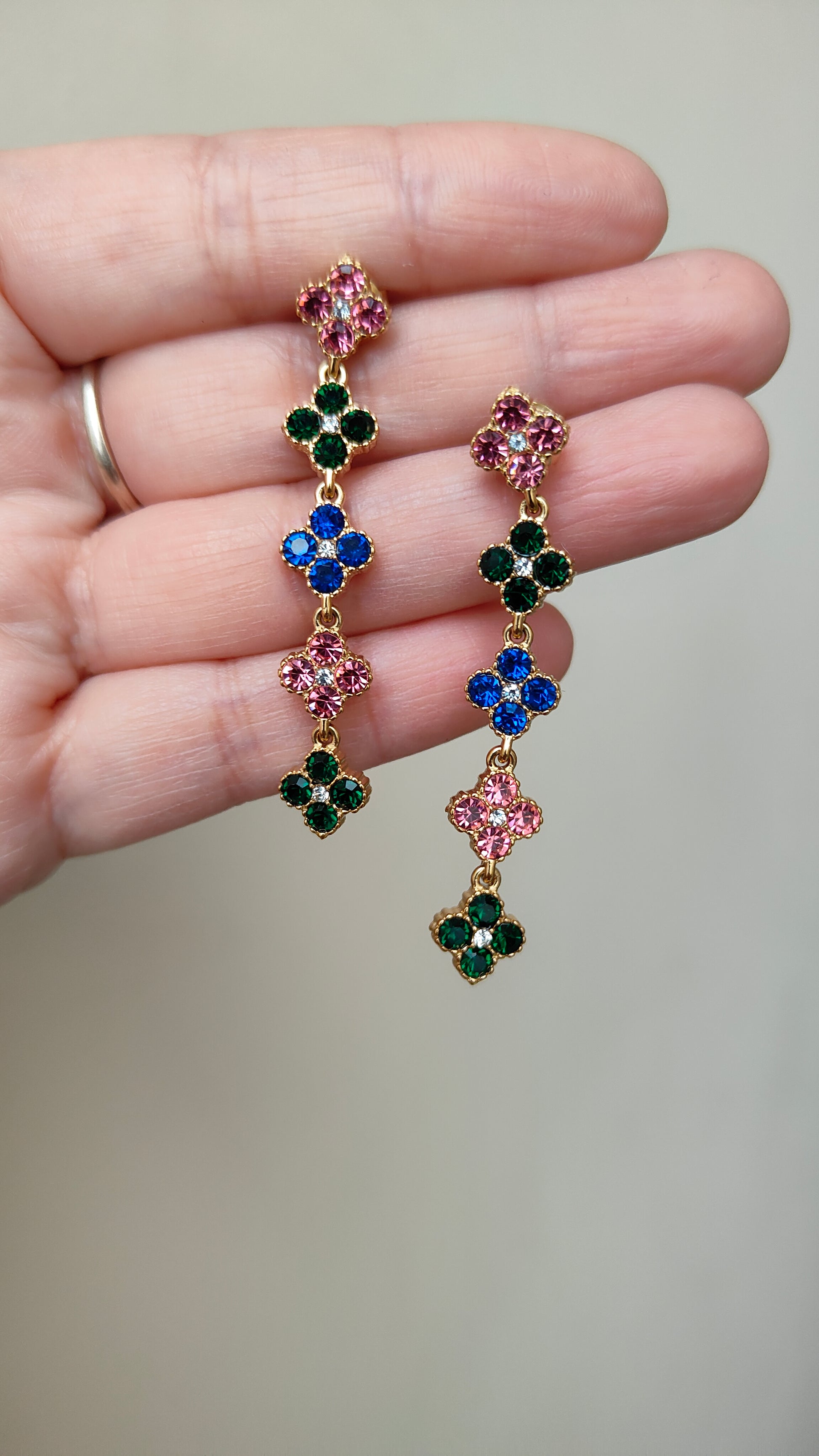 Set di gioielli luminoso e raffinato, composto da collana, anello e orecchini coordinati, impreziositi da piccoli elementi a fiore con cristalli nelle tonalità dell’azzurro e del blu.