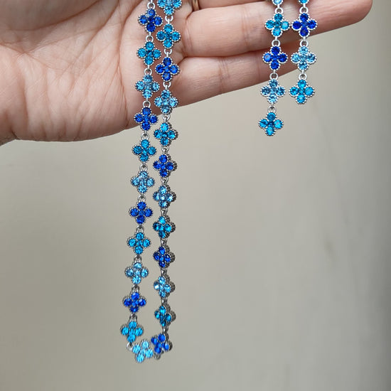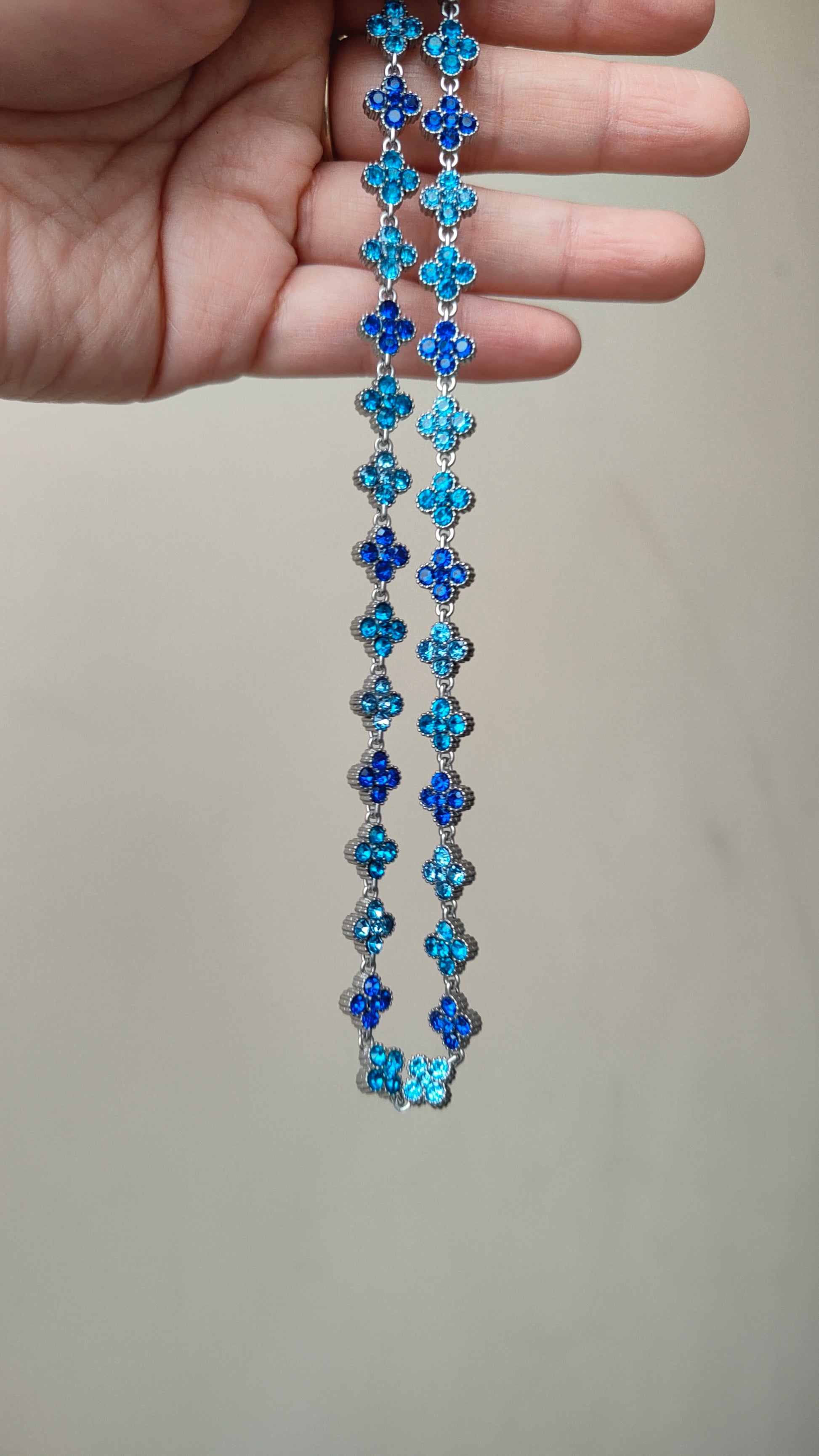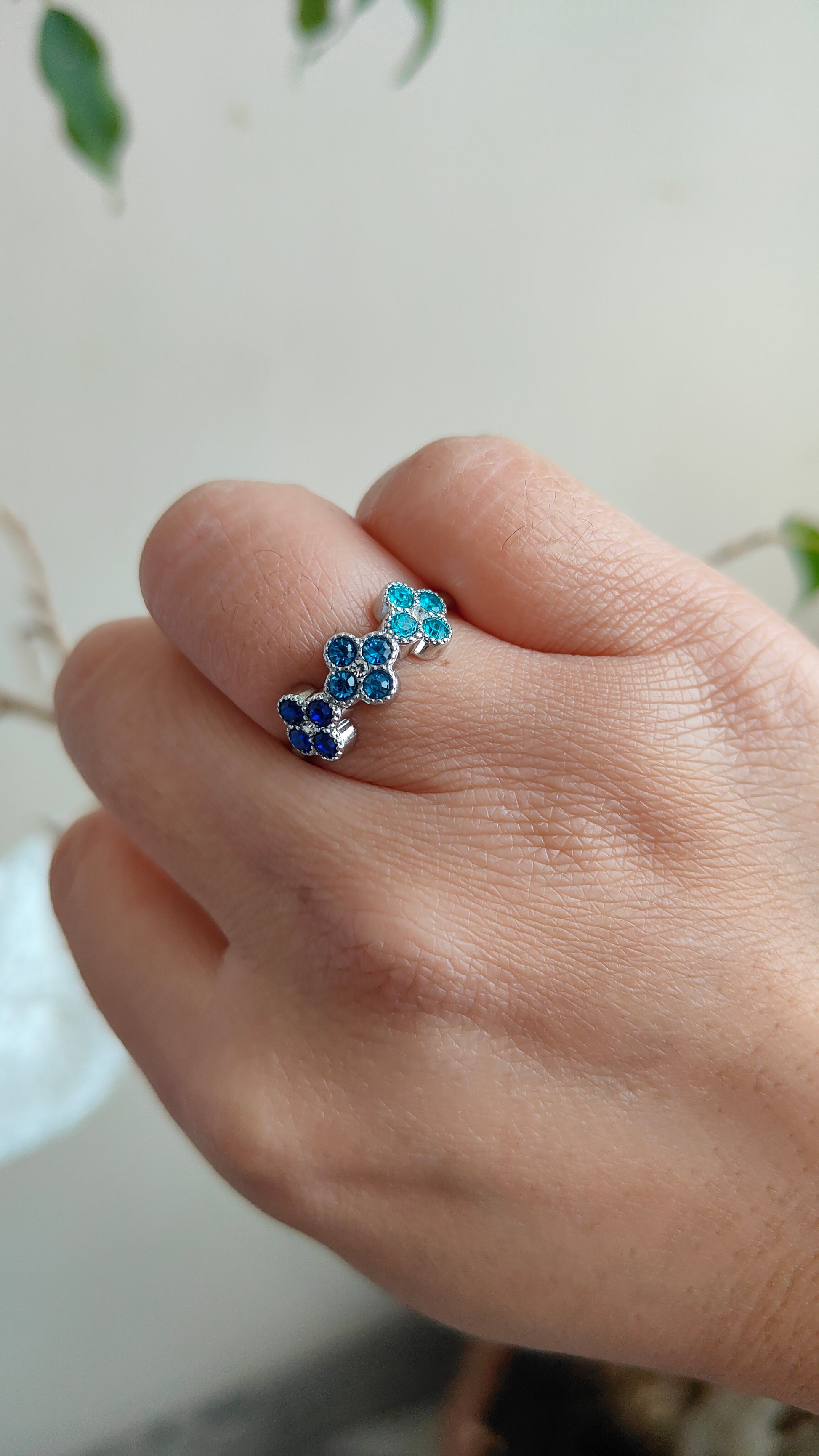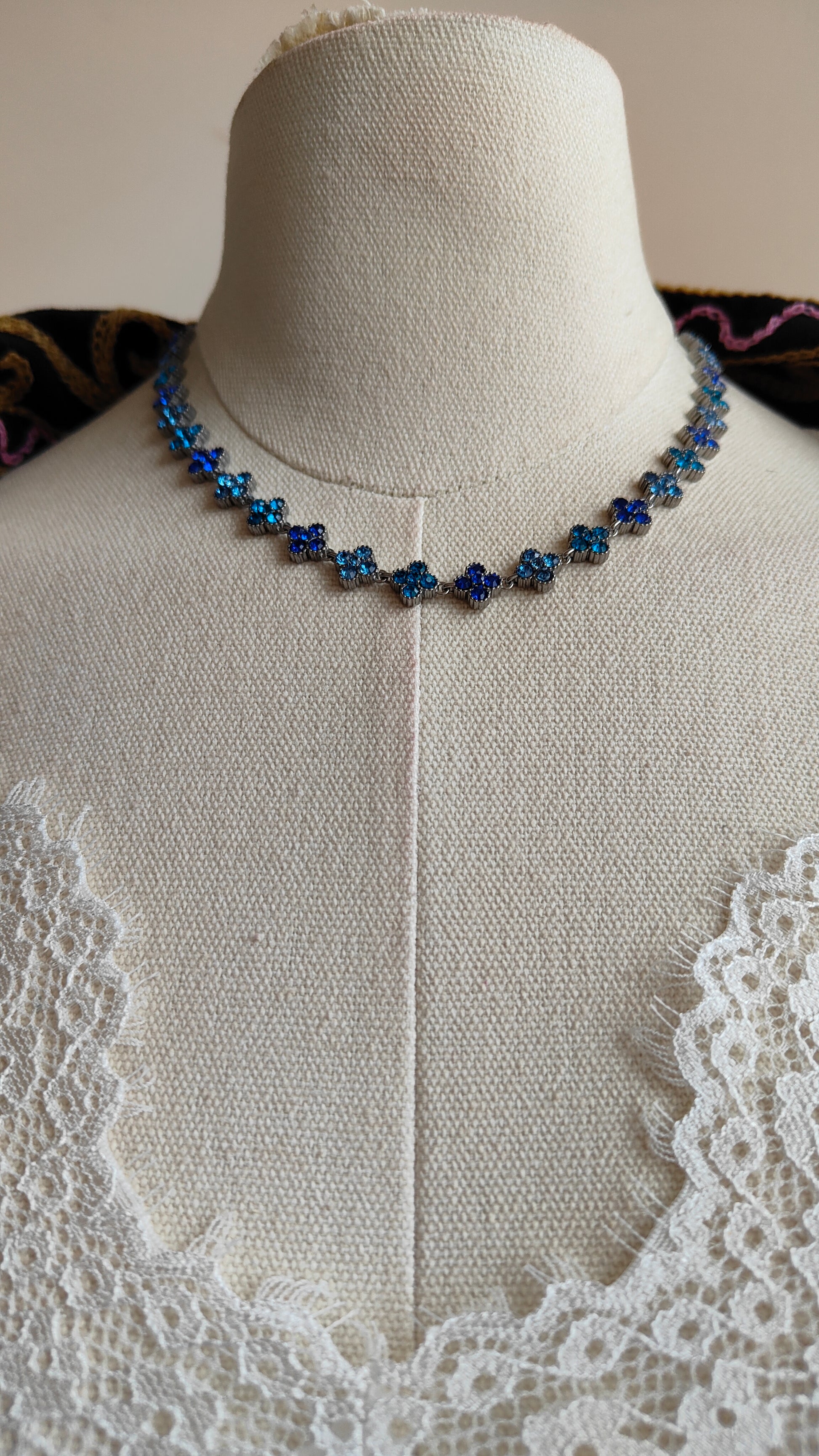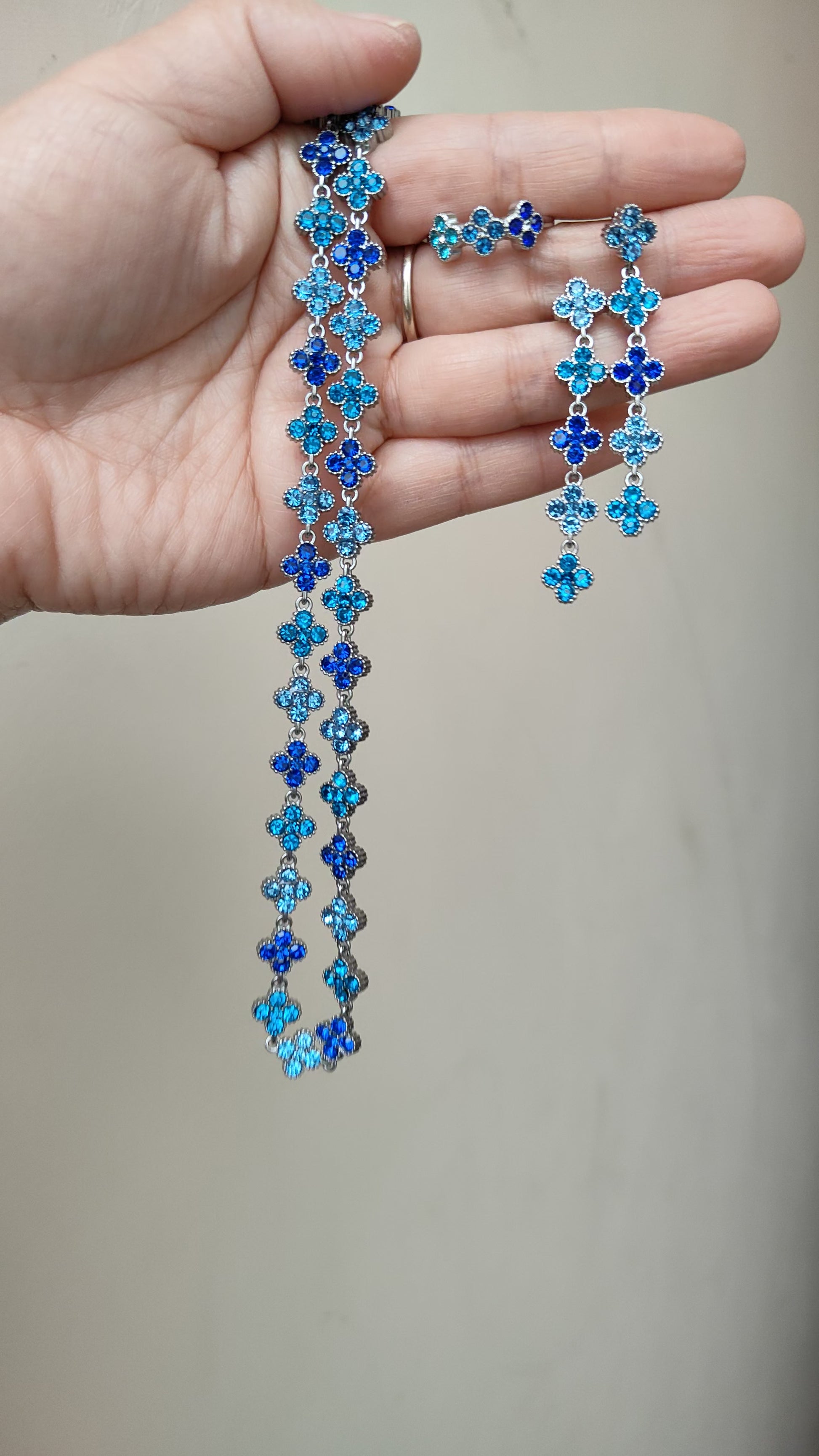 Set di gioielli luminoso e raffinato, composto da collana, anello e orecchini coordinati, impreziositi da piccoli elementi a fiore con cristalli nelle tonalità dell’azzurro e del blu.