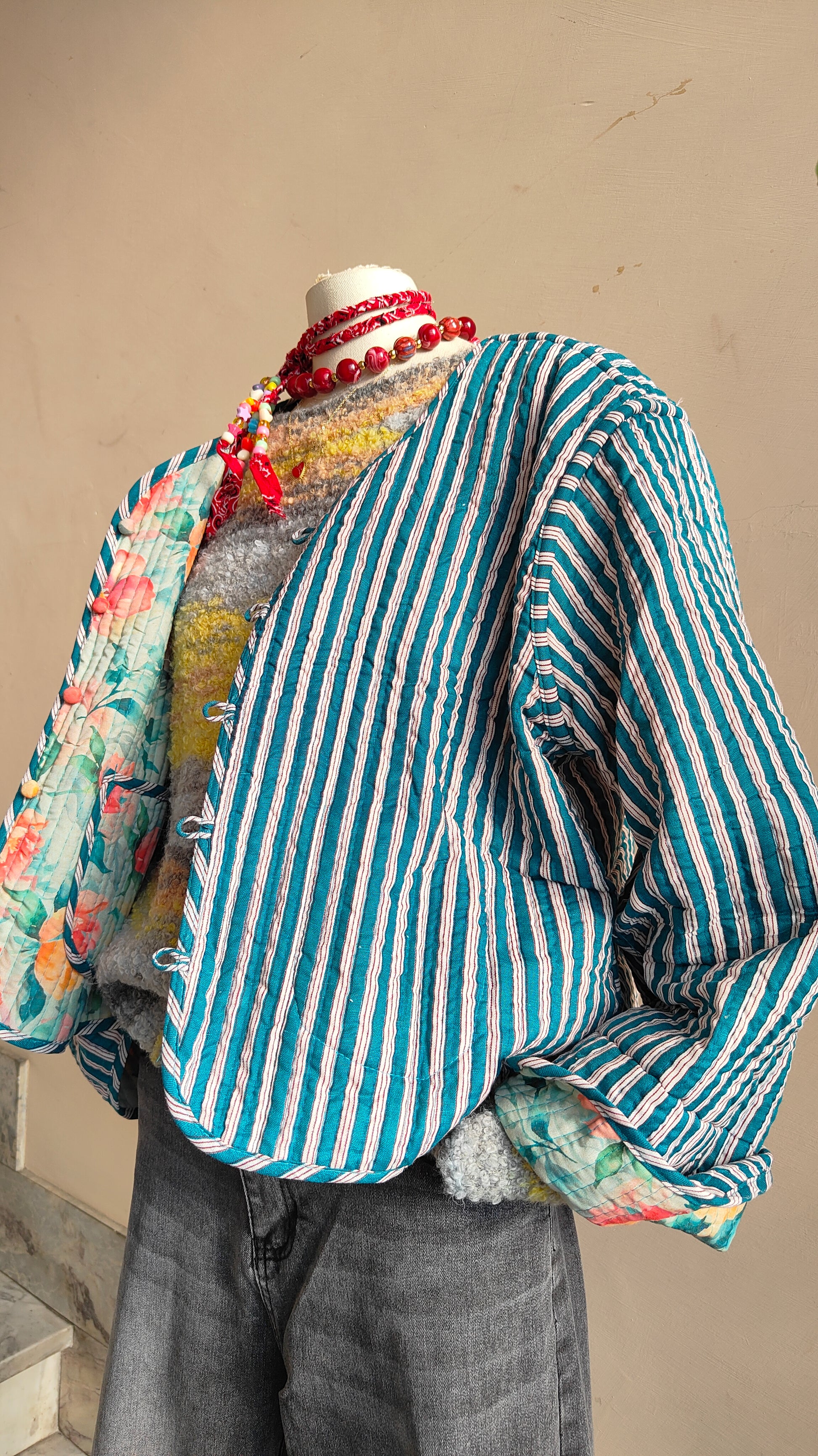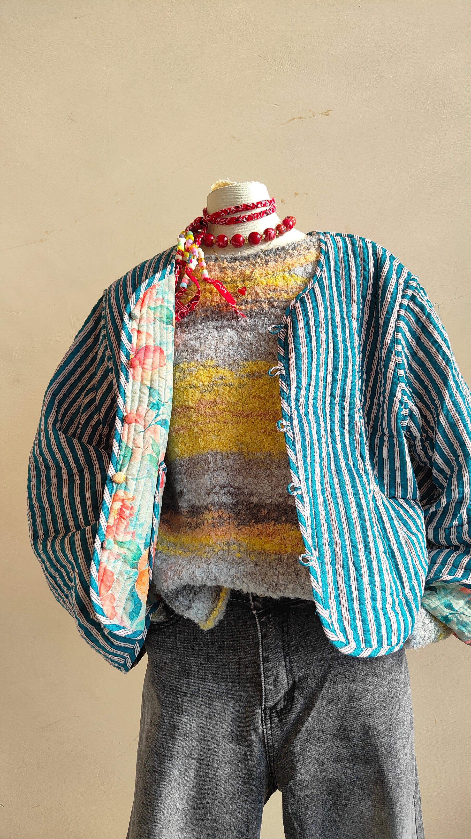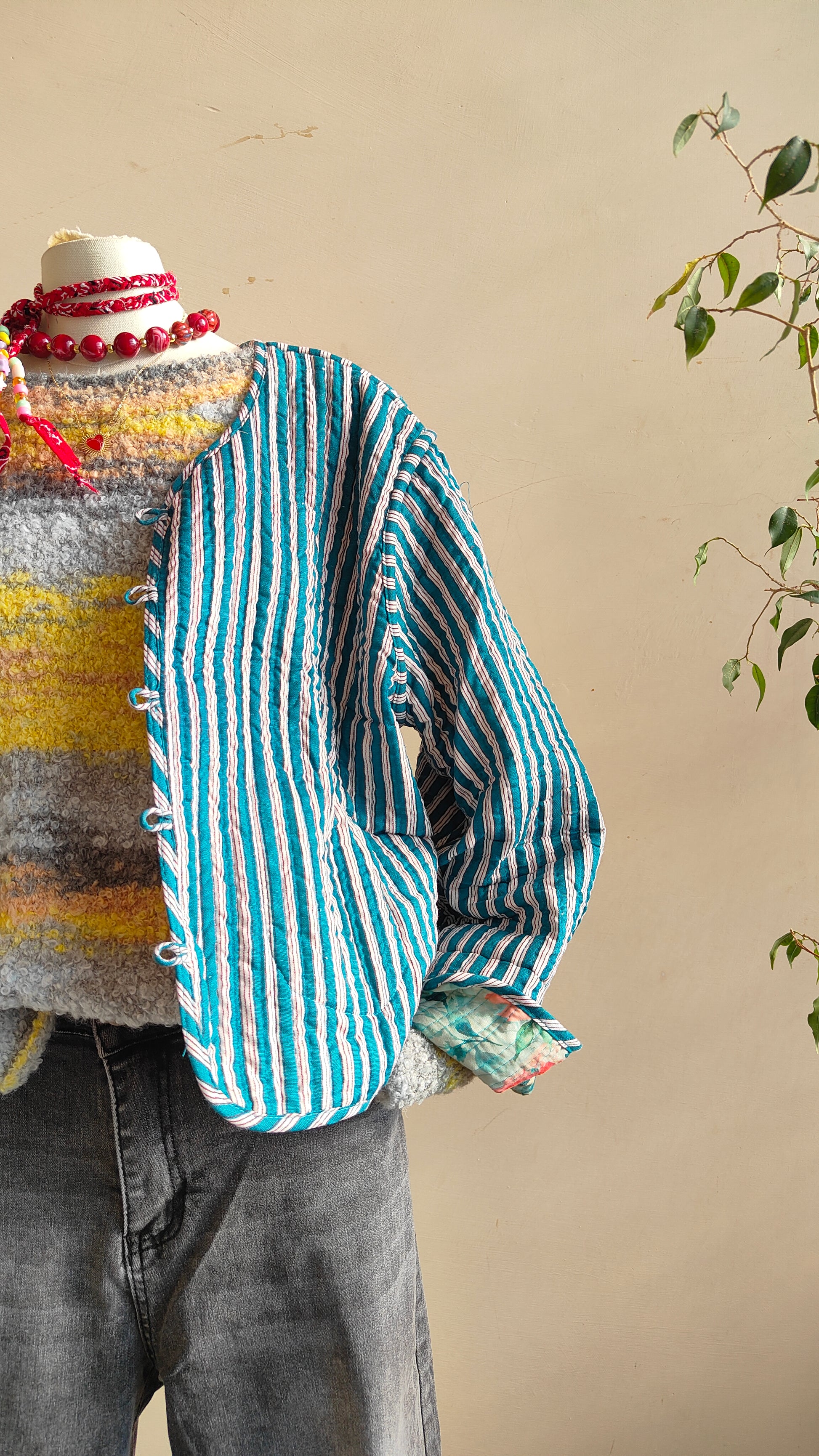Una giacca che non passa inosservata, leggera, divertente e completamente reversibile. Funfair è il capo perfetto per chi ama cambiare stile con un gesto: da un lato una fantasia originale e giocosa con stampa effetto patch, dall’altro una base a righe più delicata e fresca.