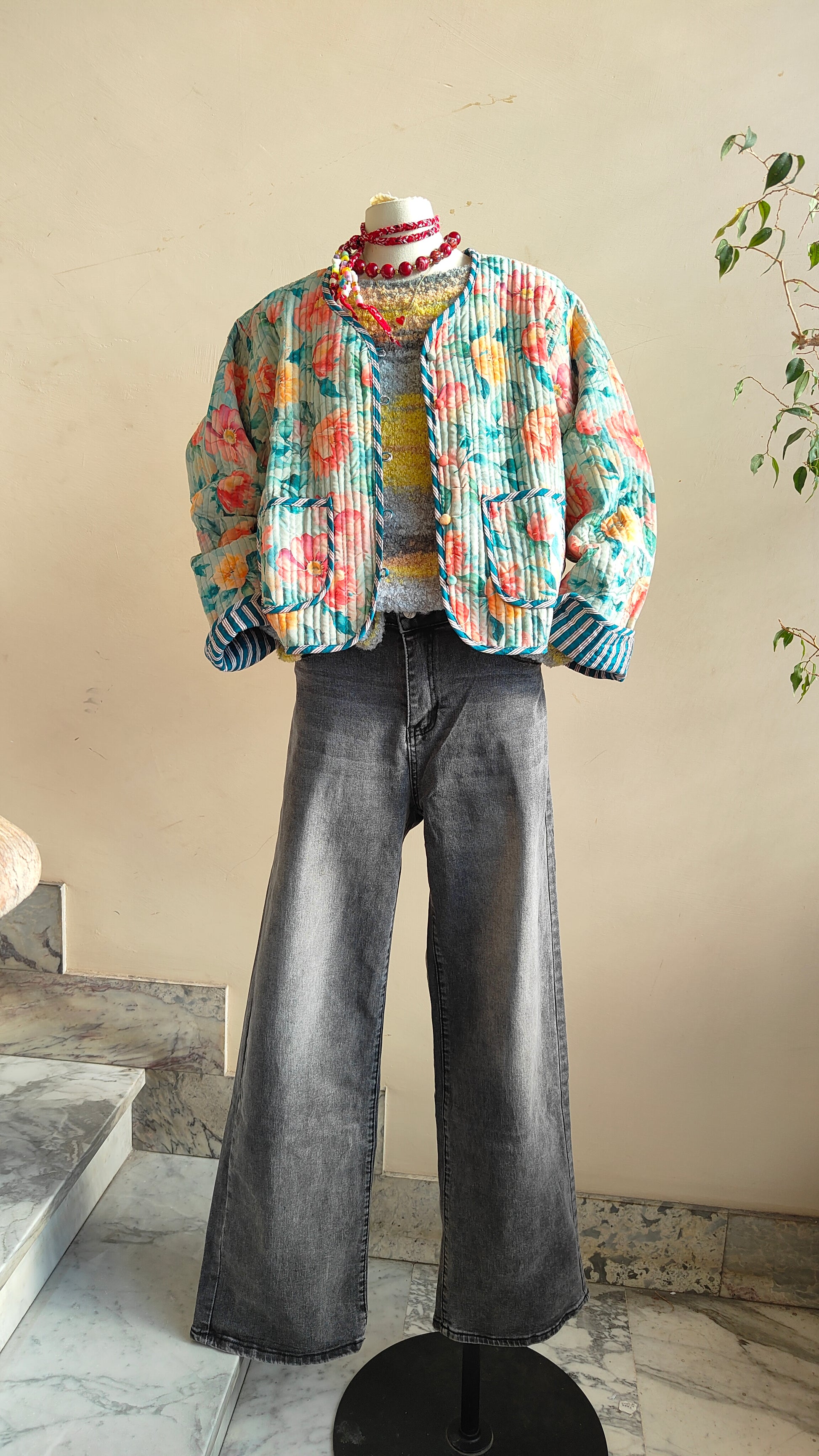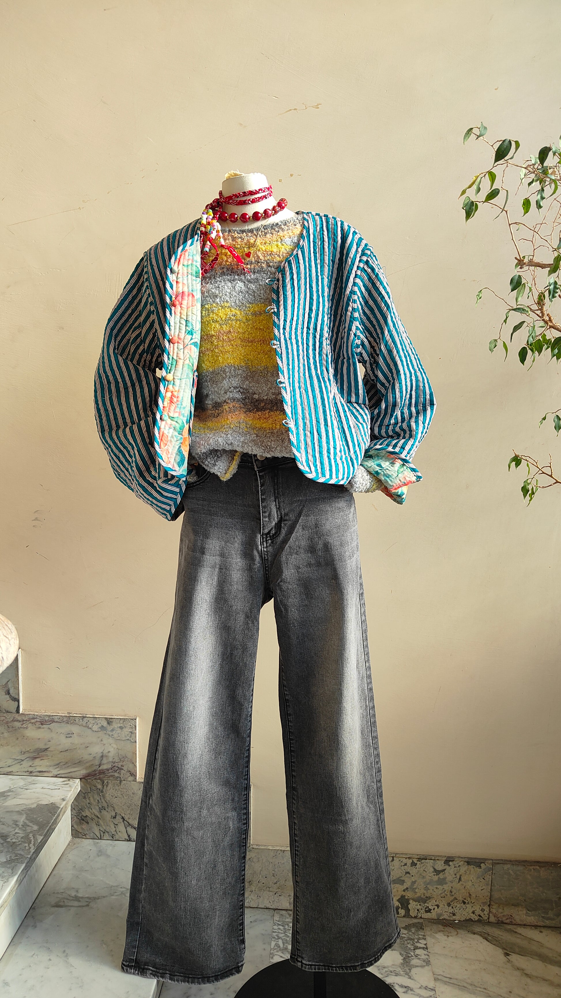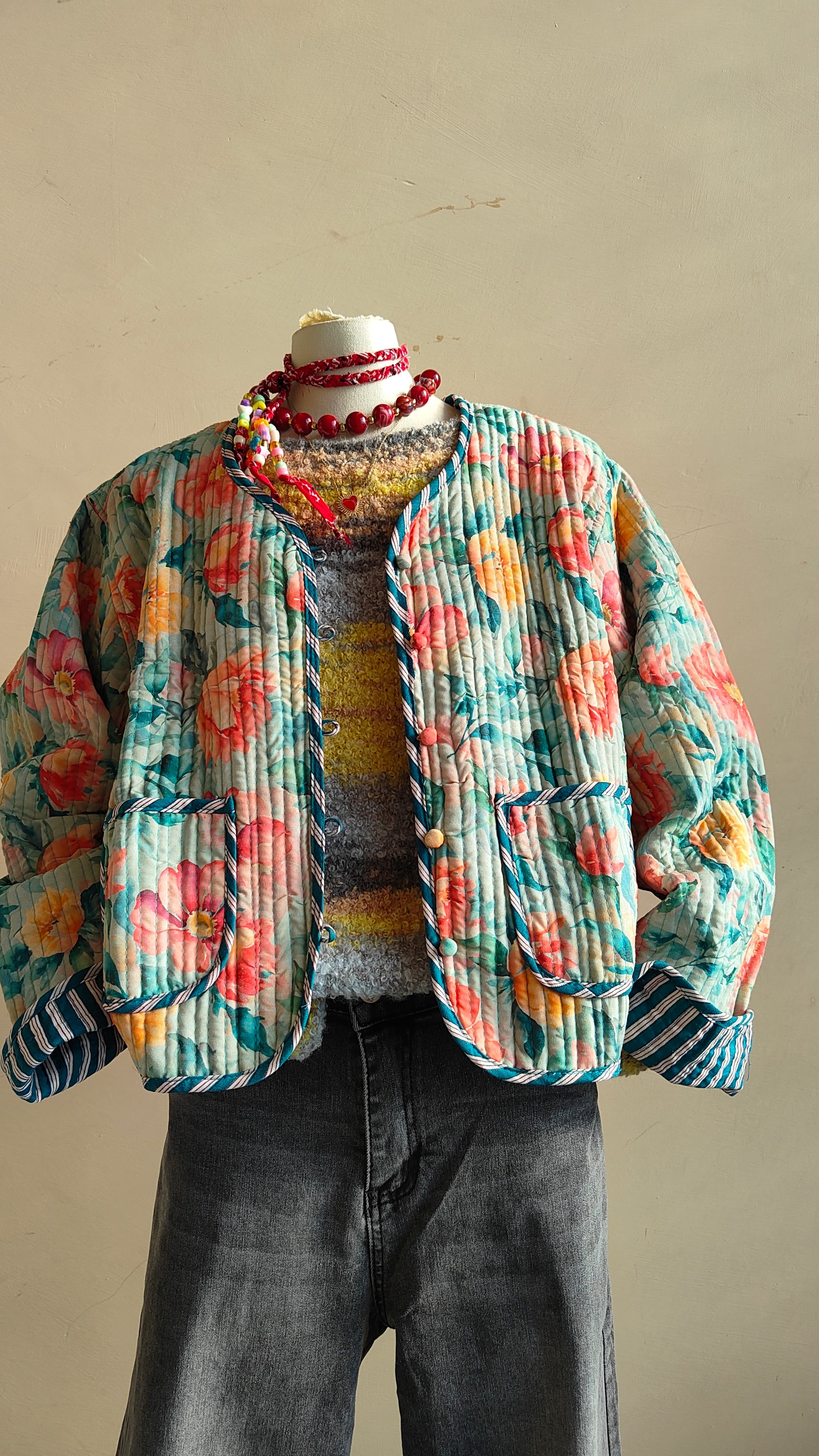 Una giacca che non passa inosservata, leggera, divertente e completamente reversibile. Funfair è il capo perfetto per chi ama cambiare stile con un gesto: da un lato una fantasia originale e giocosa con stampa effetto patch, dall’altro una base a righe più delicata e fresca.