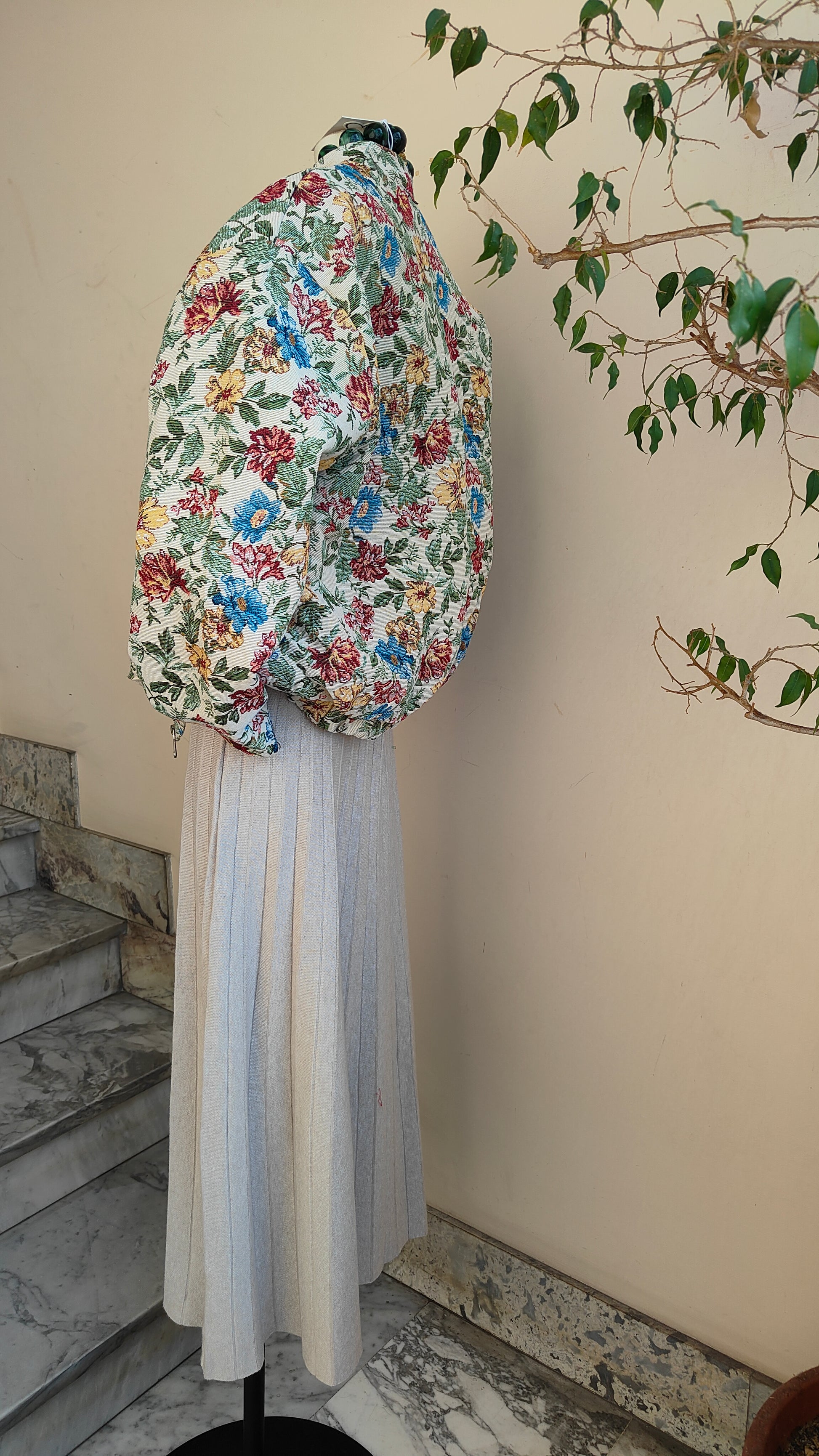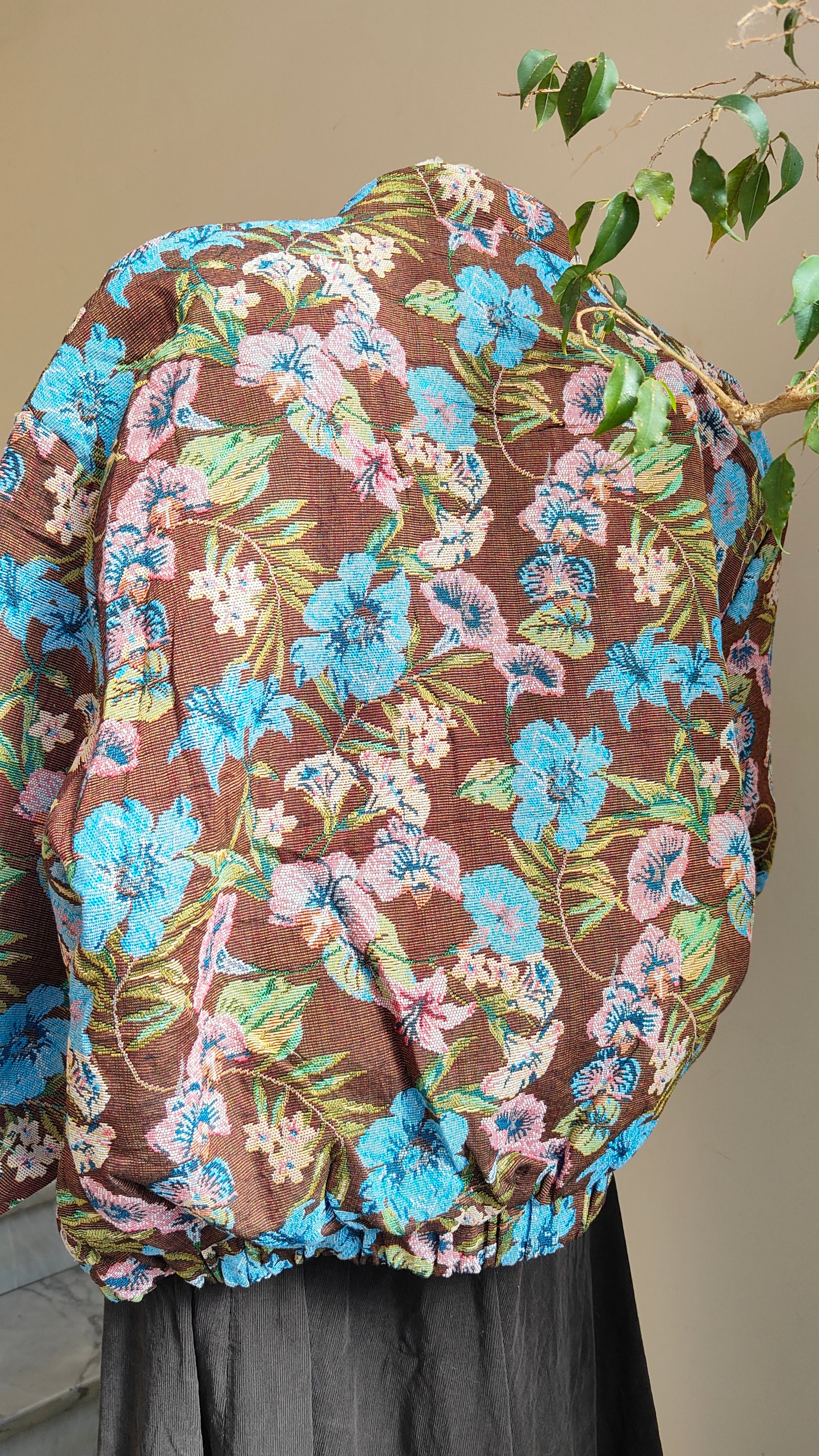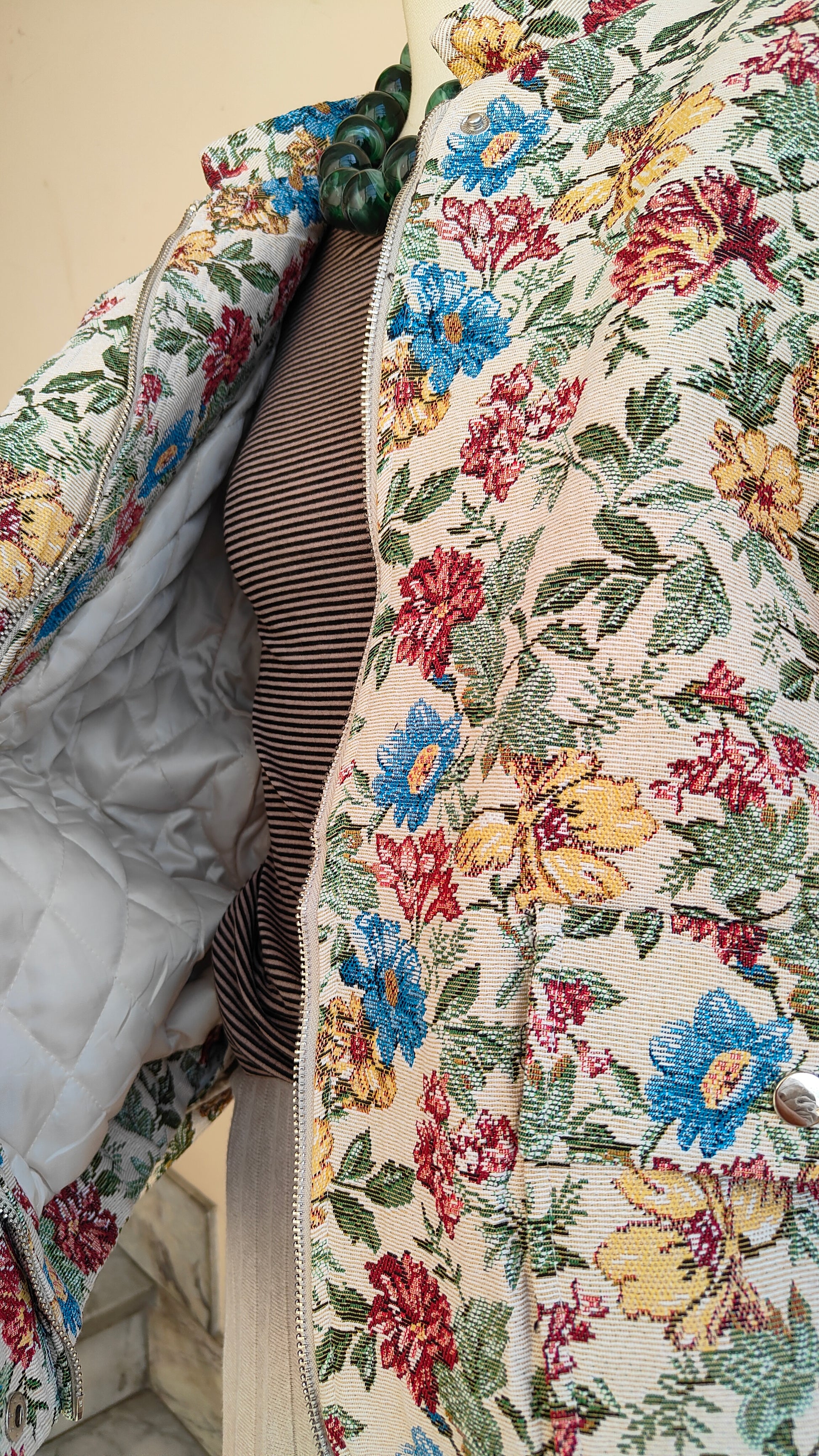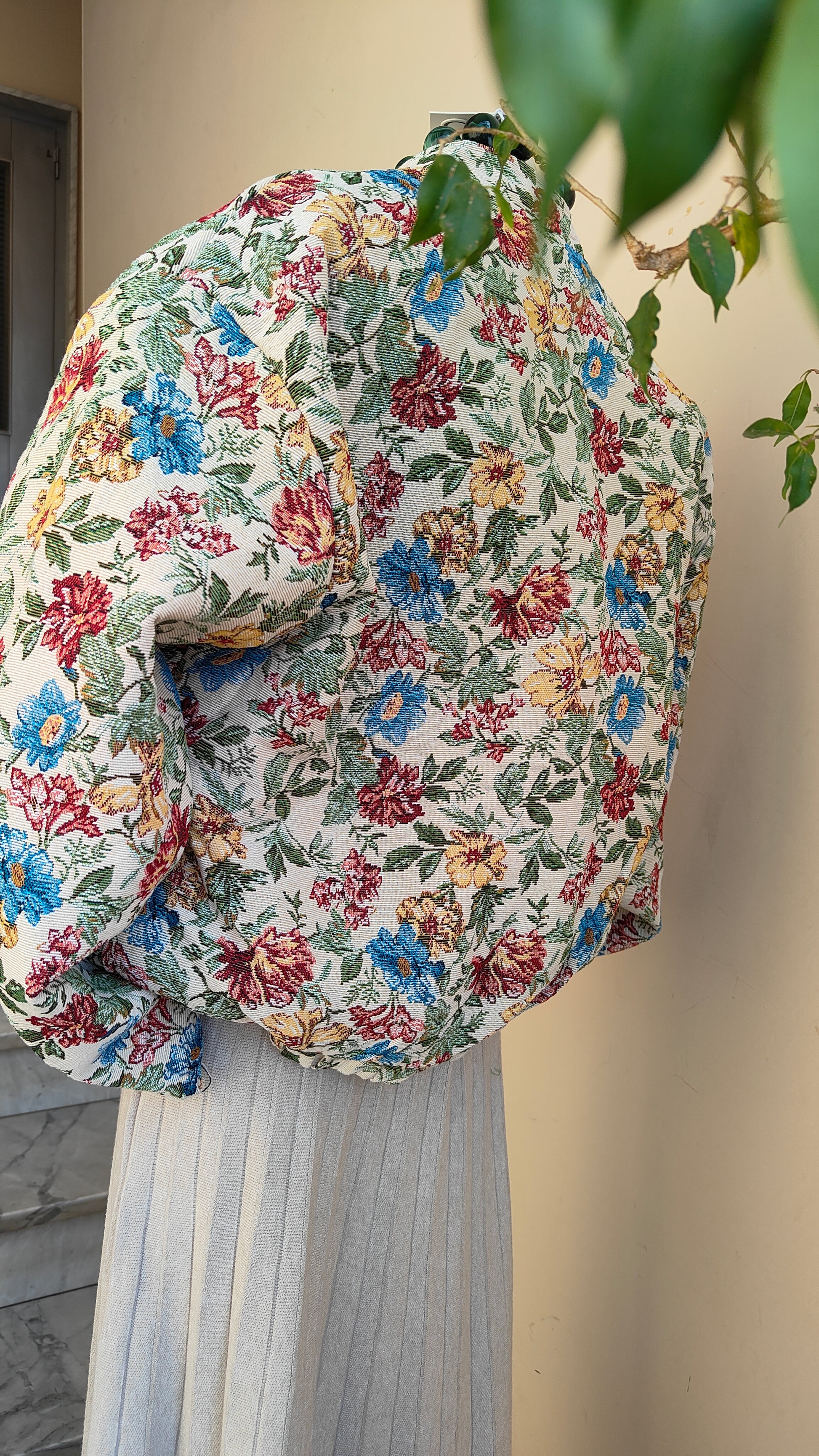 Un bomber dallo stile unico, con tessuto lavorato a motivo floreale che dona carattere e originalità a ogni look. La vestibilità ampia lo rende comodo e versatile, perfetto da indossare sia su outfit casual che più ricercati. L’interno trapuntato garantisce calore e comfort, mentre la zip frontale e i dettagli elastici sul fondo completano il design.
