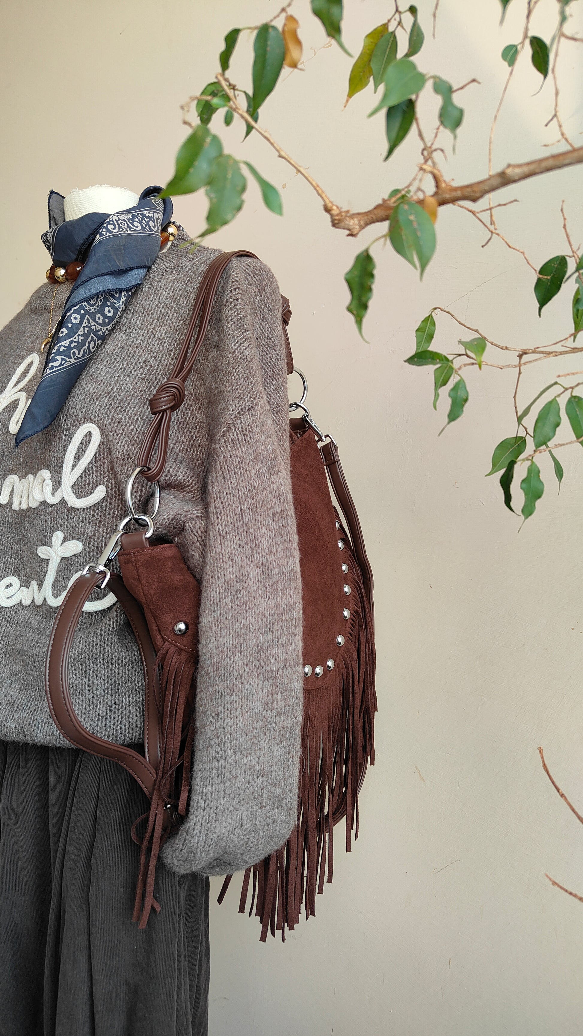 Una borsa dall’anima boho e decisa, impreziosita da frange morbide e piccole borchie che creano un disegno elegante e ricercato.