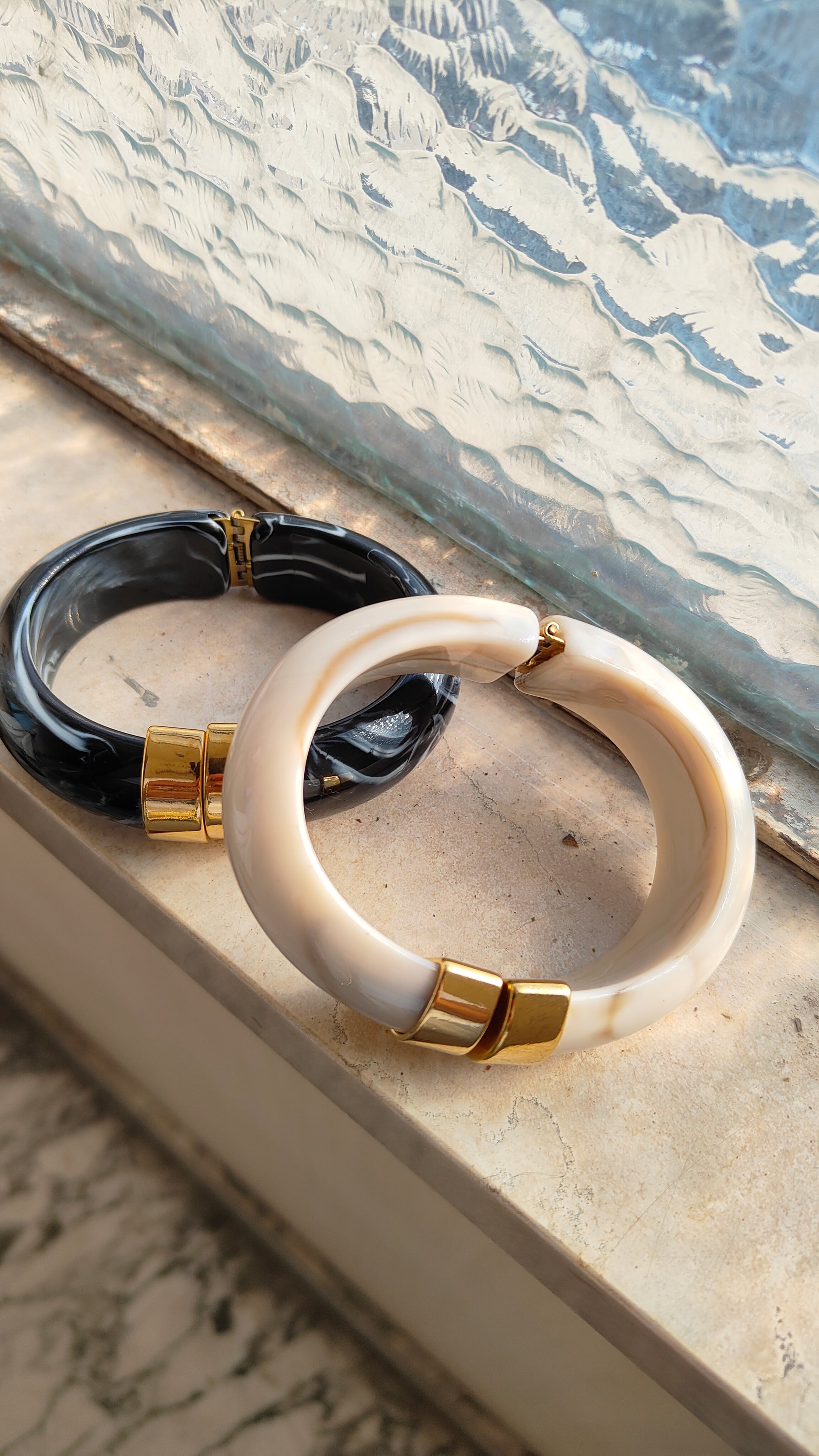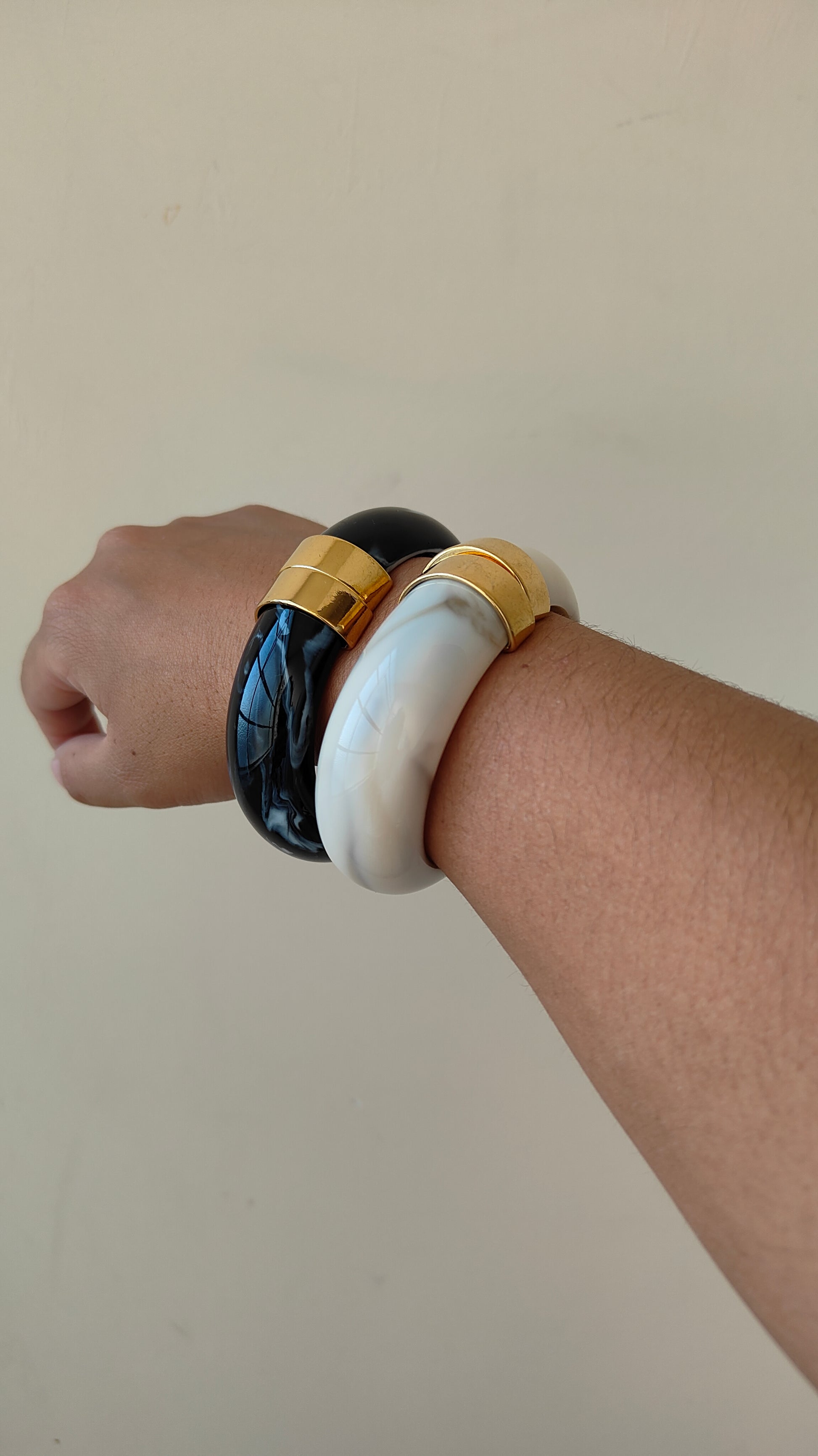 Descrizione prodotto: Un bracciale dal design deciso e contemporaneo, realizzato in resina lucida con dettagli metallici dorati. La sua forma bold e la superficie levigata lo rendono un accessorio d’impatto, perfetto per completare look semplici o sofisticati.