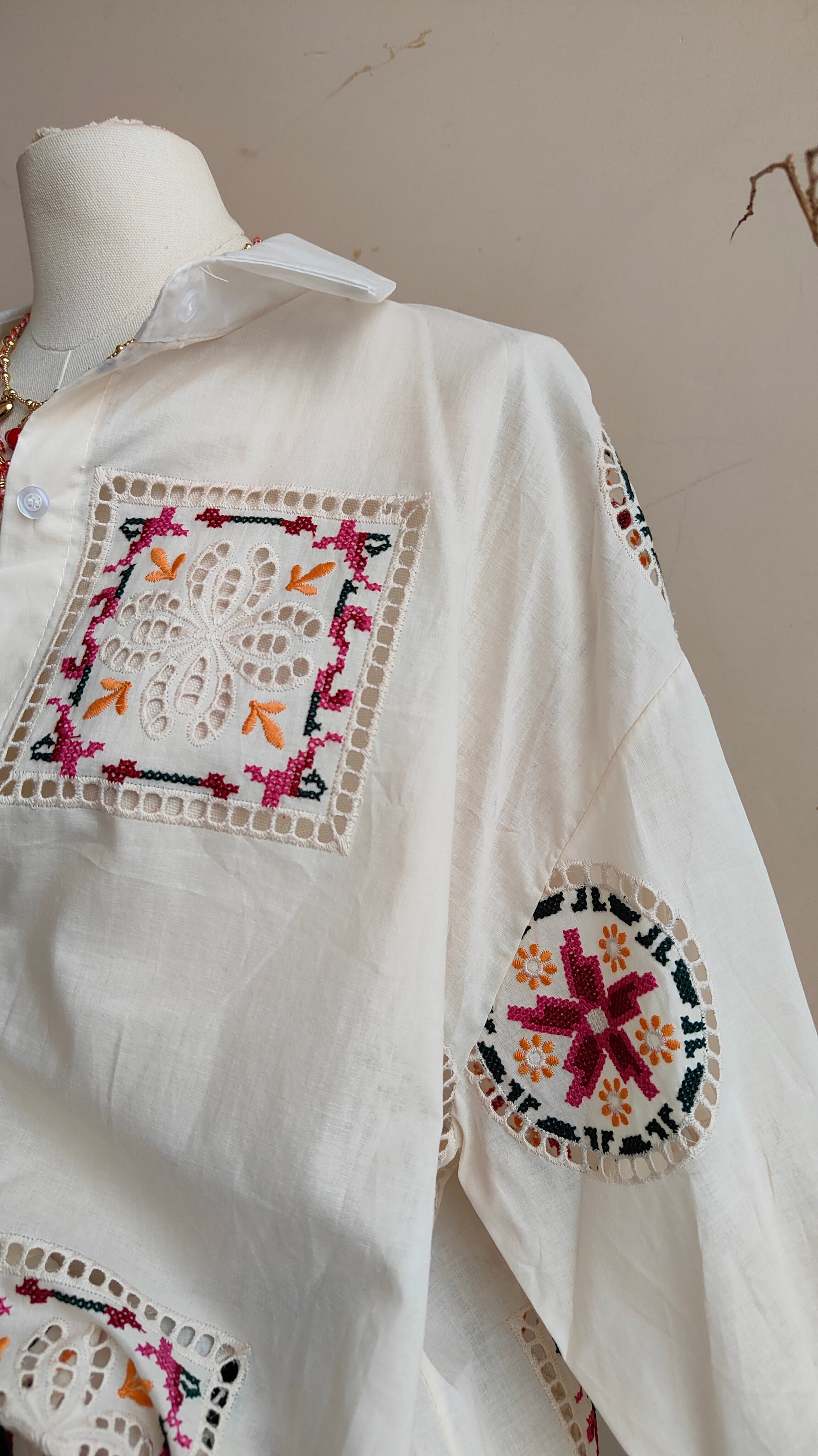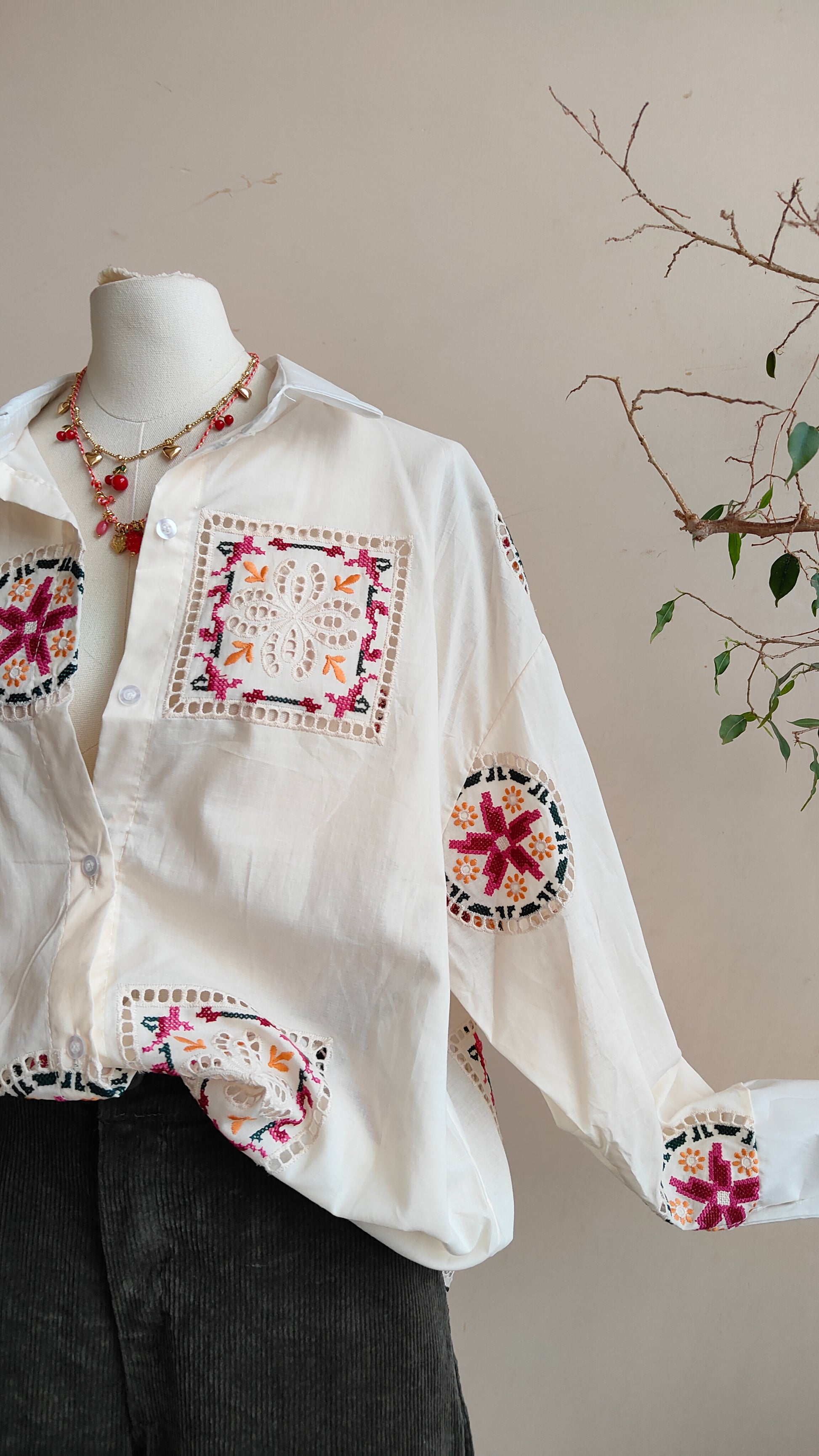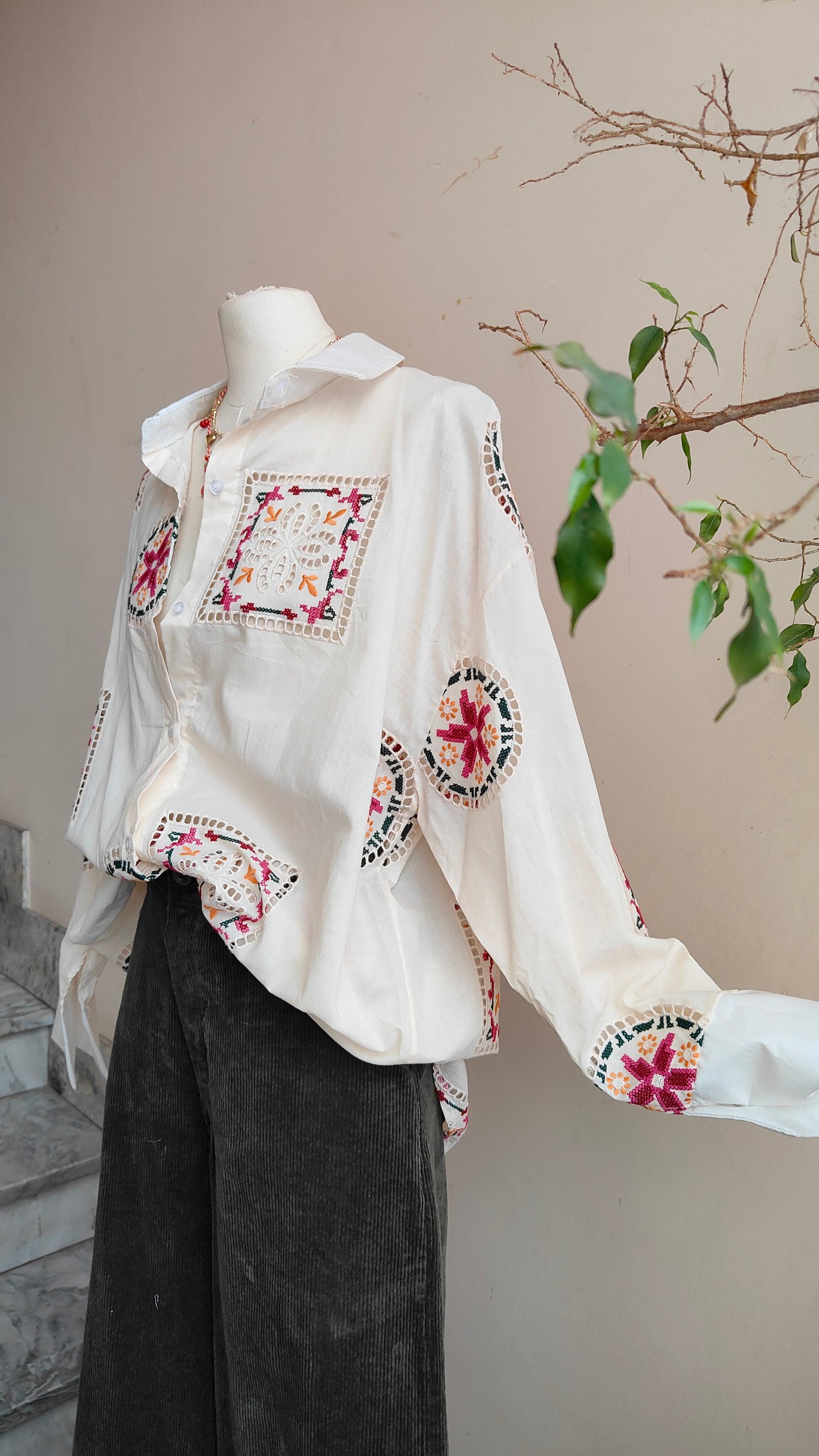 Una camicia dal fascino artigianale, impreziosita da ricami geometrici e floreali che creano un gioco di dettagli delicati e originali. I motivi ricamati applicati rendono ogni capo ricco di personalità, trasformando una camicia classica in un pezzo unico e ricercato.