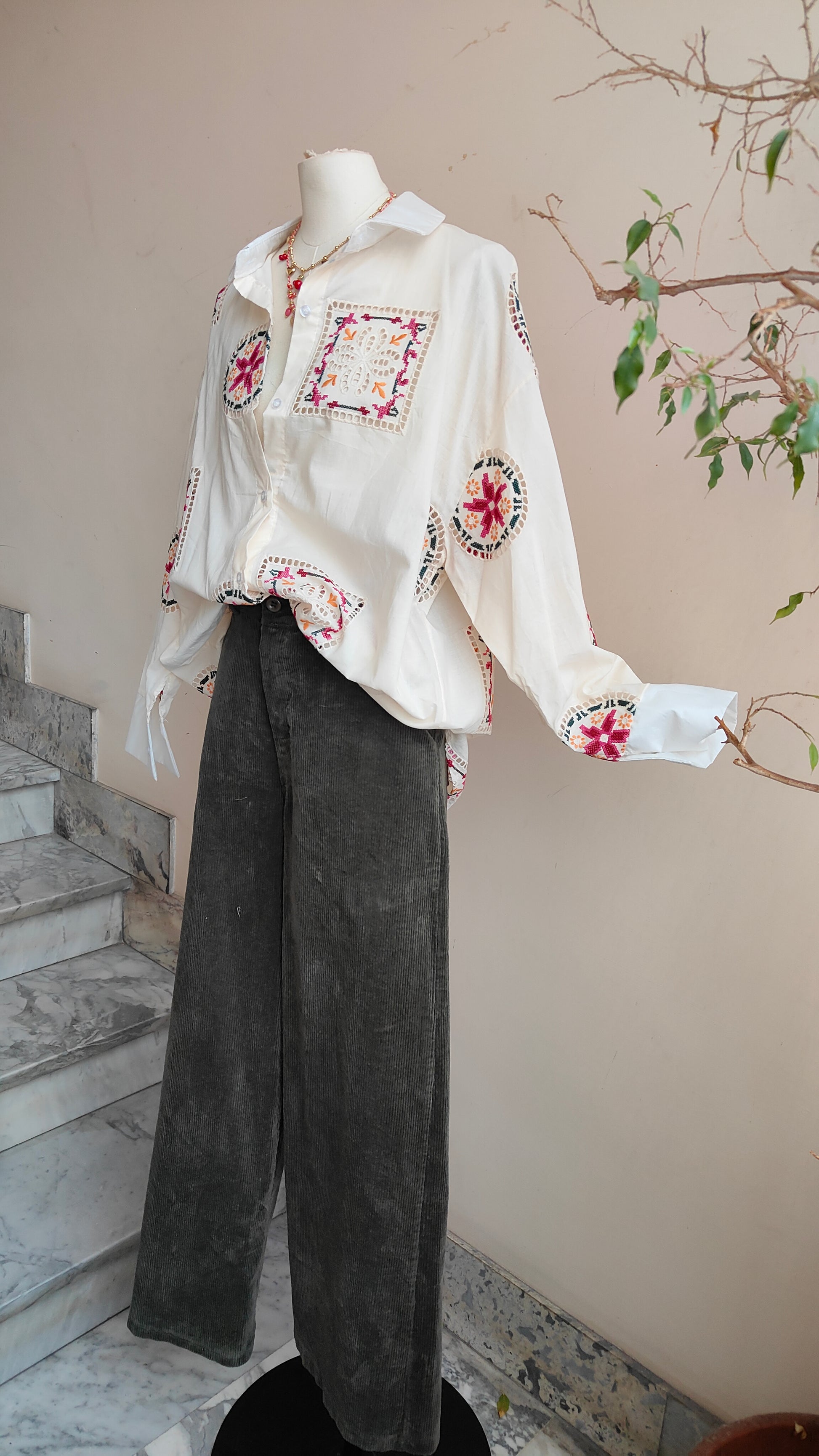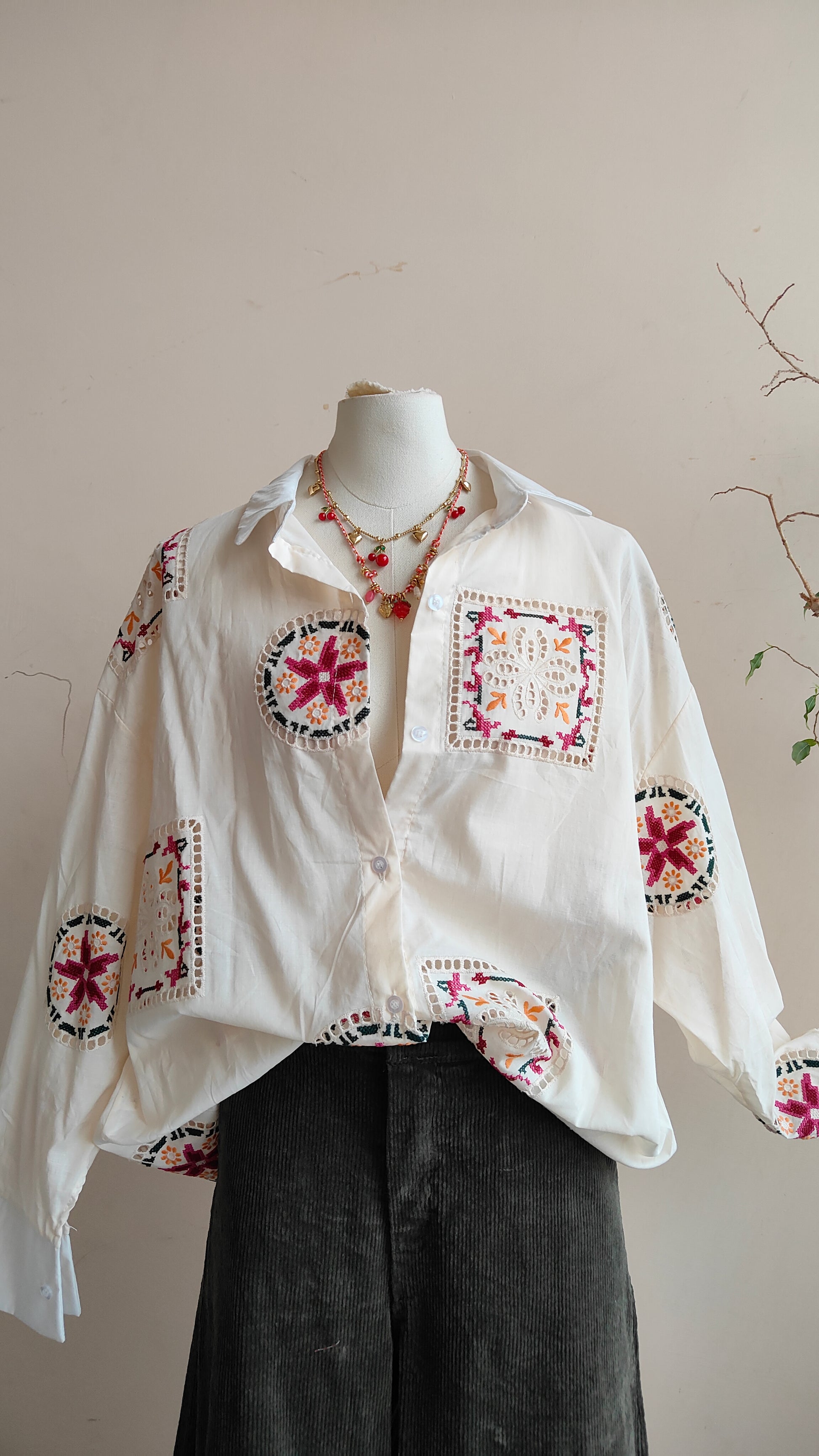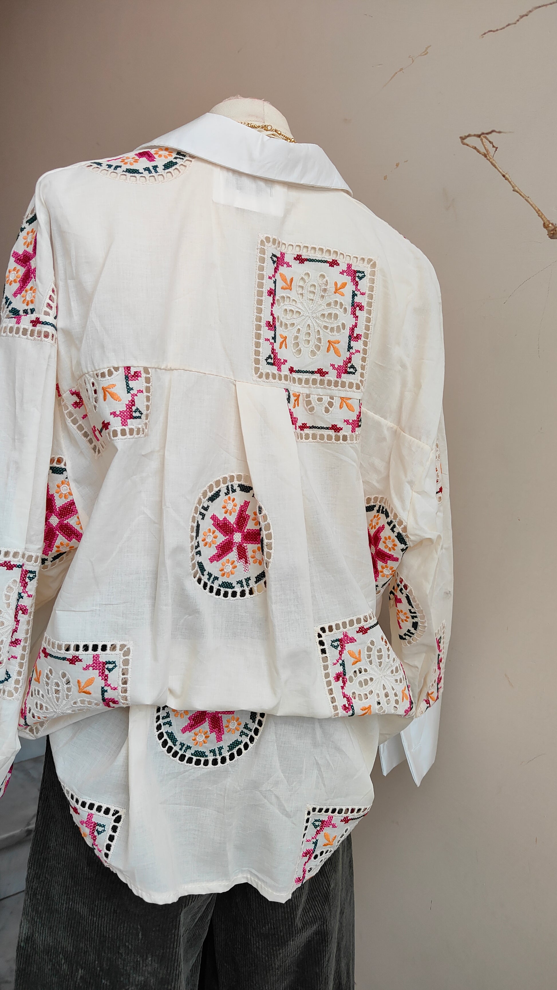 Una camicia dal fascino artigianale, impreziosita da ricami geometrici e floreali che creano un gioco di dettagli delicati e originali. I motivi ricamati applicati rendono ogni capo ricco di personalità, trasformando una camicia classica in un pezzo unico e ricercato.