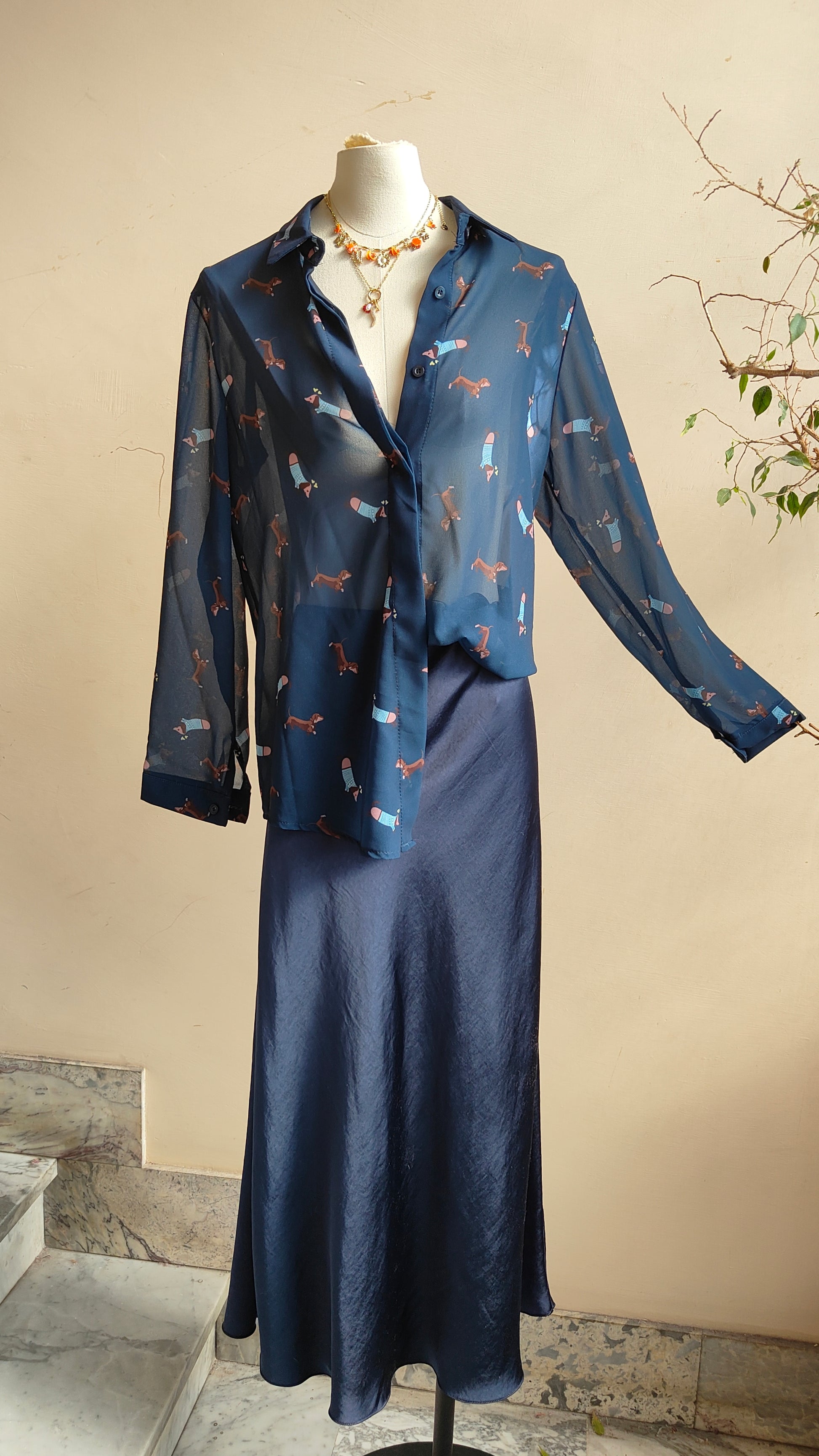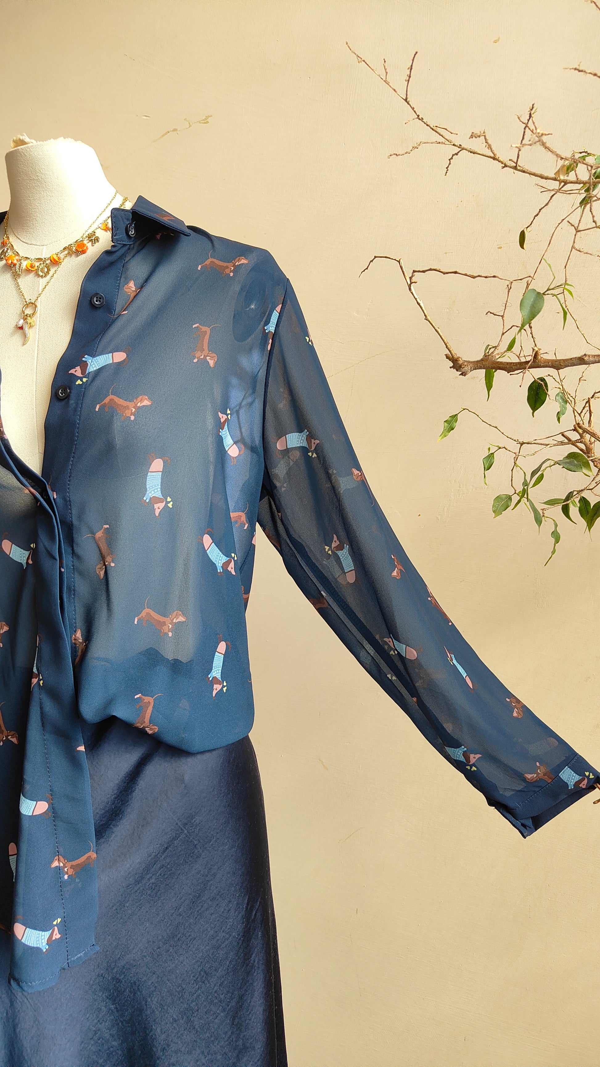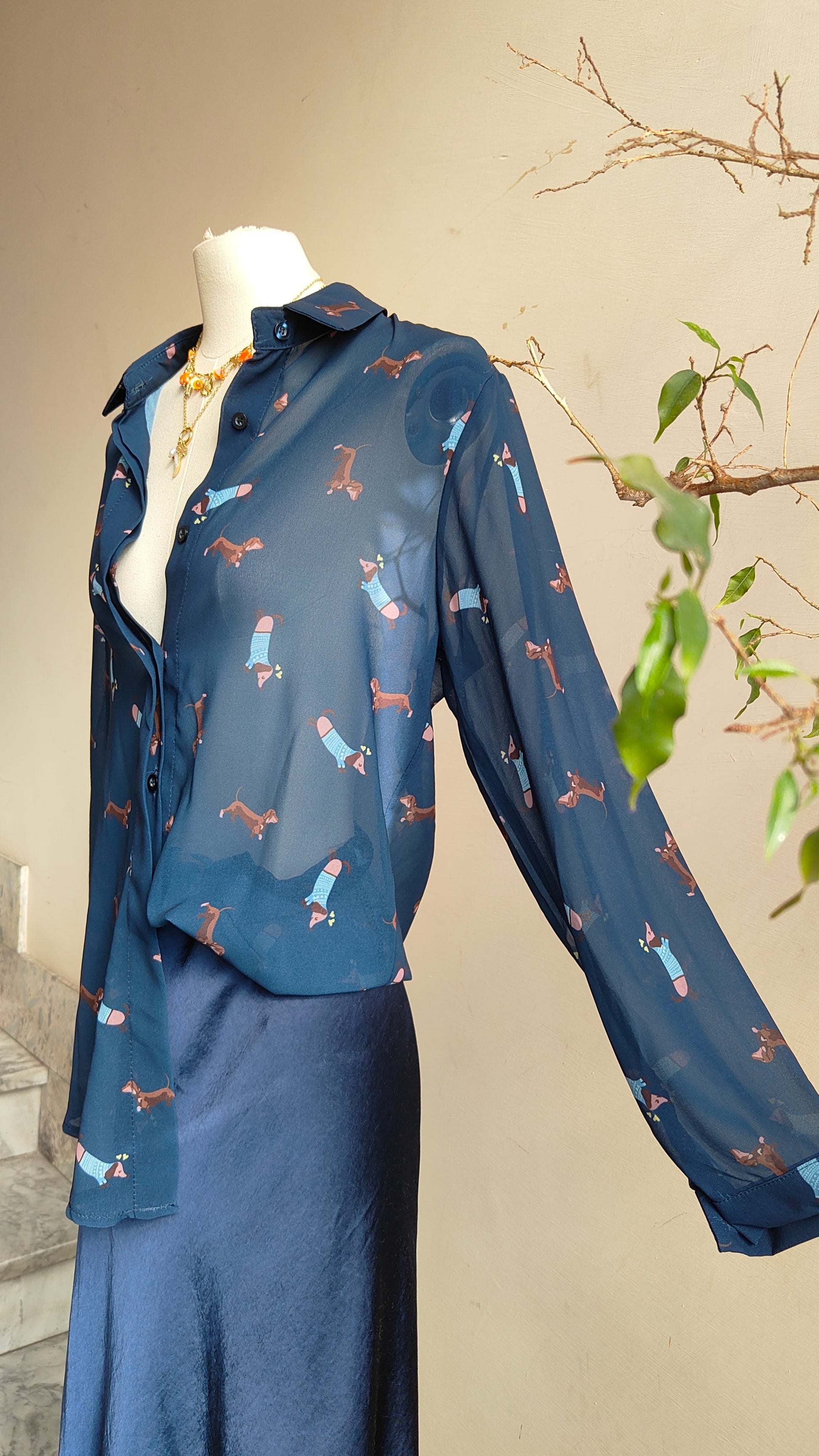 Una camicia originale e giocosa caratterizzata da una stampa con piccoli bassotti che aggiunge un tocco di personalità al look. Il design classico con colletto e abbottonatura frontale si unisce a una fantasia particolare che rende il capo unico e immediatamente riconoscibile.