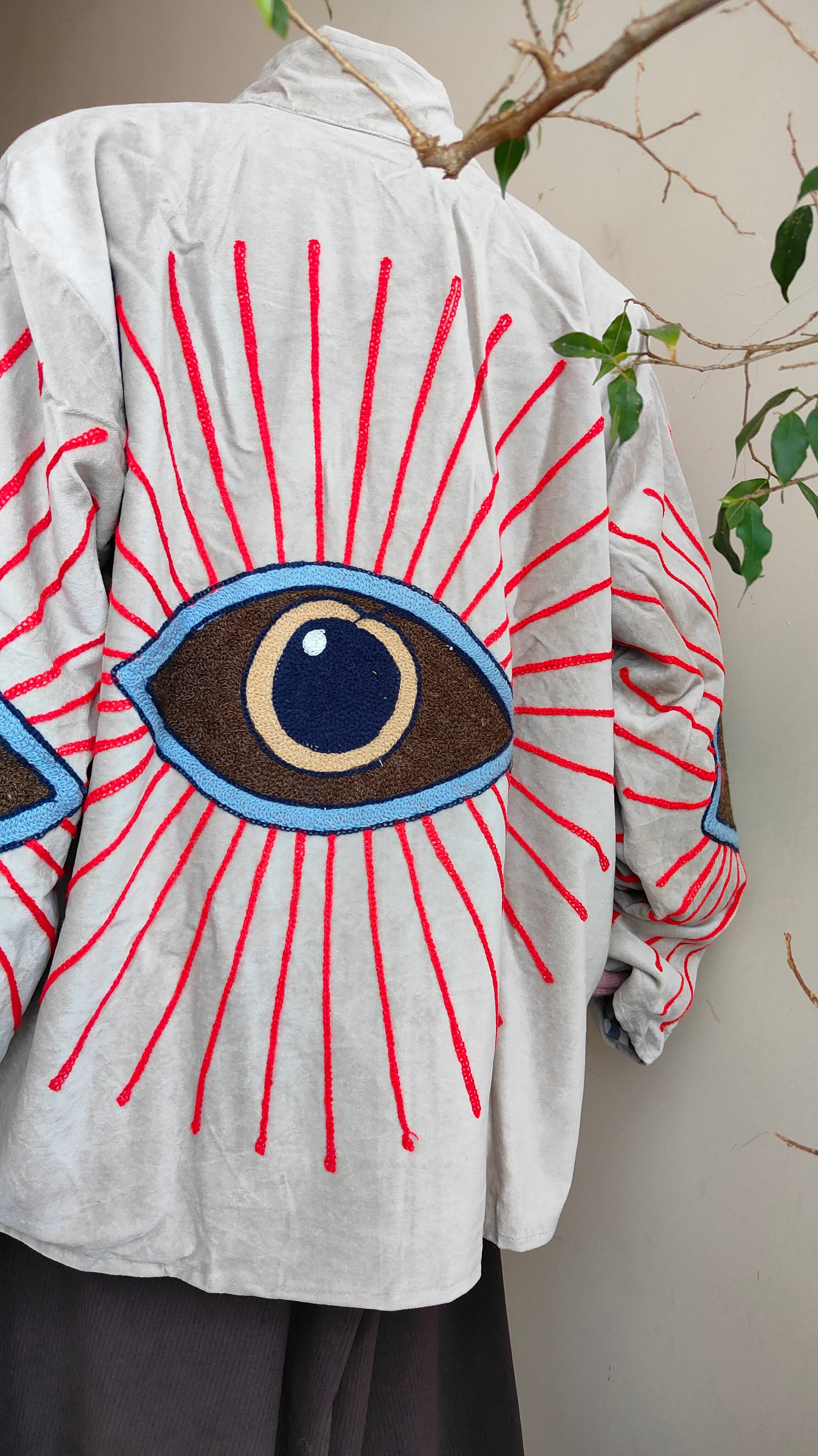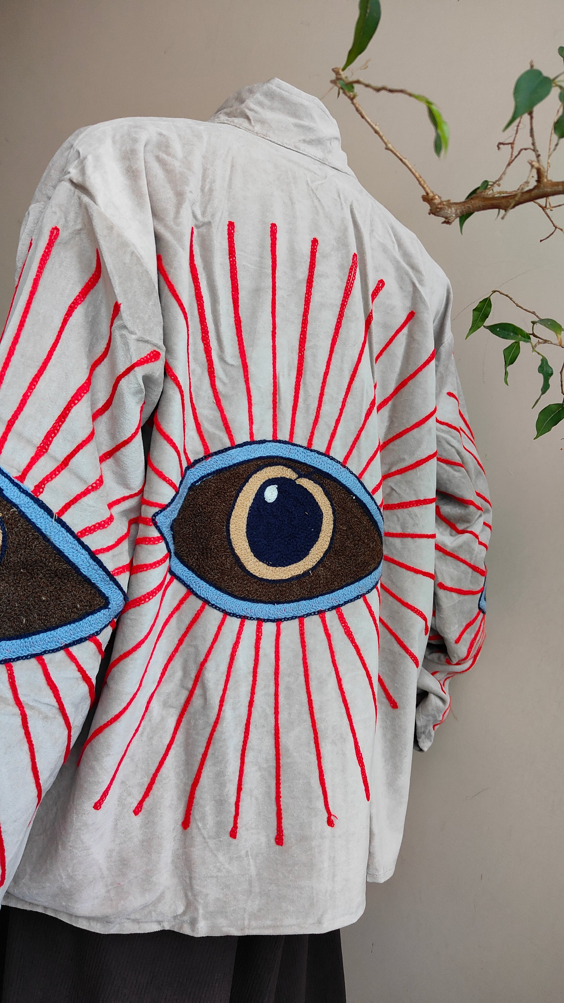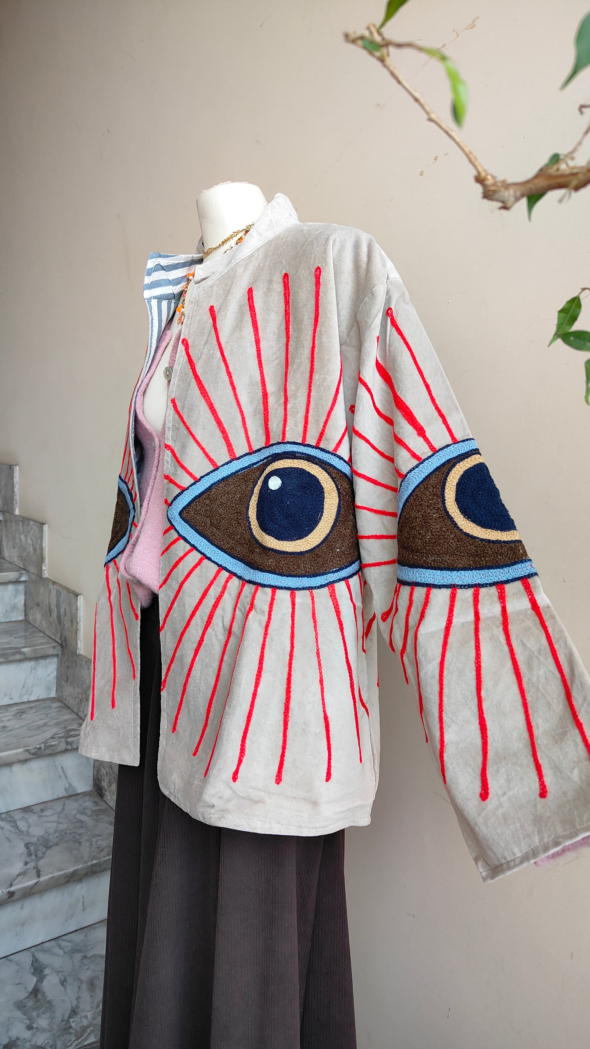 Giacca double face dal carattere boho e ricercato, pensata per dare personalità a ogni look. Da un lato presenta un ricco ricamo floreale con dettagli in rilievo, dall’altro una fantasia più essenziale e versatile, ideale per cambiare stile con un semplice gesto.