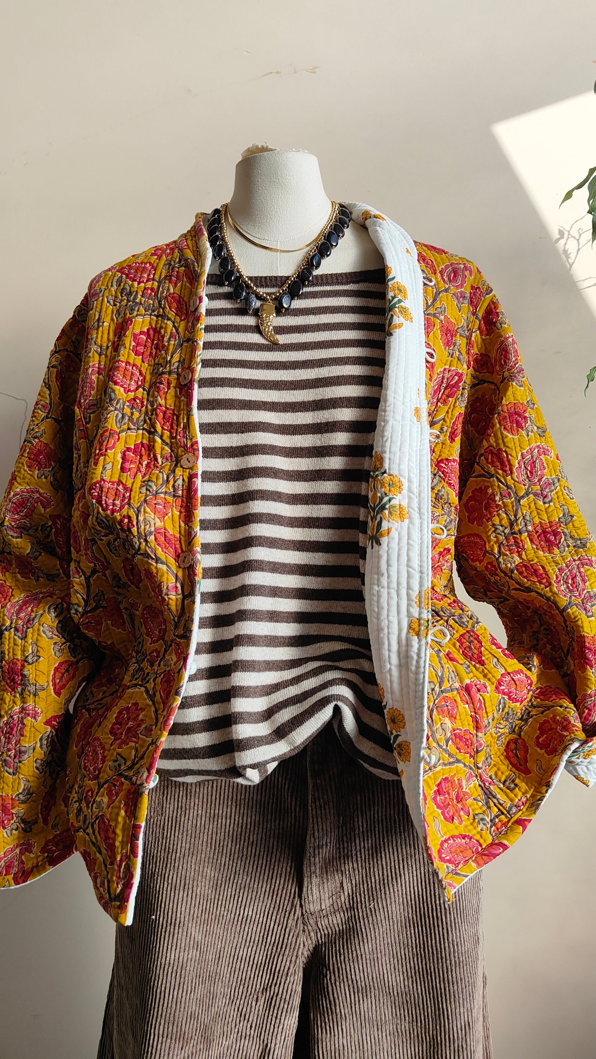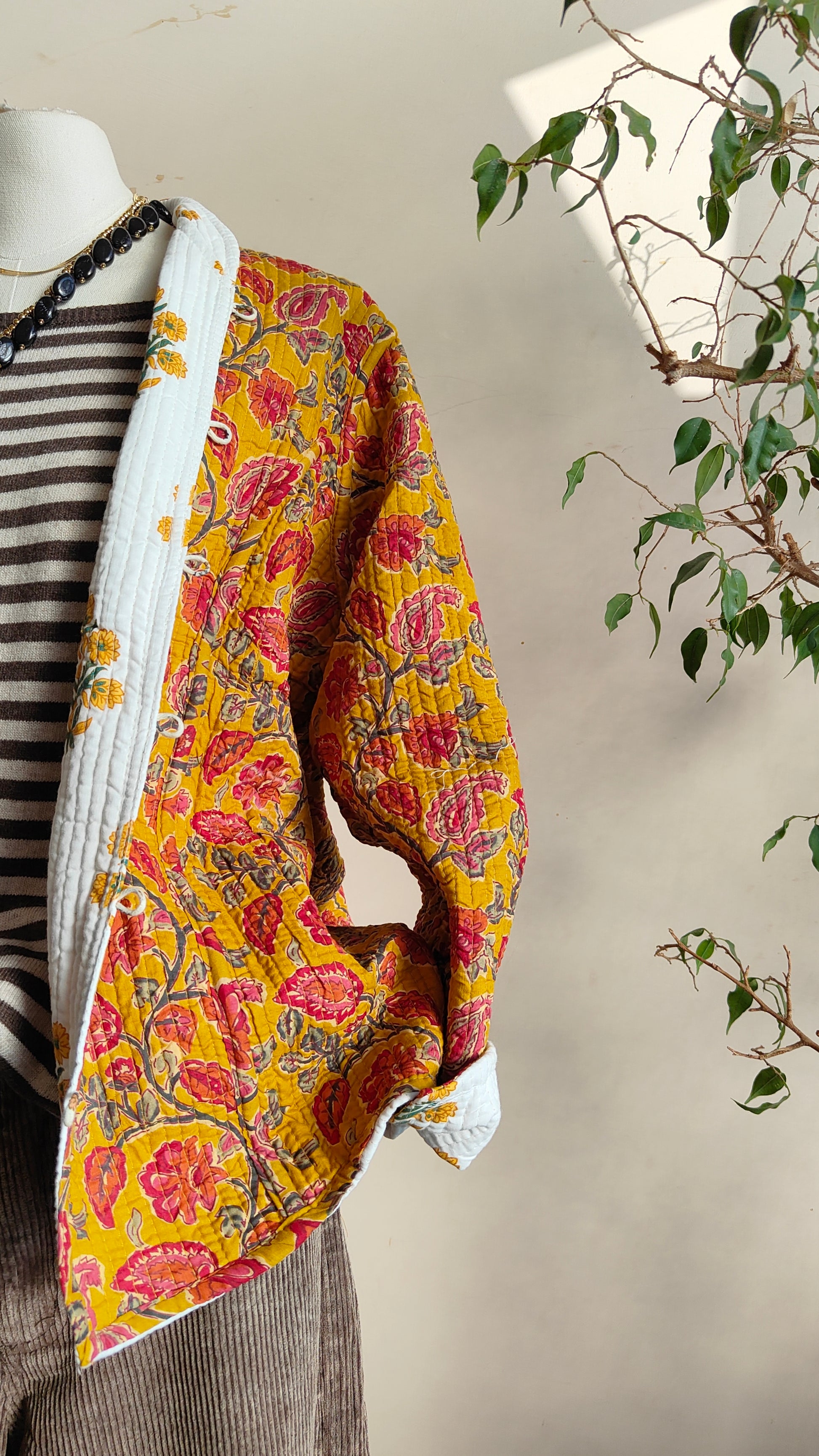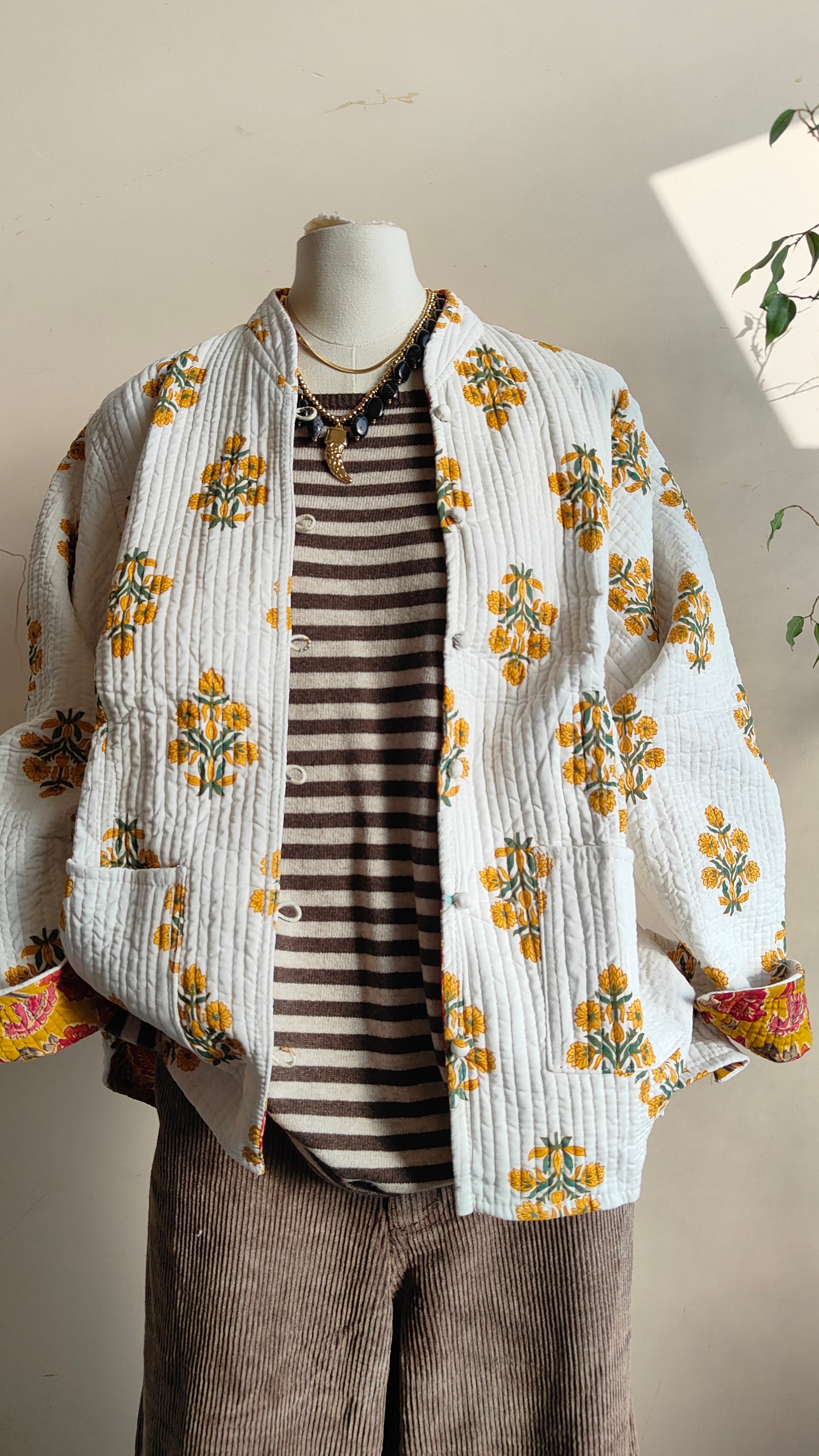 La linea morbida e il tessuto leggermente trapuntato la rendono perfetta per la mezza stagione. Indossarla aperta su un abito o stringi in vita con una cintura per un look più definito.