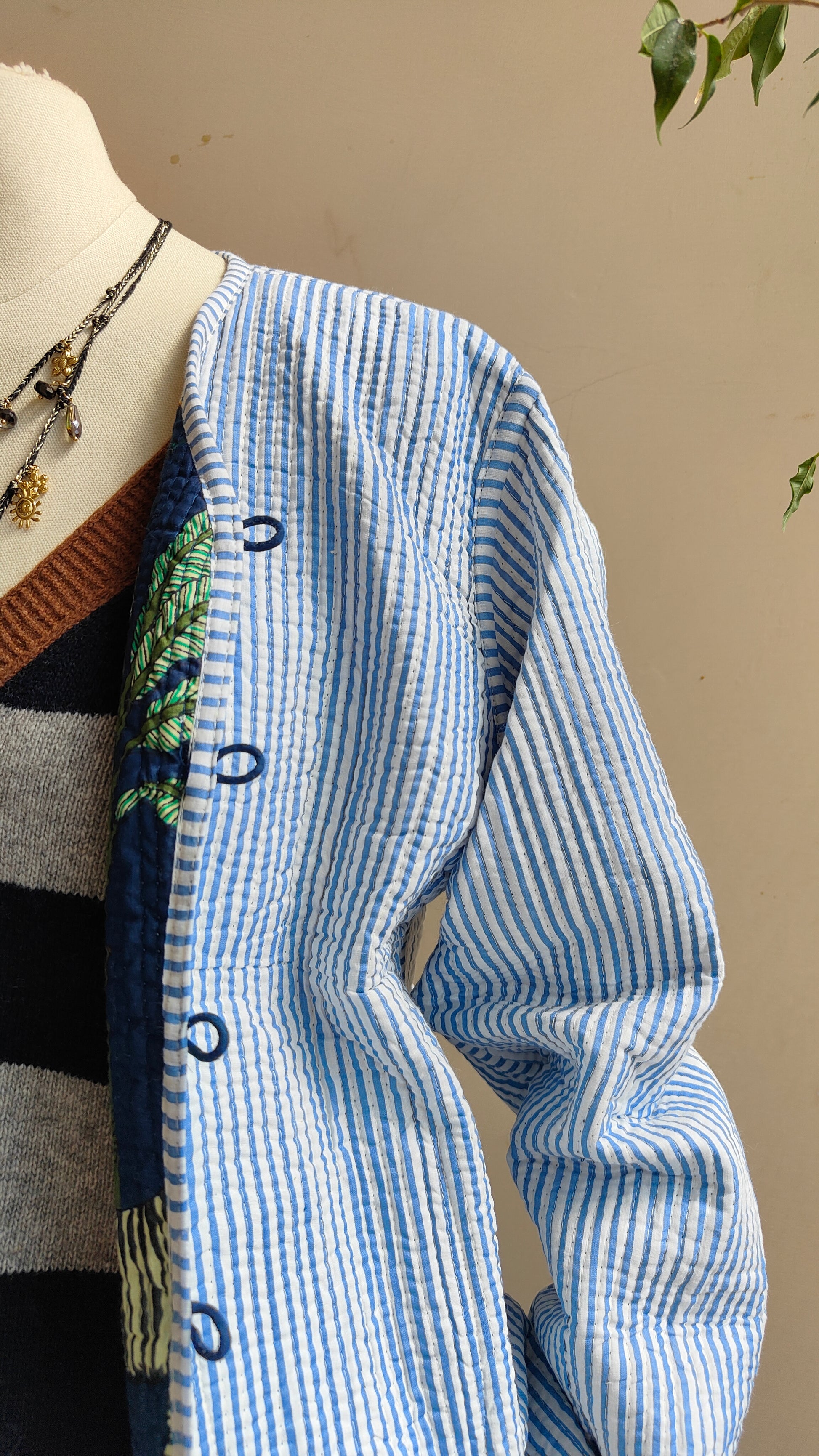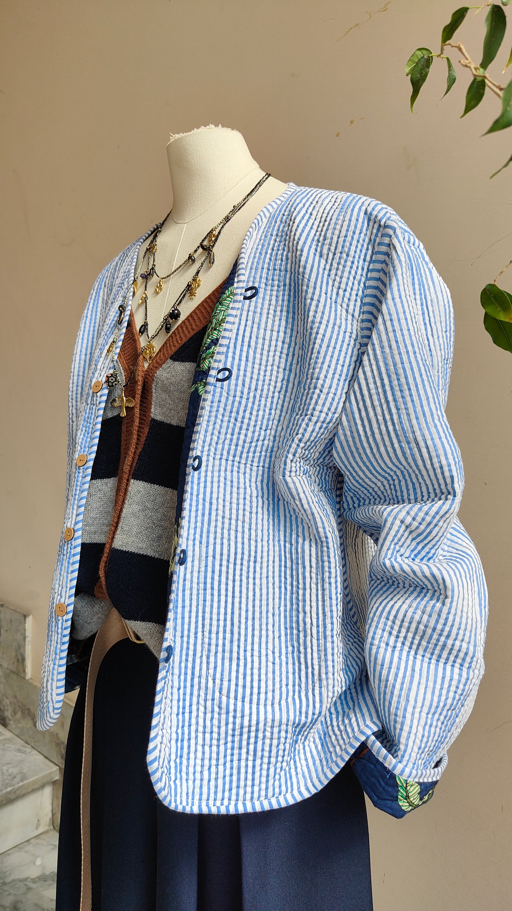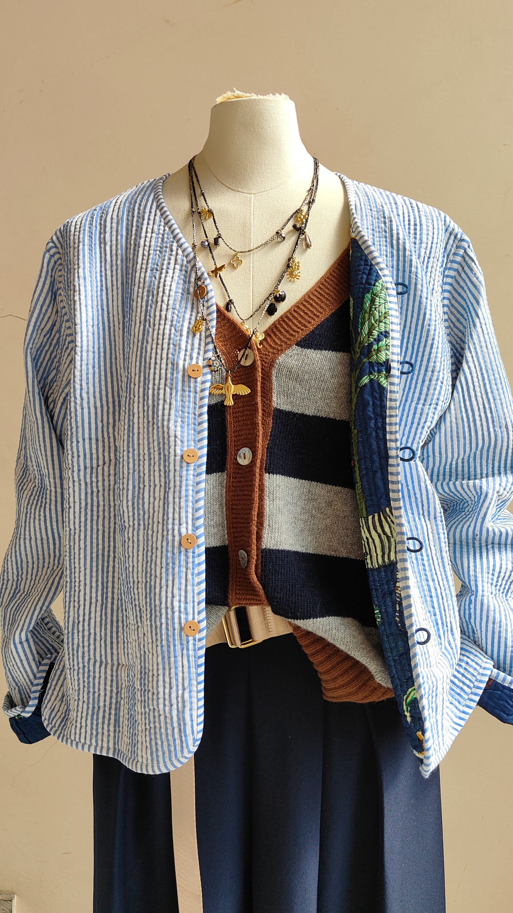 Una giacca che non passa inosservata, leggera, divertente e completamente reversibile. Funfair è il capo perfetto per chi ama cambiare stile con un gesto: da un lato una fantasia originale e giocosa con stampa effetto patch, dall’altro una base a righe più delicata e fresca.