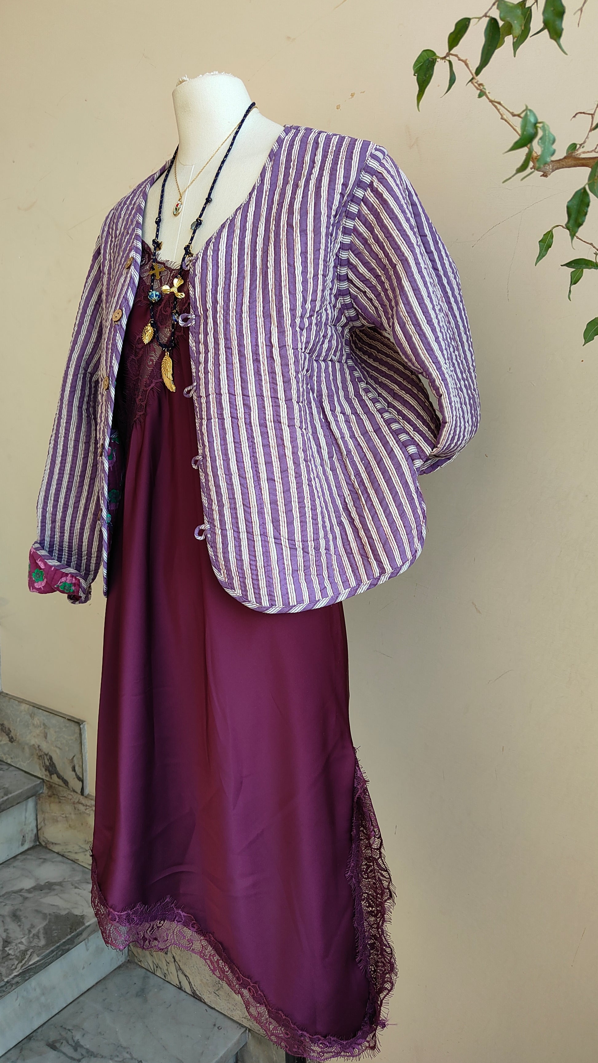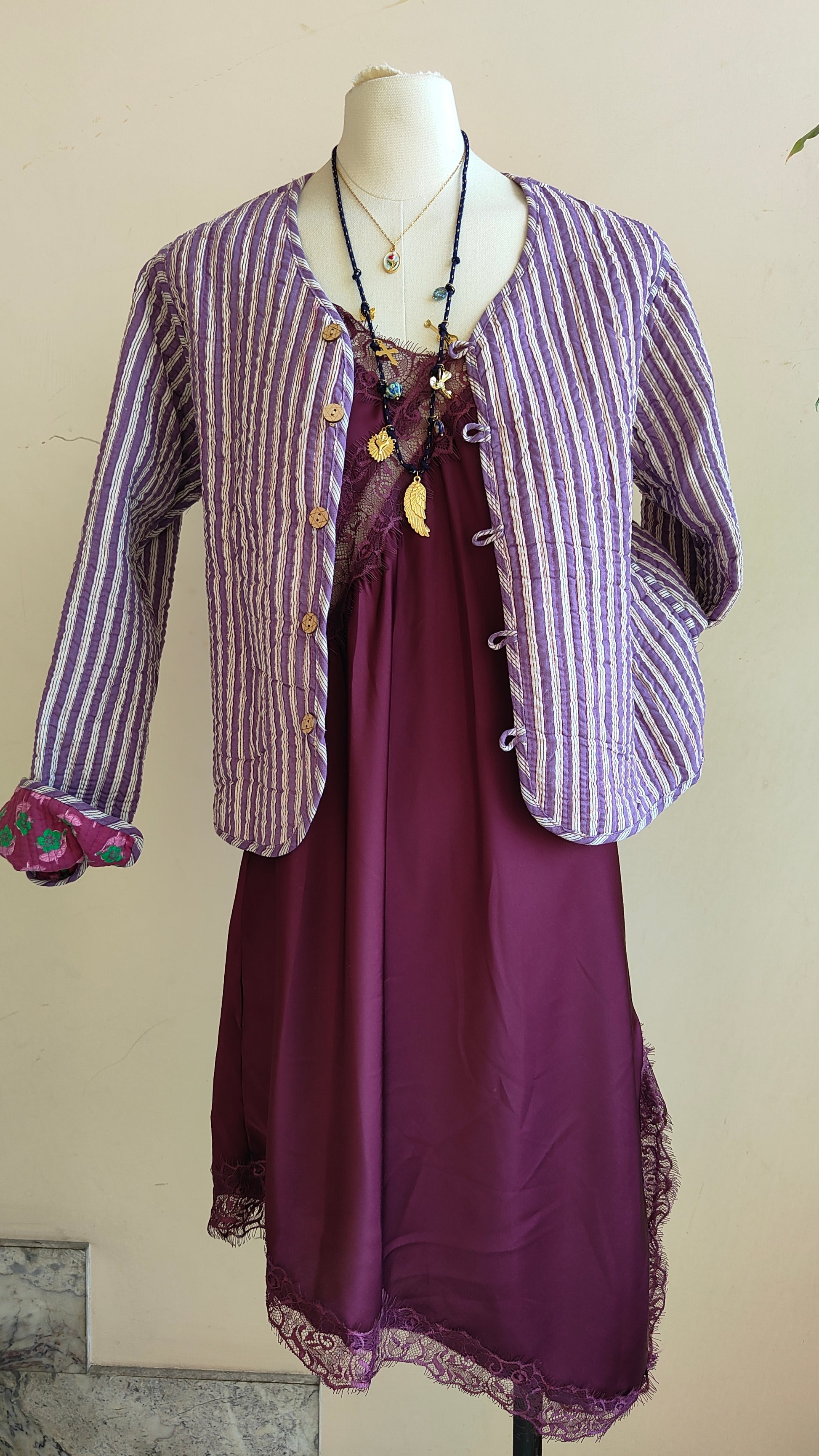 Una giacca che non passa inosservata, leggera, divertente e completamente reversibile. Funfair è il capo perfetto per chi ama cambiare stile con un gesto: da un lato una fantasia originale e giocosa con stampa effetto patch, dall’altro una base a righe più delicata e fresca.