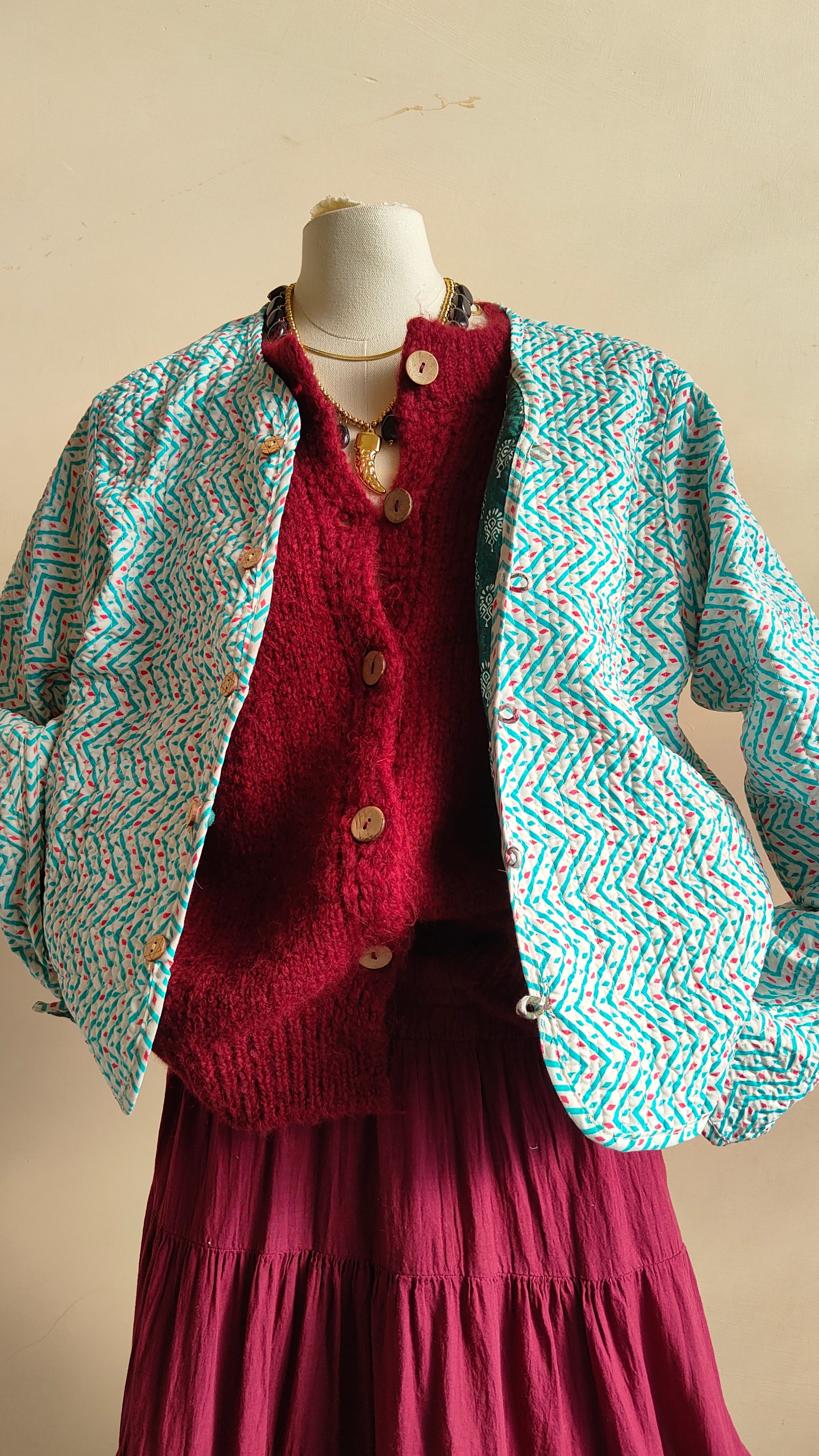 Una giacca che non passa inosservata, leggera, divertente e completamente reversibile. Funfair è il capo perfetto per chi ama cambiare stile con un gesto: da un lato una fantasia originale e giocosa con stampa effetto patch, dall’altro una base a righe più delicata e fresca.