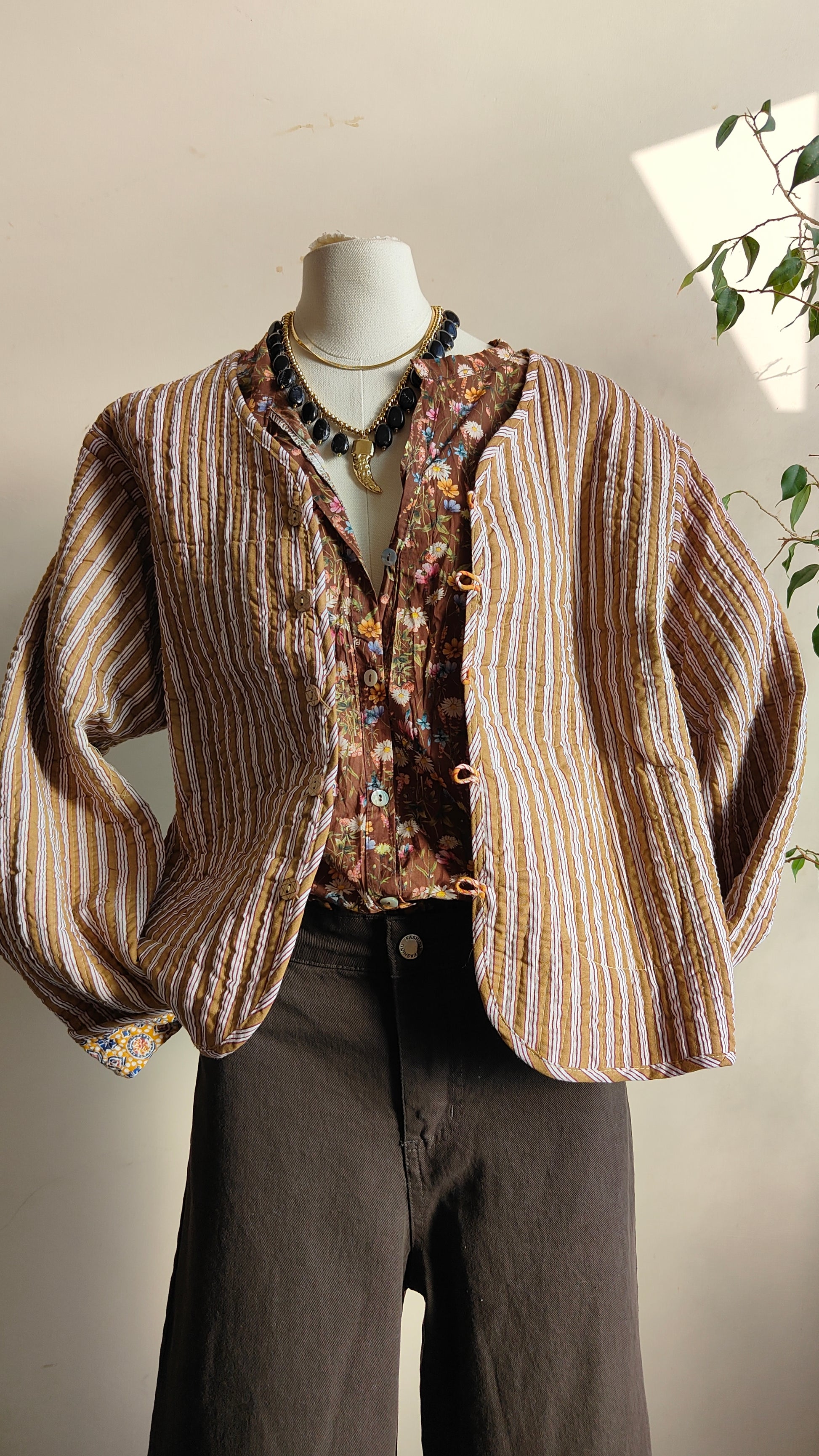 Una giacca che non passa inosservata, leggera, divertente e completamente reversibile. Funfair è il capo perfetto per chi ama cambiare stile con un gesto: da un lato una fantasia originale e giocosa con stampa effetto patch, dall’altro una base a righe più delicata e fresca.