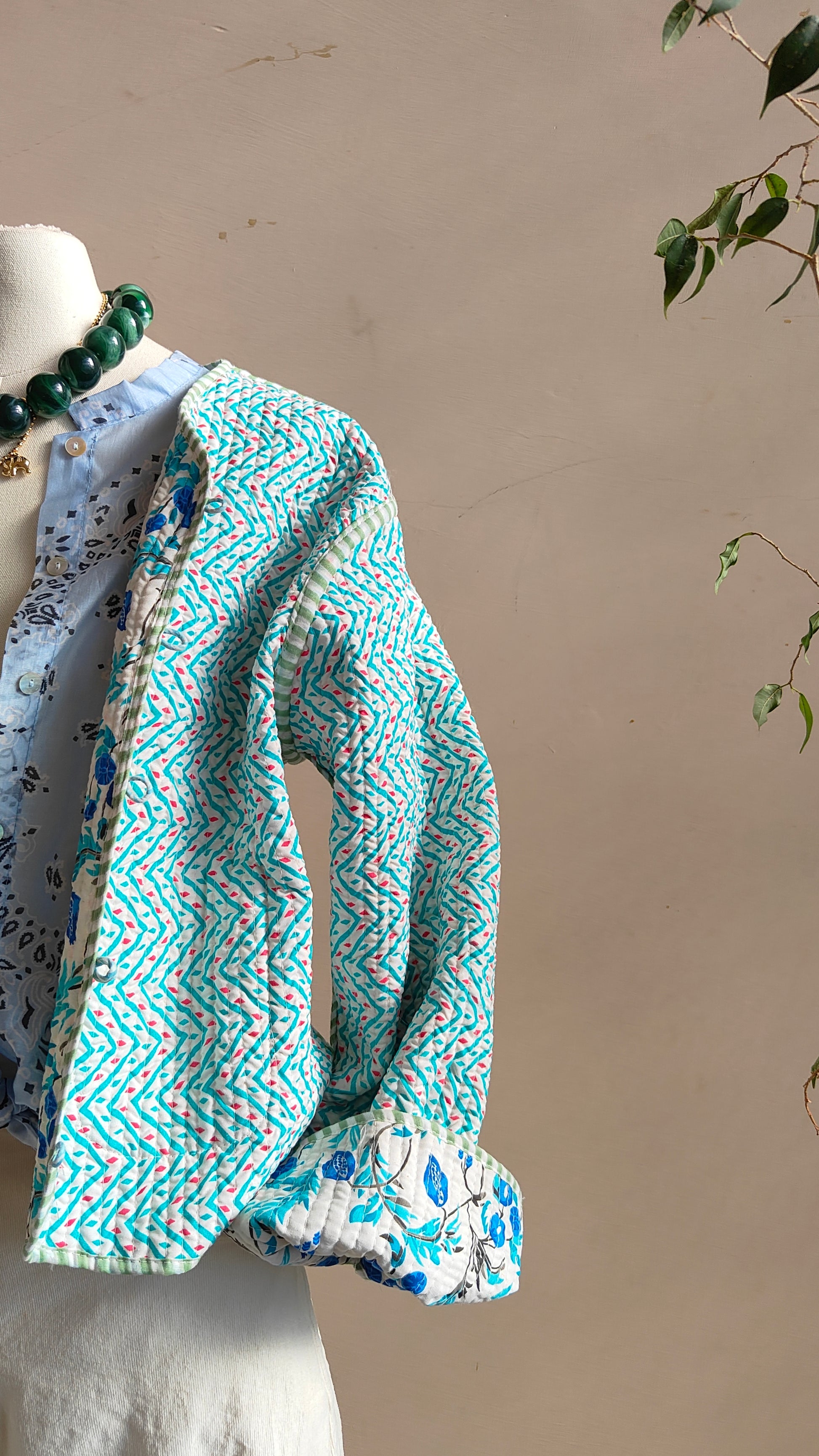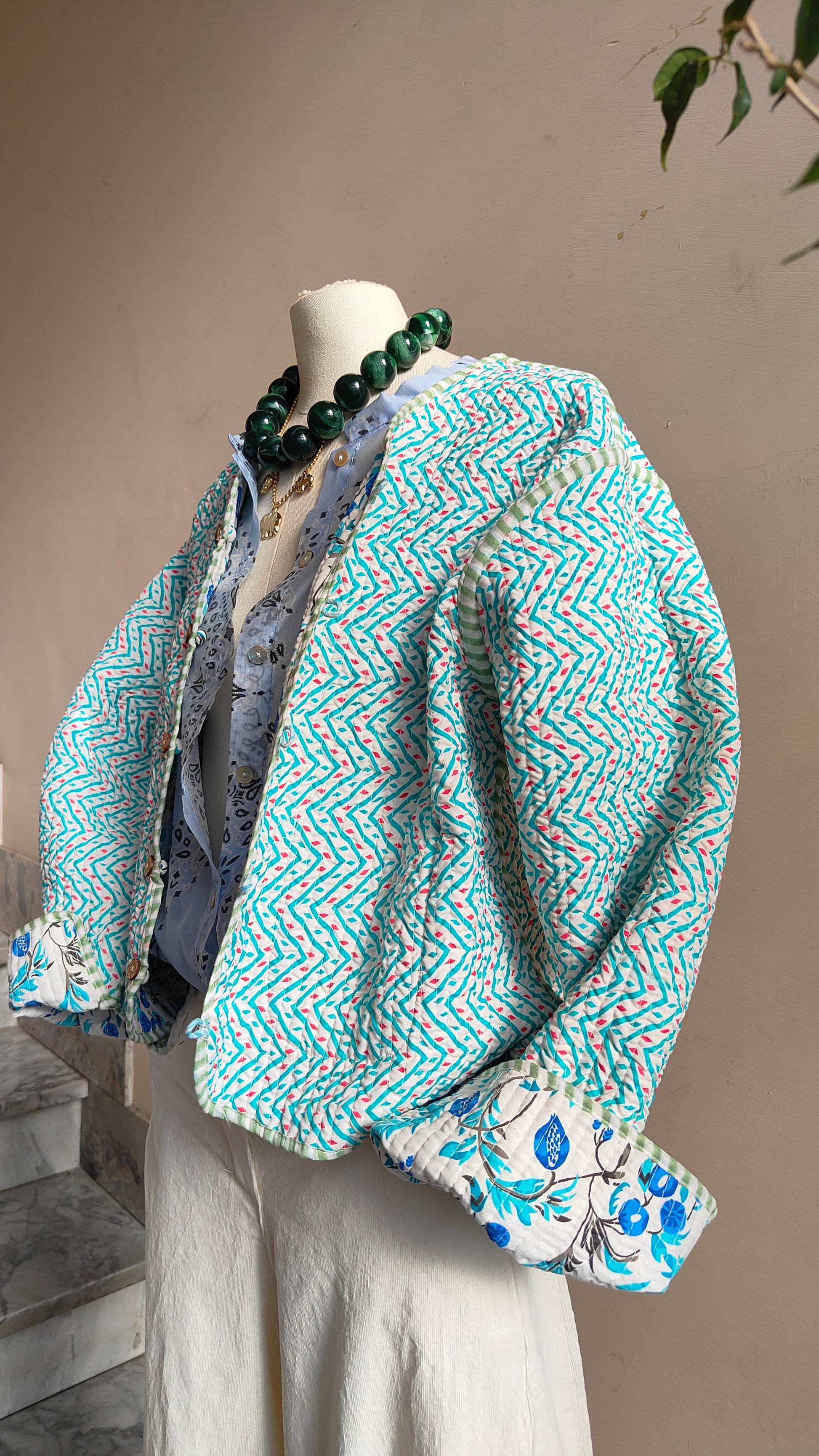 Una giacca che non passa inosservata, leggera, divertente e completamente reversibile. Funfair è il capo perfetto per chi ama cambiare stile con un gesto: da un lato una fantasia originale e giocosa con stampa effetto patch, dall’altro una base a righe più delicata e fresca.