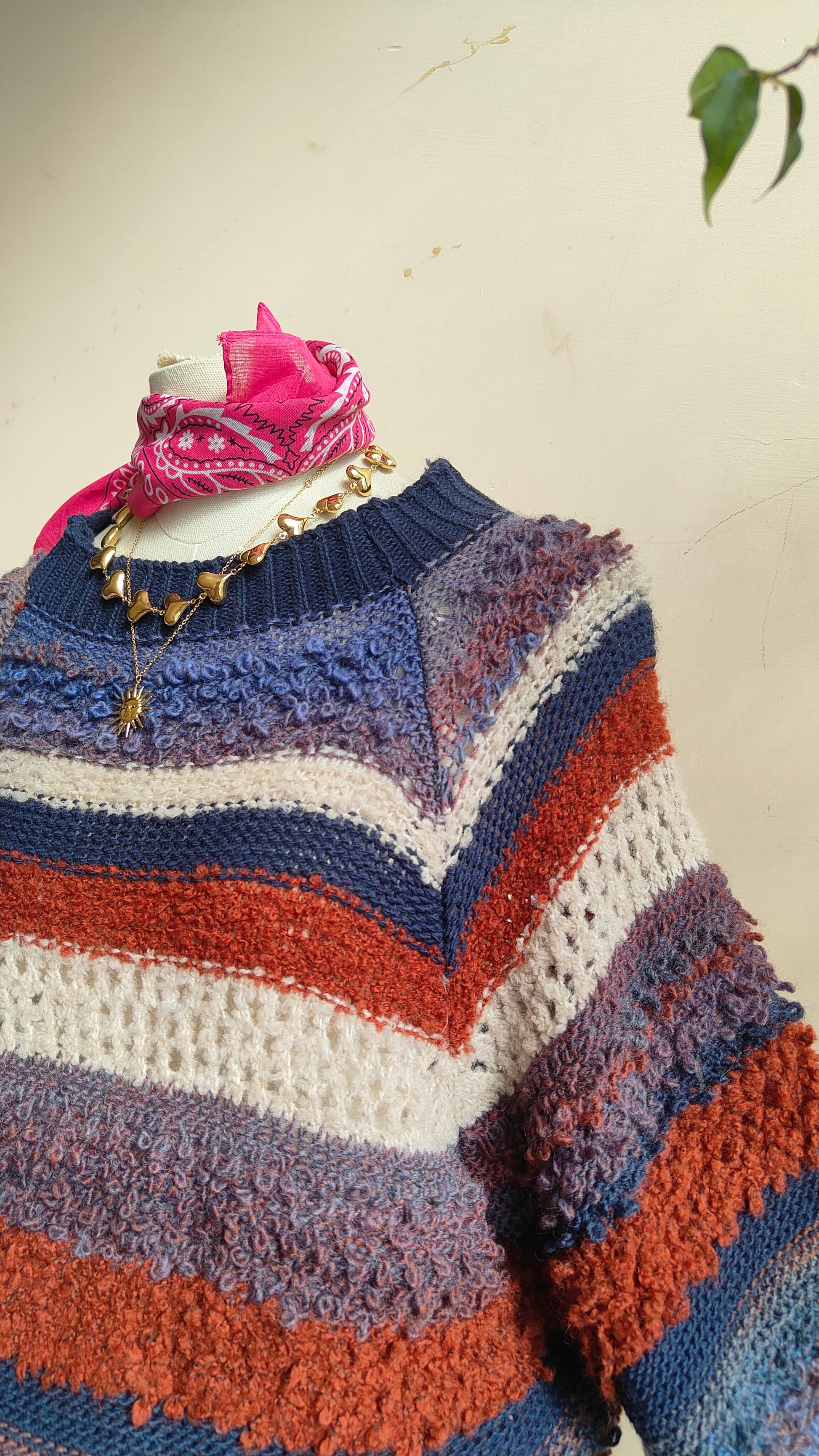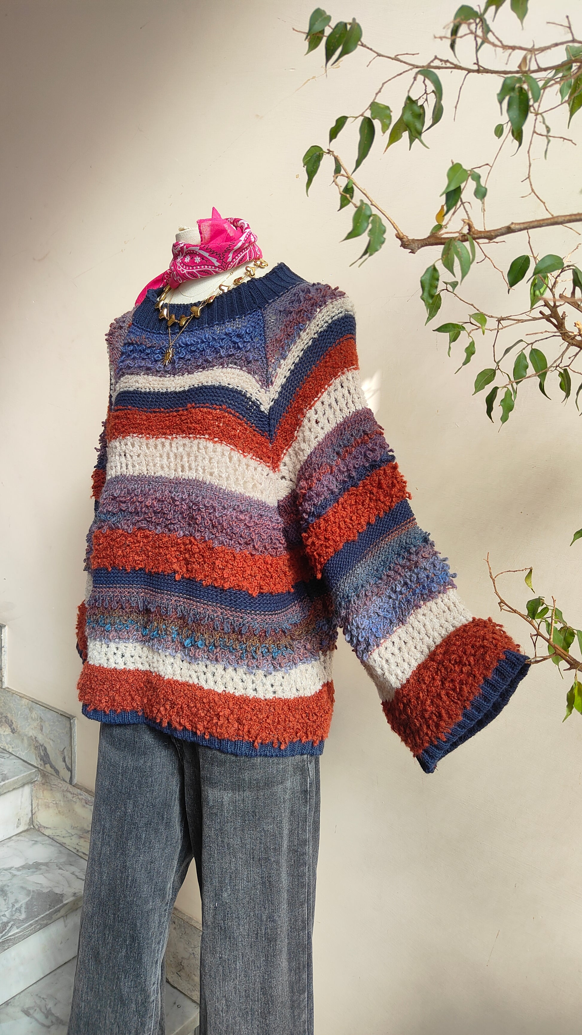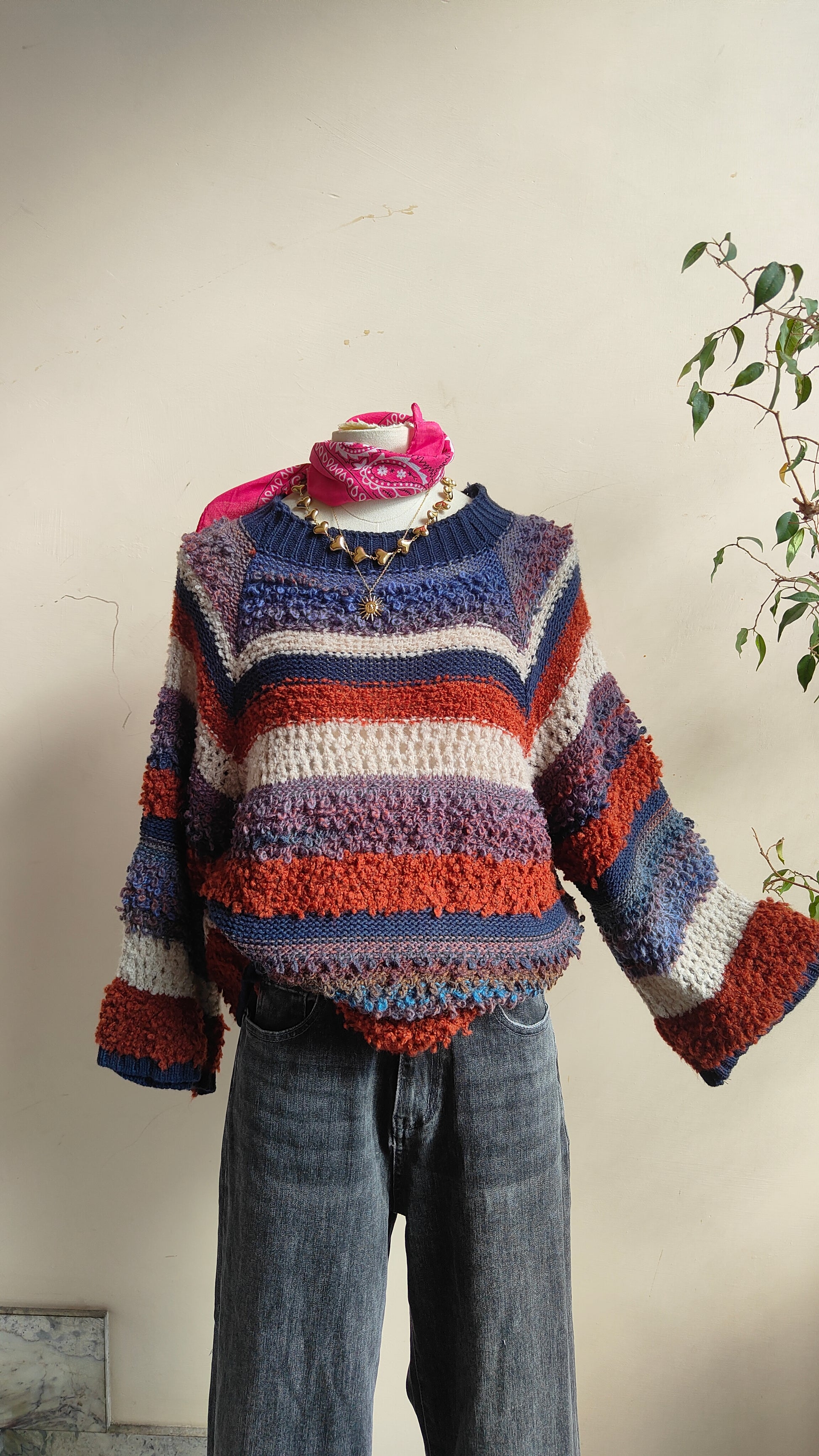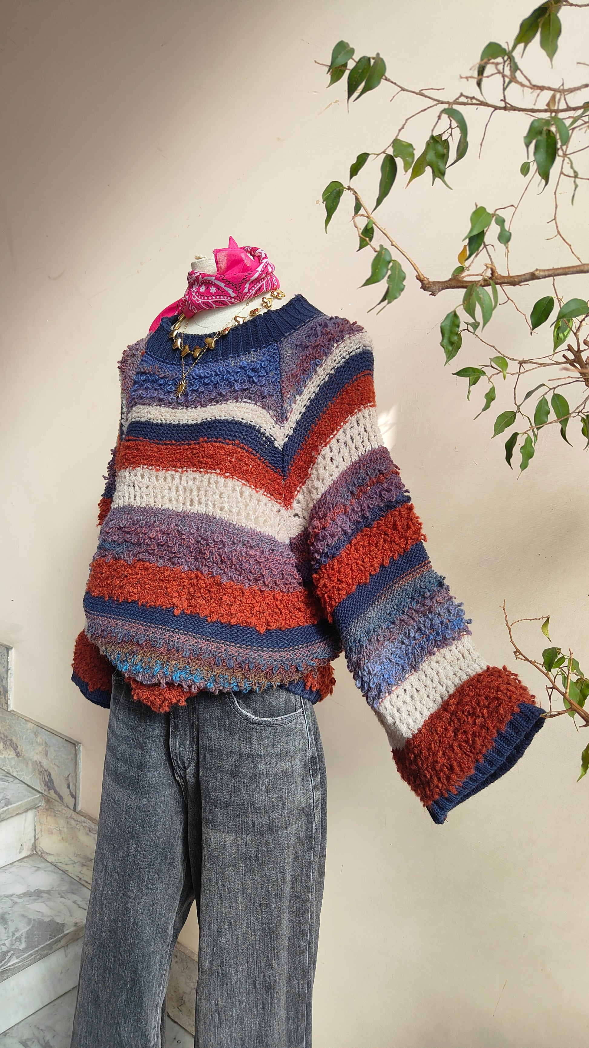 Un intreccio di colori speziati e texture ricercate per affrontare l’autunno con stile. Cacao Spice è il maglione che avvolge con morbidezza, grazie alla sua lavorazione grossolana e ai filati misti. Le righe a contrasto donano carattere senza rinunciare alla dolcezza, rendendolo perfetto da abbinare a jeans, gonne midi o pantaloni ampi.