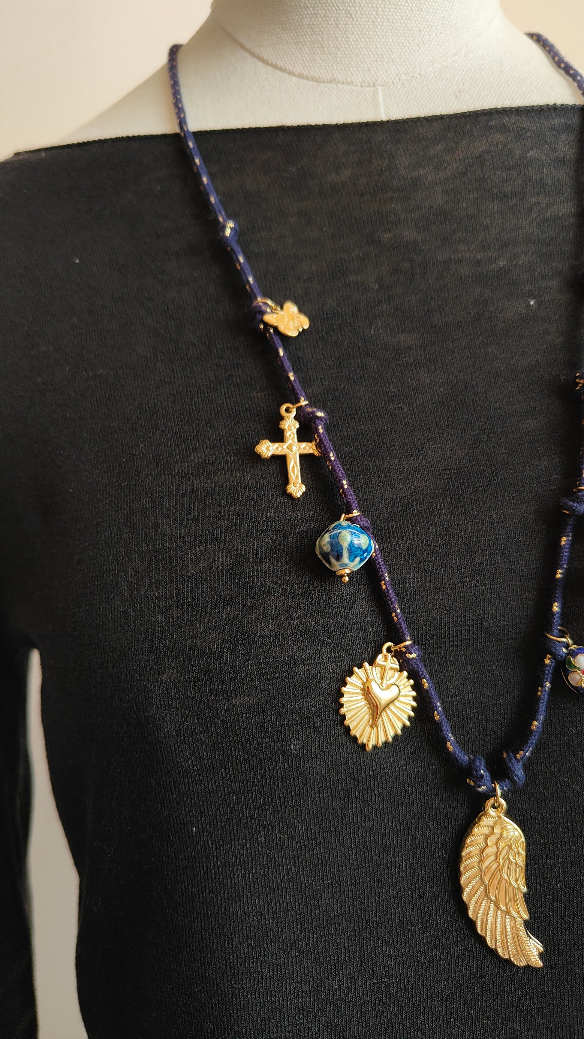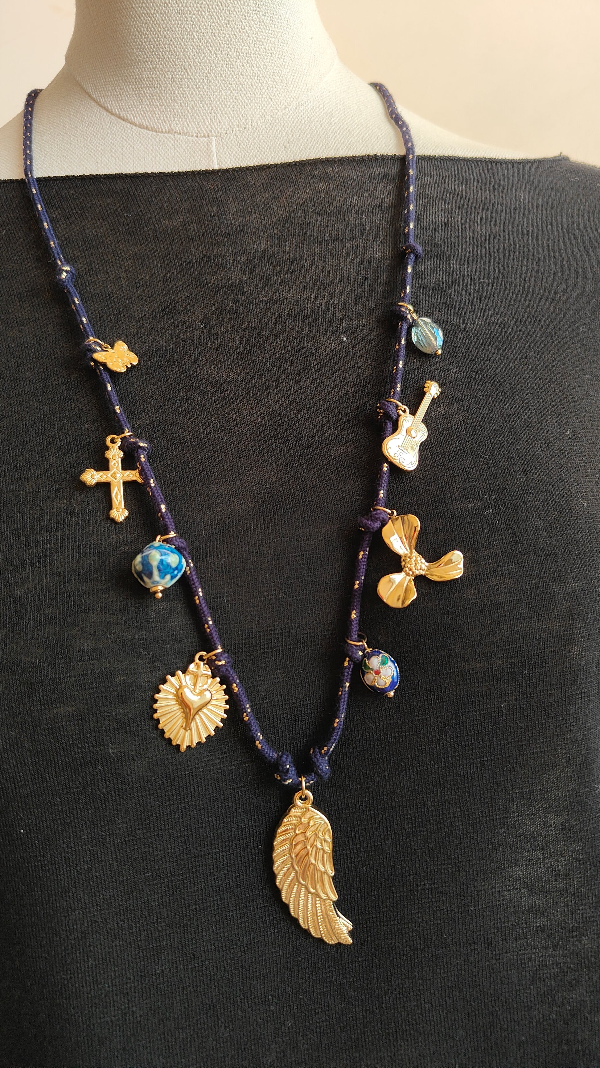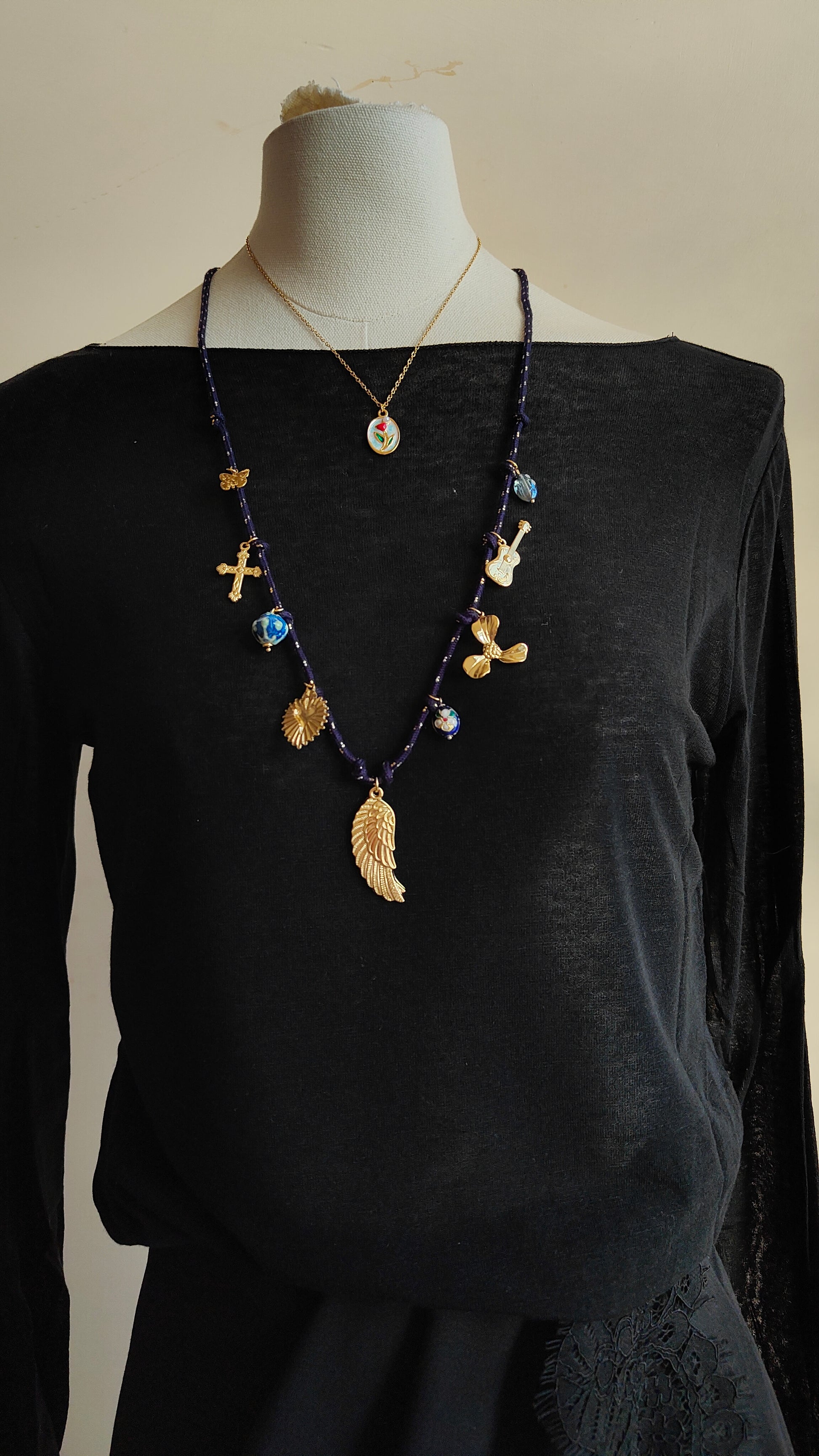 Descrizione: Un set luminoso e ricco di significato, composto da due collane vendute separatamente: – una collana corta con ciondolo smaltato floreale, delicata e raffinata, perfetta da sola o come base per abbinamenti; – una collana lunga con cordino cerato blu e charms dorati a tema simbolico (ala, cuore sacro, croce, strumenti e dettagli smaltati), per un tocco boho e spirituale.