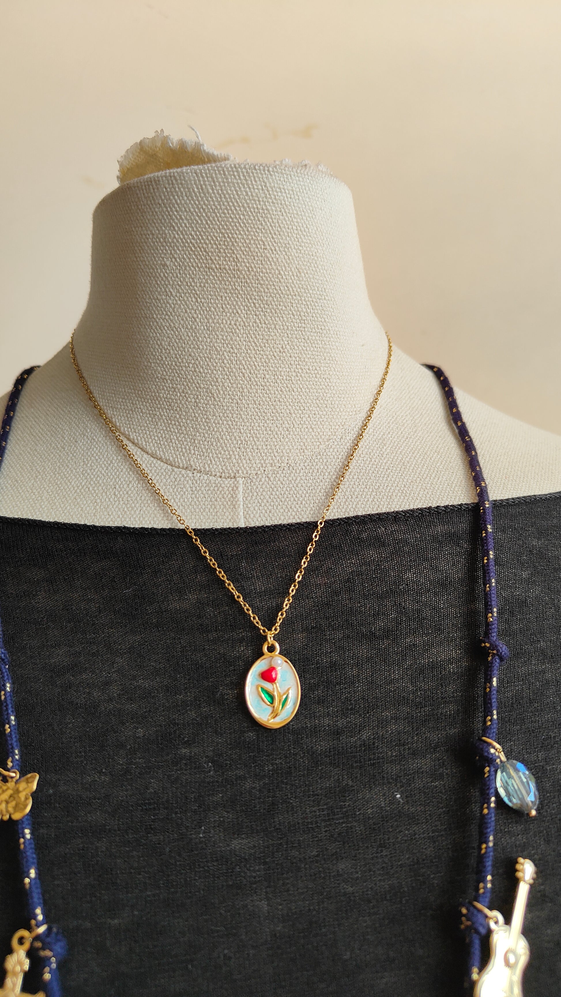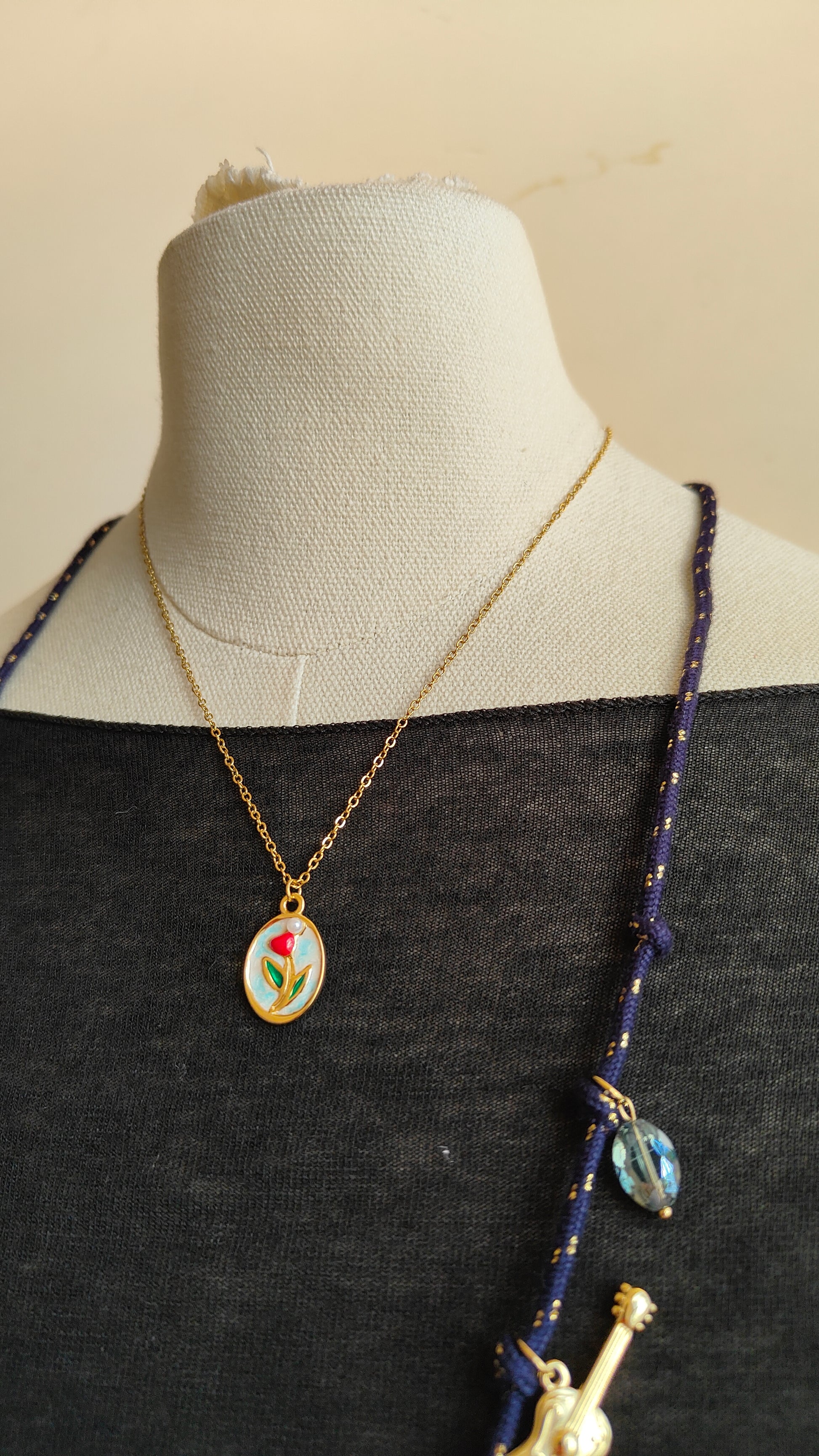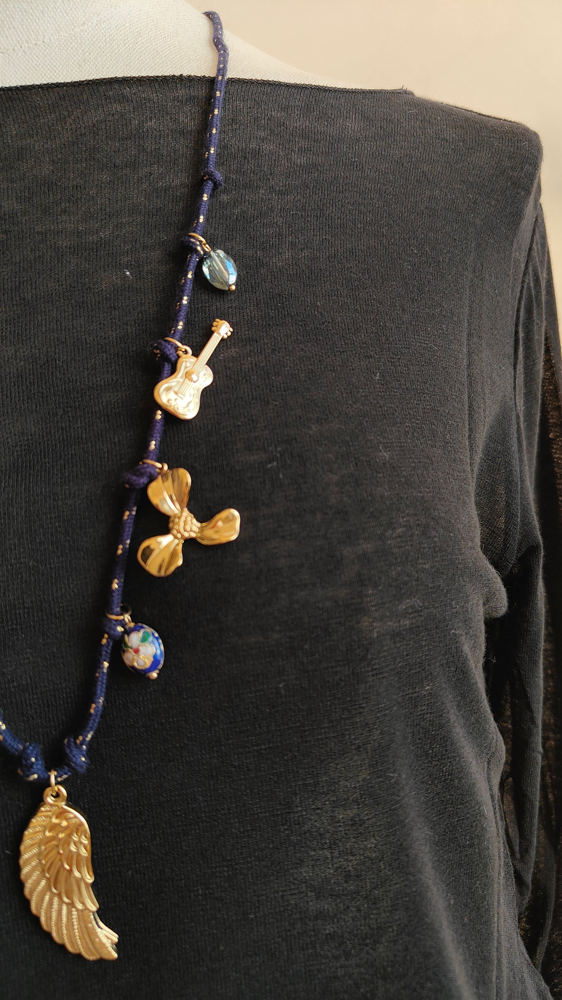 Descrizione: Un set luminoso e ricco di significato, composto da due collane vendute separatamente: – una collana corta con ciondolo smaltato floreale, delicata e raffinata, perfetta da sola o come base per abbinamenti; – una collana lunga con cordino cerato blu e charms dorati a tema simbolico (ala, cuore sacro, croce, strumenti e dettagli smaltati), per un tocco boho e spirituale.