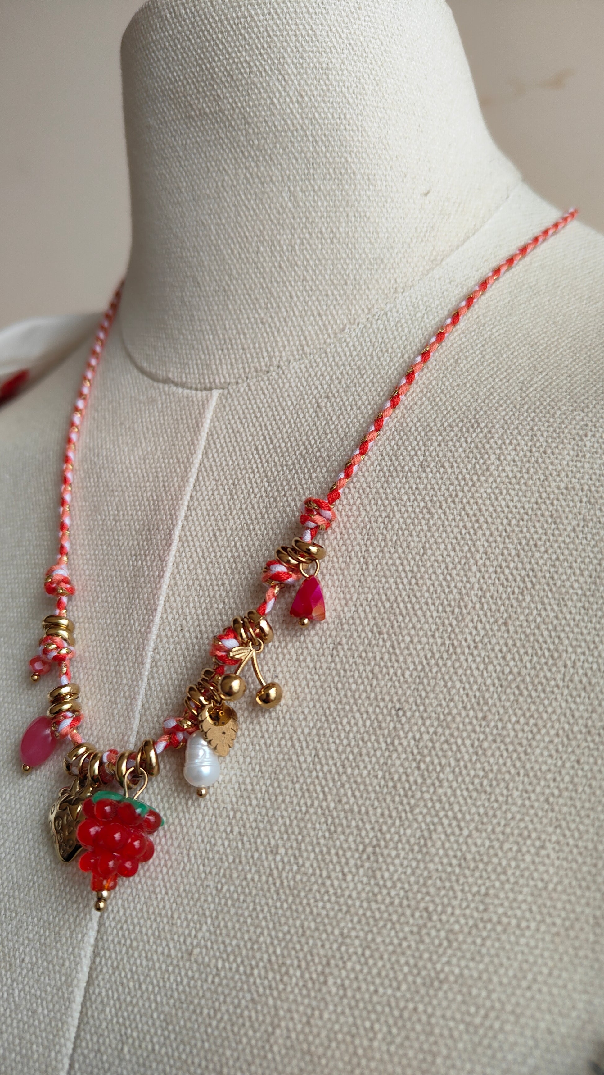 La prima collana presenta una catena in acciaio arricchita da piccoli charm decorativi che donano movimento e luce. La seconda collana è realizzata con cordino intrecciato e pendenti decorativi che creano un effetto più artigianale e contemporaneo.