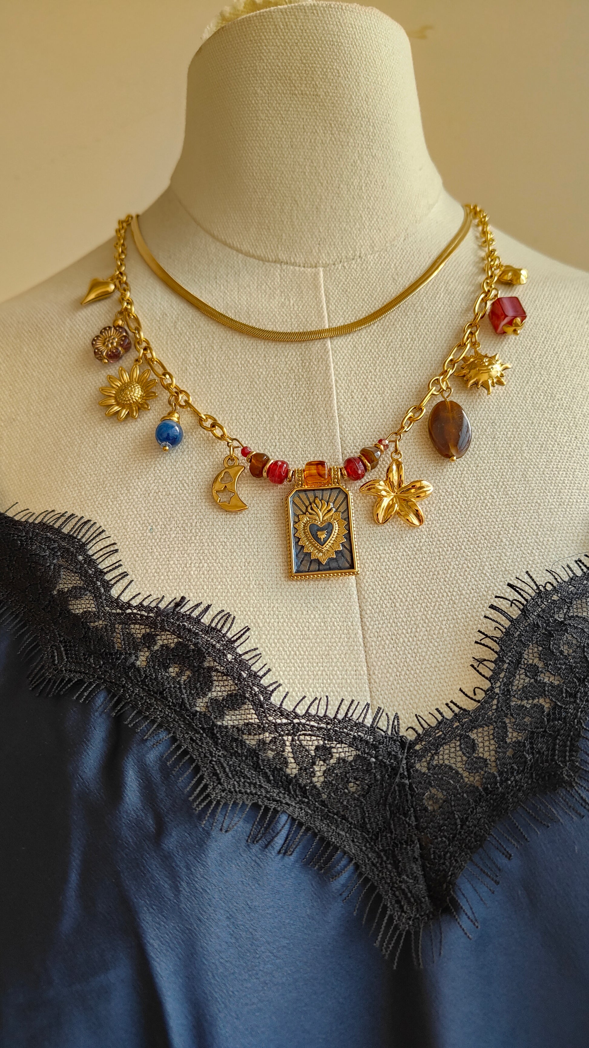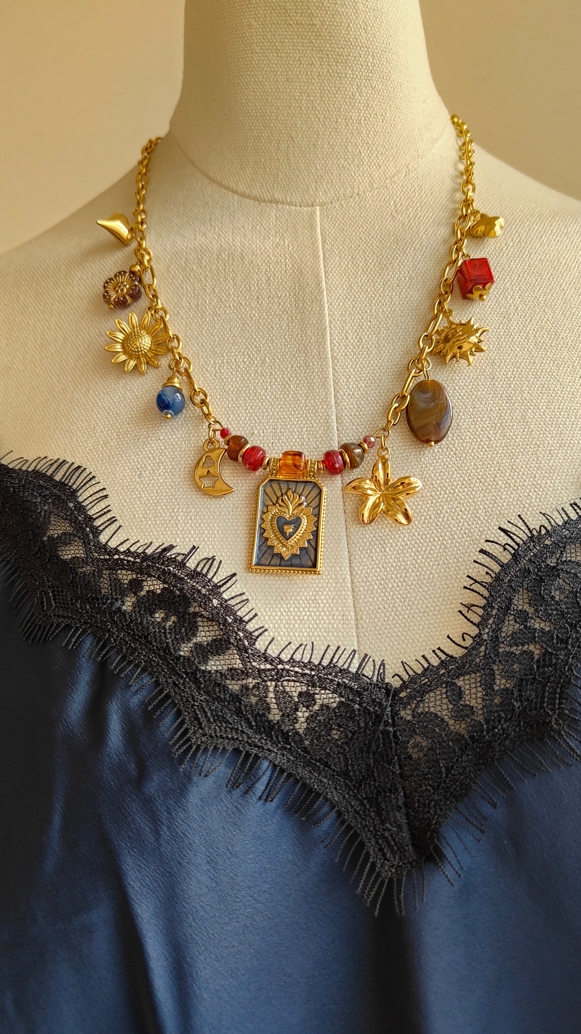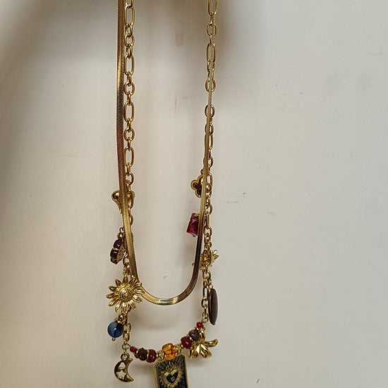 Collana Charms: catena in acciaio inox dorato arricchita da charms simbolici e pietre colorate, per uno stile unico e ricercato.