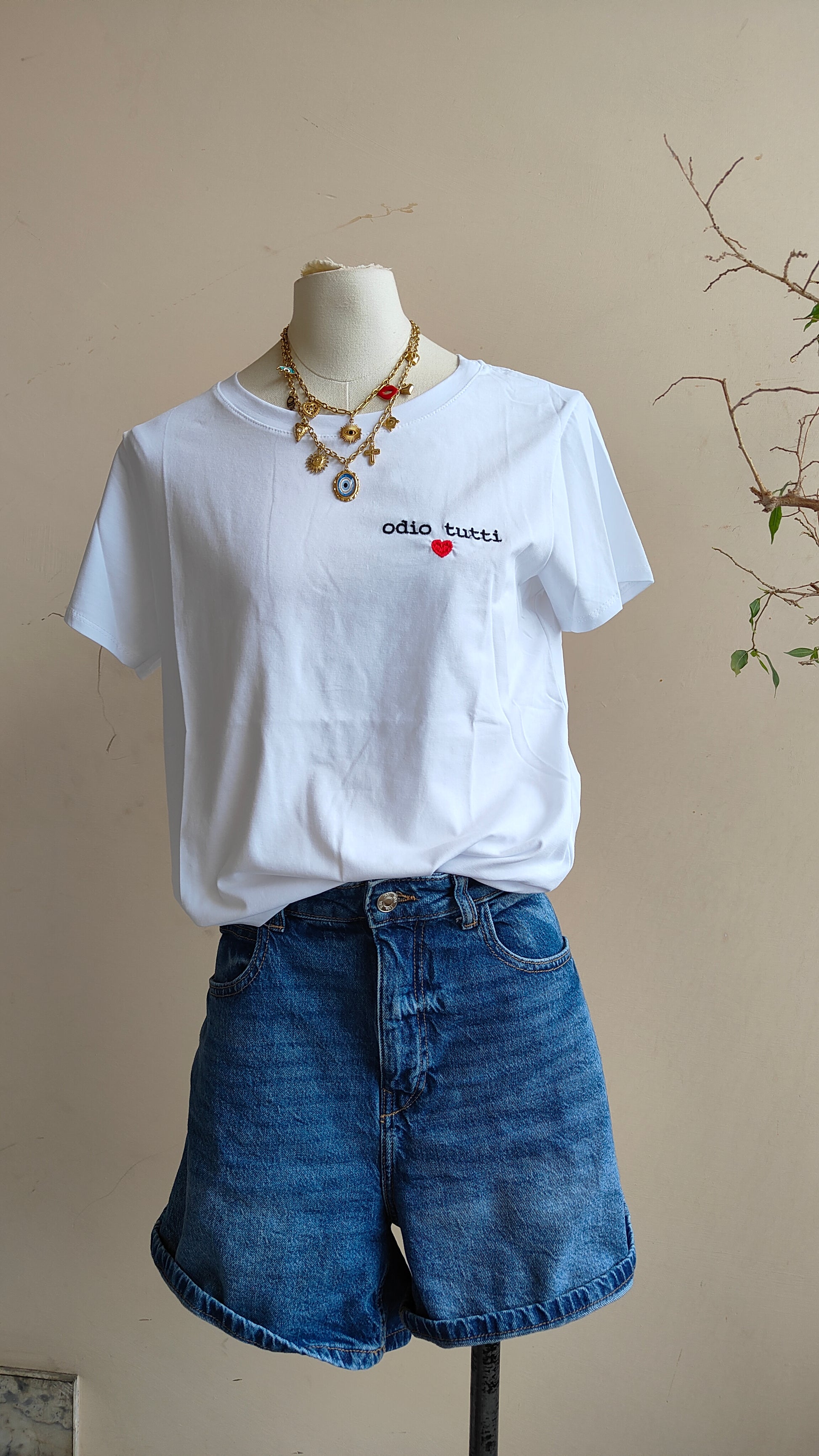 Una t-shirt minimal con un dettaglio ironico che non passa inosservato. Il piccolo ricamo frontale con la scritta “odio tutti” accompagnata da un cuore crea un contrasto divertente tra stile essenziale e personalità.
